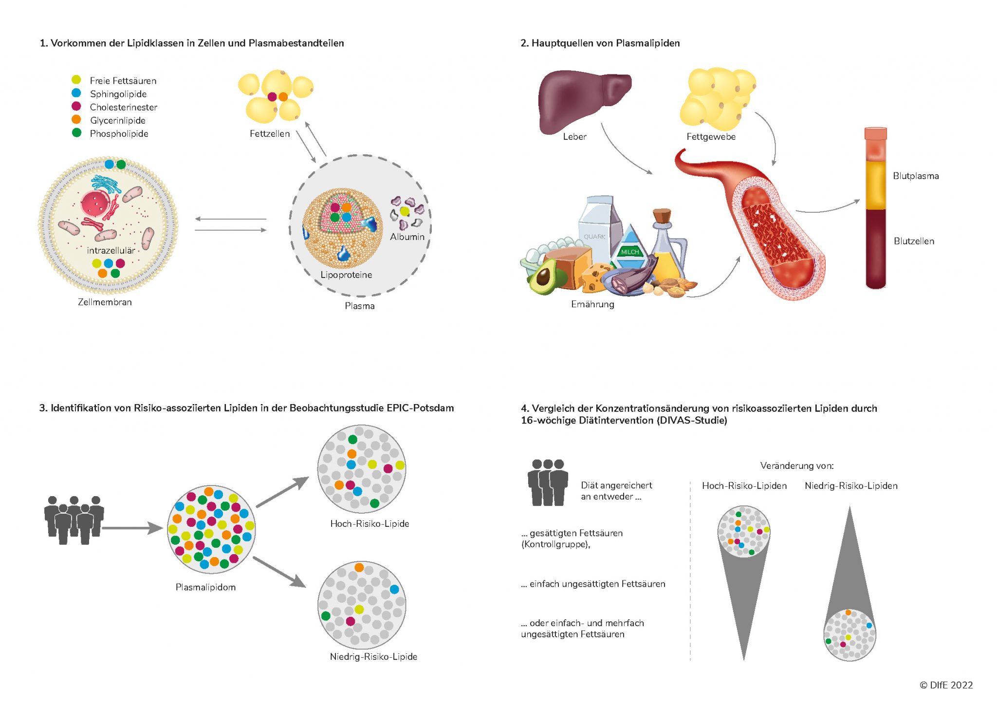 Lipidomik liefert neue Biomarker für Herz-Kreislauf-Erkrankungen und Typ-2-Diabetes25. April 2022 Erstautor Fabian Eichelmann, wissenschaftlicher Mitarbeiter der Abteilung Molekulare Epidemiologie am DIfE. Foto: ©Carolin Schrandt/DIfE Deutsche Forschende haben mithilfe der Lipidomik Lipide identifiziert, die statistisch mit Herz-Kreislauf-Erkrankungen und Typ-2-Diabetes assoziiert sind. Eine Diät mit erhöhtem Anteil ungesättigter Fettsäuren scheint ihnen zufolge zur Reduktion der risikoassoziierten Lipide und zur Steigerung der risikoarmen Lipide zu führen. Herz-Kreislauf-Erkrankungen sind mit rund 18 Millionen Todesfällen pro Jahr die häufigste Todesursache weltweit. Menschen mit Typ-2-Diabetes haben ein zwei- bis dreifach erhöhtes Risiko, einen Herzinfarkt oder Schlaganfall zu erleiden. Die Zahl der Betroffenen steigt seit Jahrzehnten kontinuierlich an. Schon jetzt leben in Deutschland über 8 Millionen Menschen mit Typ-2-Diabetes. Wissenschaftlichen Prognosen zufolge werden es im Jahr 2040 rund 12 Millionen sein. Entsprechend groß ist die Notwendigkeit, Biomarker zu identifizieren, die frühzeitig auf eine Krankheitsentstehung hinweisen können, um den Ausbruch verhindern oder zumindest abmildern zu können. Bisherige Studien haben gezeigt, dass Herz-Kreislauf-Erkrankungen und Typ-2-Diabetes eng mit dem Fettstoffwechsel verbunden sind. Um diese Zusammenhänge auf molekularer Ebene zu entschlüsseln, nutzen Wissenschaftlerinnen und Wissenschaftler seit einigen Jahren die Lipidomik. Dabei handelt es sich um eine moderne analytische Methode, die sehr detaillierte Einblicke in die Fettsäureprofile im Blutplasma ermöglicht. 69 Lipide mit Erkrankungsrisiken assoziiert Dr. Fabian Eichelmann, wissenschaftlicher Mitarbeiter der Abteilung Molekulare Epidemiologie am Deutschen Institut für Ernährungsforschung (DIfE) und Wissenschaftler des Deutschen Zentrums für Diabetesforschung (DZD), untersuchte mit seinem Team die Fettsäureprofile in 2414 Blutproben aus der EPIC-Potsdam-Studie. Die Proben wurden bereits in den 1990er Jahren entnommen und stammen unter anderem von Teilnehmenden, die in den Folgejahren eine Herz-Kreislauf-Erkrankung oder einen Typ-2-Diabetes entwickelt haben. Mittels Hochdurchsatz-Lipidomik bestimmten die Forschenden insgesamt 282 verschiedene Lipide, von denen 69 mit mindestens einer der beiden Erkrankungen assoziiert waren. „Ein statistischer Zusammenhang mit Herz-Kreislauf-Erkrankungen zeigte sich bei 49 Lipiden, die hauptsächlich zu den Cholesterinestern und Sphingolipiden zählten“, sagt Eichelmann. „Mit Typ-2-Diabetes waren 12 Lipide assoziiert, wobei es sich mehrheitlich um Glycerin- und Phospholipide handelte. Ein Zusammenhang mit beiden Erkrankungen ließ sich bei 8 Lipiden erkennen, unter denen mehrere Monoacylglyceride hervorstachen.“ Auf molekularer Ebene stellten die Forschenden fest, dass Lipide mit höherem Risiko dazu tendierten, hauptsächlich gesättigte Fettsäuren zu enthalten, insbesondere Palmitinsäure. Ernährungsumstellung zeigt Wirkung Im zweiten Teil ihrer Untersuchungen wollten die Wissenschaftlerinnen und Wissenschaftler herausfinden, ob sich die risikoassoziierten Lipide durch eine veränderte Fettsäurezusammensetzung der Ernährung beeinflussen lassen. Eine 16-wöchige Interventionsstudie, die von den Kooperationspartnern an der University of Reading in England durchgeführt wurde, sollte Antworten liefern. Das Team um Julie Lovegrove rekrutierte 113 gesunde Frauen und Männer im Alter von 21 bis 60 Jahren und teilte sie zufällig in drei Gruppen ein. Die erste Gruppe erhielt eine Diät mit einem erhöhten Anteil gesättigter Fettsäuren. Für die zweite Gruppe gab es eine Diät, die reich an einfach ungesättigten Fettsäuren war. Und die dritte Gruppe bekam eine Diät mit einem hohen Anteil an einfach und mehrfach ungesättigten Fettsäuren. Die Diäten waren so konzipiert, dass die Gesamtenergieaufnahme in allen drei Gruppen gleich war, damit die Teilnehmenden weder Gewicht zu- noch abnahmen. Zu Beginn der Studie und vier Monate später erfolgte eine Blutabnahme, sodass die Forschenden die Fettsäureprofile im Blutplasma der Teilnehmenden bestimmen und vergleichen konnten. „Wir stellten fest, dass die Diäten mit einem erhöhten Anteil ungesättigter Fettsäuren im Vergleich zur Diät mit erhöhtem Anteil gesättigter Fettsäuren für eine Verringerung der risikoassoziierten Lipide und gleichzeitig für eine Steigerung der risikoarmen Lipide sorgten“, fasst Lovegrove zusammen. Graphischer Überblick zur Studie. Quelle: DIfE Die Ergebnisse stützen die gängige Empfehlung, dass der Austausch gesättigter durch ungesättigte Fettsäuren in der Ernährung ein potenzielles Instrument für die Prävention von Herz-Kreislauf-Erkrankungen und Typ-2-Diabetes ist. „Die identifizierten Lipide könnten als Biomarker für ein erhöhtes Risiko dienen. Zukünftige Risikovorhersage-Modelle könnten darauf aufbauen“, sagt Prof. Matthias Schulze, Leiter der Abteilung Molekulare Epidemiologie und der EPIC-Potsdam-Studie am DIfE. Im nächsten Schritt wollen die Forschenden einen Lipidomik-Fingerabdruck im Blut identifizieren, der die Effekte einer Test-Diät abbildet und überprüfen, ob dieser mit dem Langzeitrisiko für Herz-Kreislauf-Erkrankungen assoziiert ist. Die Ergebnisse der aktuellen Studie wurden jüngst im Fachmagazin „Circulation“ publiziert.