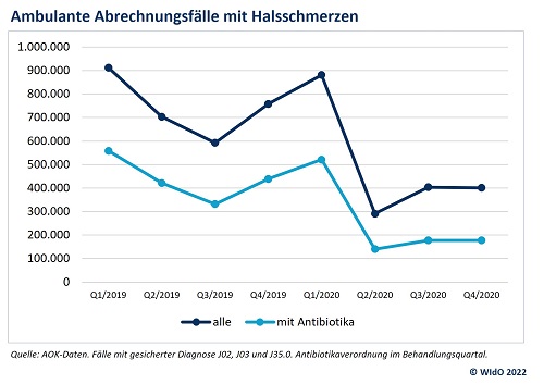 Mandeloperationen: Corona-Pandemie ließ Fallzahlen deutlich und dauerhaft sinken26. April 2022 Mandelentfernungen vor, während und nach dem ersten Corona-Lockdown (Grafik: WIdO). Die Zahl der Mandel-OPs in Deutschland ist während der Pandemie stark zurückgegangen, besonders drastisch mit bis zu 82 Prozent im Frühjahr 2020. Auch danach blieben die Fallzahlen saisonbereinigt je nach Art der OP um 18 bis 39 Prozent unter dem vorpandemischen Niveau. Eine Zunahme von Notfalleingriffen war laut aktueller Analyse des Wissenschaftlichen Instituts der AOK (WIdO) nicht festzustellen. Die WIdO-Analyse wurde im medizinischen Fachjournal „European Archives of Oto-Rhino-Laryngology“ veröffentlicht. Ausgewertet wurden die Krankenhauseinweisungen aller Patientinnen und Patienten in Deutschland zwischen Januar 2019 und September 2021 sowie ambulante Versorgungsdaten von AOK-Versicherten der Jahre 2019 und 2020. Während zwischen Januar 2019 und 15. März 2020 durchschnittlich 556,1 Mandelentfernungen je Woche durchgeführt wurden, sank die Zahl im ersten Lockdown vom 16. März bis 3. Mai 2020, als Kliniken aufgerufen waren, planbare Operationen zu verschieben, auf 110,7 Eingriffe je Woche. Auch nach der Lockerung der Corona-Beschränkungen im Sommer 2020 wurde das Niveau der Operationshäufigkeit vor Corona nicht mehr erreicht. Hier pegelten sich die Zahlen der operativen Entfernung der Gaumenmandeln auf 326,0 Fälle je Woche ein. Besonders deutlich fiel der Rückgang bei Kindern und Jugendlichen zwischen 10 und 17 Jahren aus. Vor der Pandemie gab es in dieser Altersgruppe noch 70,5 Operationen in der Woche, nach dem ersten Lockdown mit 34,8 je Woche nur noch knapp halb so viele. Insgesamt wurden für die Studie 144.069 stationäre Fälle mit einer Mandeloperation eingeschlossen. Weniger Notfalleingriffe bei Komplikationen „Auffällig ist, dass wir nicht nur einen deutlichen Rückgang der Fallzahlen bei den planbaren operativen Mandelentfernungen festgestellt haben, sondern auch, dass sich Behandlungen akuter Mandelentzündungen mit Antibiotika und Notfalleingriffe signifikant verringert haben“, so Studienautor Christian Günster, Leiter des Bereichs Qualitäts- und Versorgungsforschung im WIdO. Dies spiegelt sich laut Analyse in den Fallzahlen bei den Behandlungen aufgrund von Abszessen an den Gaumenmandeln wider. Ein Abszess kann zwischen der Gaumenmandel und ihrer Kapsel entstehen, zum Beispiel als Komplikation einer eitrigen Mandelentzündung (Tonsillitis). Bei kleineren Abszessen wird meist ausschließlich medikamentös mit Antibiotika behandelt. Sehr weit fortgeschrittene Abszesse, die begleitende Verschlechterungen des Allgemeinzustandes verursachen, müssen operativ entfernt werden. Während vor der Pandemie noch 165,3 Abszesse wöchentlich operiert wurden, sank die Zahl nach dem ersten Lockdown auf 98,1 Fälle in der Woche. Bei Kindern und Jugendlichen zwischen 10 und 17 Jahre halbierte sich die Zahl dieser Eingriffe aufgrund Abszessbildung von 15,0 auf 7,4 Fälle wöchentlich. Ambulante Abrechnungsfälle mit Halsschmerzbehandlungen (Grafik: WIdO) Ärzte wurden seltener konsultiert Im Rahmen der Studie wurden auch die ambulanten Behandlungen von Halsschmerzen bei AOK-Versicherten ausgewertet. Deren Anzahl ging von 2,97 Millionen im Jahr 2019 um ein Drittel auf 1,98 Millionen im Jahr 2020 zurück. Nicht nur die Gesamtzahl reduzierte sich, sondern auch die Zahl der Halsschmerzbehandlungen mit Antibiotikaverordnung. Dieser Rückgang war 2020 bei Kindern und Jugendlichen am stärksten. Wie bei den Operationen zeigten sich die größten Rückgänge zu Pandemiebeginn. Die Zahl der Halsschmerzbehandlungen mit Antibiotika brach im zweiten Quartal 2020 gegenüber dem Vorjahresquartal um 67 Prozent ein. „Die AHA-Regeln während der Pandemie dürften das Auftreten von Mandelentzündungen reduziert haben, die in der Regel Anlass für die Tonsillektomie sind. Die Hygieneregeln stellen deshalb ein wirksames Instrument gegen die Verbreitung von Erkältungskrankheiten ganz unabhängig von der Pandemie dar“, sagt Günster. Ein weiterer Grund für die rückläufigen Behandlungszahlen könne sein, „dass Patientinnen und Patienten ihren Behandlungsbedarf niedriger priorisiert haben“, so Günster. Insbesondere Kinderärztinnen und -ärzte wurden seltener aufgesucht. Fallzahlen weiter beobachten Die Zahl der Mandeloperationen in Deutschland nimmt seit Jahren ab. Dieser Trend hat sich nun während der Pandemie deutlich verstärkt, ohne dass Notfalleingriffe zunahmen. In einer früheren Studie hatten die Autoren bereits festgestellt, dass die Daten der ambulanten Vorbehandlung vor der Mandelentfernung bei Halsschmerzen häufig im Widerspruch zu der Diagnose einer „chronischen“ Mandelentzündung stehen. Laut Leitlinienempfehlung spielt der Eingriff als Therapieoption erst eine Rolle, wenn sich mindestens drei antibiotikumpflichtige Mandelentzündungen in zwölf Monaten ereignet hatten. „Möglicherweise sind im Zuge der Pandemie teilweise auch unnötige Operationen entfallen. Die vollständige Rückkehr zum vorpandemischen Fallzahlniveau wäre daher nicht sinnvoll“, sagt Günster. „Wir werden die Fallzahlen und die Umsetzung der Leitlinienempfehlung auch nach der Pandemie weiter beobachten.“