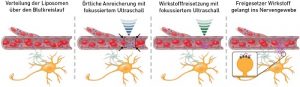 Medikamente millimetergenau ins Gehirn bringen8. Oktober 2020 Foto: ©jolygon – stock.adobe.com Fokussierte Ultraschallwellen helfen ETH-Forschenden, Medikamente im Gehirn punktgenau zu platzieren, also nur dort, wo ihre Wirkung erwünscht ist. Die Methode soll künftig psychiatrische, neurologische und onkologische Behandlungen mit weniger Nebenwirkungen ermöglichen. Forschende der ETH Zürich haben eine Methode entwickelt, mit der Medikamente im Hirn punktgenau freigesetzt werden können. Damit könnte es in Zukunft möglich werden, Psychopharmaka, Chemotherapeutika und andere Medikamente nur in jene Hirnregionen zu bringen, wo das aus medizinischen Gründen gewünscht ist. Heute ist das praktisch nicht möglich – Medikamente gelangen über das Blut in das ganze Gehirn und den ganzen Körper, was in einigen Fällen die Ursache für Nebenwirkungen ist. Die neue Methode ist nicht invasiv – die präzise Medikamentenfreisetzung im Gehirn wird von außerhalb des Kopfs mit Ultraschall gesteuert. Dies berichten die Wissenschaftler unter der Leitung von Mehmet Fatih Yanik, Professor für Neurotechnologie, in der Fachzeitschrift “Nature Communications”. Um zu verhindern, dass ein Wirkstoff seine Aktivität im ganzen Körper und im ganzen Gehirn entfalten kann, werden bei der neuen Methode spezielle Träger eingesetzt, die ihn in kugelförmige Lipidbläschen einpacken, die an gashaltigen, ultraschall-empfindlichen Mikrobläschen befestigt sind. Diese werden ins Blut injiziert und gelangen so ins Gehirn. In einem zweistufigen Prozess nutzen die Wissenschaftler anschließend fokussierten Ultraschall. Fokussierter Ultraschall kommt bereits heute in der Krebsmedizin zum Einsatz, um Krebsgewebe an genau definierten Punkten im Gewebe zu zerstören. Bei der neuen Anwendung arbeiten die Wissenschaftler allerdings mit weit geringerer Energie, welche das Gewebe nicht schädigt. Medikamente mit Schall anreichern In einem ersten Schritt reichern die Wissenschaftler mit Ultraschallwellen niedriger Energie am gewünschten Ort im Gehirn die Wirkstoffträger an. “Man kann sich das so vorstellen, dass wir mit Ultraschallpulsen am gewünschten Ort eine Art virtuellen Schallwellen-Käfig erstellen. Von der Blutzirkulation angetrieben, werden die Wirkstoffträger durch das ganze Gehirn gespült. Jene, die in den Käfig gelangen, finden dort aber nicht mehr hinaus”, erklärt Yanik. In einem zweiten Schritt bringen die Forschenden an diesem Ort die Wirkstoffträger mit höherer Ultraschall-Energie zum Vibrieren. Reibungskräfte zerstören die Außenmembran der Behälter, der Wirkstoff wird freigesetzt und an dieser Stelle vom Nervengewebe aufgenommen. Schema des zweistufigen Verfahrens zur Anreicherung und schliesslich lokalen Freisetzung eingekapselter Wirkstoffe. (Quelle: Ozdas et al. Nature Communications 2020, angepasst) Die Forschenden haben die Wirksamkeit der neuen Methode in Versuchen bei Ratten gezeigt. Sie kapselten dazu einen Neurohemmstoff in den Wirkstoffträgern ein. Damit ist es ihnen gelungen, ein spezifisches neuronales Netzwerk zu blockieren, das zwei Hirnareale miteinander verbindet. Die Wissenschaftler konnten in den Versuchen zeigen, dass nur spezifisch dieser eine Teil des Netzwerks blockiert wurde und das Medikament nicht im ganzen Gehirn wirkte. Effizientere Medikamentenverabreichung “Weil wir mit unserer Methode Medikamente dort im Körper anreichern können, wo ihre Wirkung erwünscht ist, reicht eine sehr viel geringere Dosis aus”, sagt Yanik. Für ihr Experiment in Ratten benötigten sie beispielsweise 1300-mal weniger Wirkstoff als es herkömmlicherweise nötig wäre. Schon früher haben andere Wissenschaftler versucht, mit fokussiertem Ultraschall die Zufuhr von Medikamenten in bestimmte Hirnregionen zu verbessern. In jenen Ansätzen wurden die Wirkstoffe jedoch nicht lokal angereichert, sondern man schädigte die Blutgefäße lokal, um damit den Wirkstofftransport vom Blut ins Nervengewebe zu erhöhen. Dieser Ansatz kann langfristig jedoch schädliche Folgen haben. “In unserem Ansatz bleibt die physiologische Barriere von Blutkreislauf und Nervengewebe hingegen intakt”, sagt Yanik. Zurzeit testen die Wissenschaftler die Wirksamkeit ihrer Methode in Tiermodellen psychischer Erkrankungen und neurologischer Störungen sowie in der Behandlung von Hirntumoren an chirurgisch unzugänglichen Stellen. Erst wenn sich die Wirksamkeit und Vorteile der Methode bei Tieren bestätigt, können die Forschenden den Einsatz der Methode bei Menschen vorantreiben. Originalpublikation: Ozdas MS et al. Non-invasive molecularly-specific millimeterresolution manipulation of brain circuits by ultrasound-mediated aggregation and uncaging of drug carriers. Nat Commun 2020 Oct 1;11(1):4929.