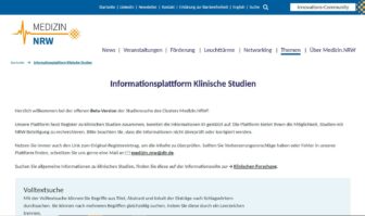 Mehr Transparenz und Sichtbarkeit für Klinische Studien in NRW2. Oktober 2025 Foto: ©nenetus – stock.adobe.com Wo bislang eine uneinheitlich dokumentierte Studienlage herrschte, soll künftig die Informationsplattform „Klinische Studien in NRW“ einen zentralen Überblick ermöglichen. Das neue Angebot umfasst laufende und abgeschlossene klinische Studien in Nordrhein-Westfalen (NRW) und richtet sich gleichermaßen an Forschende, Ärzte sowie potenzielle Studienteilnehmer. Die deutschlandweit einzigartige Plattform startet jetzt in eine einjährige Testphase. Koordiniert wird sie vom Cluster Medizin.NRW. Wissenschaftsministerin Ina Brandes (CDU): „Klinische Studien sind die Voraussetzung für Innovationen in der Spitzenmedizin. Eine zentrale, öffentlich zugängliche Plattform für Forschungsdaten erleichtert die Entwicklung neuer Therapien, Medikamente und Diagnoseverfahren. Davon profitieren sowohl die Patientinnen und Patienten als auch die Wissenschaftlerinnen und Wissenschaftler.“ Strukturierte Informationen zu klinischen Studien in NRW zentral gebündelt Screenshot von https://www.klinische-studien.nrw vom 02.10.2025 Die digitale Plattform bündelt erstmals strukturierte Informationen zu klinischen Studien in NRW an einem zentralen Ort. Die Grundlage bildet ein KI-gestütztes Tool der Firma Kwintely Intelligence, das öffentlich verfügbare Studiendaten aus verschiedenen internationalen Registern automatisiert auswertet, vereinheitlicht und mit wissenschaftlichen Publikationen verknüpft. Auf dieser Basis entsteht eine interaktive Web-Oberfläche, die eine Suche und Auswertung etwa nach Schlagwörtern, Start- und Endjahren der in Nordrhein-Westfalen durchgeführten Studien ermöglicht. Erreichbar ist die Plattform über die Webseite des Clusters Medizin.NRW und unter https://www.klinische-studien.nrw „Wir wollen mit diesem Angebot die klinische Forschung in Nordrhein-Westfalen sichtbarer machen, schneller voranbringen und neue Impulse für die Teilnahme von Patientinnen und Patienten an klinischen Studien setzen”, unterstreicht Dr. Patrick Guidato, Clustermanager von Medizin.NRW. „Es ist uns ein Anliegen, NRW als exzellenten Studienstandort weiter voranzubringen – in enger Zusammenarbeit mit Wissenschaft, Wirtschaft und Versorgung.“ Während der Testphase sollen Feedbacks aus der Praxis eingeholt und für eine Weiterentwicklung genutzt werden, damit die Plattform künftig noch schneller passgenaue Datensätze auswirft. Erste Rückmeldungen aus Wissenschaft und Industrie zur neuen Plattform zeigen großes Interesse – insbesondere an der Möglichkeit, Studiensuchen effizienter zu gestalten und Kooperationen zu erleichtern. Hintergrund Cluster Medizin.NRW Das Cluster Medizin.NRW ist ein transdisziplinäres Netzwerk für die zukunftsorientierte Spitzenmedizin in NRW. Akteure aus Medizin und Gesundheitsforschung, Natur- und Ingenieurwissenschaften kommen mit Unternehmen, Hochschulen, Forschungsstätten und Verbänden zusammen, um medizinische Innovationen zu beschleunigen. Im Auftrag der Landesregierung Nordrhein-Westfalen betreibt der DLR Projektträger seit 2019 die Geschäftsstelle Medizin.NRW. Finanziert wird das Cluster aus Mitteln des Ministeriums für Kultur und Wissenschaft des Landes Nordrhein-Westfalen. Die neue Plattform „Klinische Studien in NRW“ reiht sich in die in die Aktivitäten des Clusters Medizin.NRW für den Forschungsstandort Nordrhein-Westfalen ein. Um beispielsweise Vertragsprozesse zu beschleunigen, hat das Cluster 2024 ein Rechtsgutachten erstellen lassen, das den rechtssicheren Einsatz digitaler Unterschriften-Tools für klinische Studienverträge prüft und unterstützt.