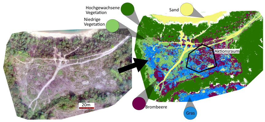 Mithilfe von Drohnen den Lebensraum von Zauneidechsen erfassen23. Februar 2022 Männchen der Zauneidechse (Lacerta agilis) auf einem Ast. Foto: © Vic Clement Das Verständnis der Raumnutzung und der Lebensraumbedürfnisse von Tieren ist wesentlich für einen wirksamen Artenschutz. Kleine Tiere nutzen kleine Strukturen, die schwer zu erfassen sind. Forschende des LIB haben jetzt in einer Studie mit Hilfe von Drohnen diese kleinen Strukturen in hochauflösenden Habitatkarten dargestellt. Das Forschendenteam konnte zeigen, wie wichtig niedrige Brombeerbüsche für Zauneidechsen in der Dellbrücker Heide in Köln sind. Die Drohnen-Methode kann Anwendung im Naturschutz und der Landschaftsplanung finden. „Was für die Menschen ihr Kiez oder Viertel ist, ist für Wildtiere ihr Aktionsraum“, erläutert Dr. Dennis Rödder, Reptilienexperte vom Leibniz-Institut zur Analyse des Biodiversitätswandels (LIB), Museum Koenig Bonn. Dieses Gebiet ist ihnen vertraut, dort bewegen sie sich und es erfüllt ihre ökologischen Bedürfnisse im täglichen Leben, von der Nahrung bis zum Unterschlupf. Nach Erkundungstouren in die Umgebung kehren die Tiere meist in dieses Gebiet zurück. Die Erfassung des Habitats im Aktionsraum kann daher wertvolle Erkenntnisse über die räumlichen und strukturellen Bedürfnisse der Wildtiere liefern. Diese Ansprüche zu verstehen wird immer wichtiger, da durch menschliche Einflüsse Landschaften verändert werden. „Wir hoffen, dass unsere Arbeit nicht nur theoretisch bleibt, sondern auch Anwendung im Naturschutz und der Landschaftsplanung findet“, erklärt Vic Clement, Doktorand am LIB, Museum Koenig Bonn.Zauneidechsen und ihr Aktionsraum sind klein, ebenso die Strukturen in ihrem Lebensraum. Um diese zu erfassen, sind daher hochauflösende Karten, die einzelne Büsche, Gras, Sand oder Bäume abbilden, vonnöten. Hier schaffen Drohnen Abhilfe: aus einer geringen Höhe nehmen sie hochauflösende Bilder des Gebiets auf, sodass einzelne Strukturen gut zu unterscheiden sind. Die Forschenden des LIB legten nun die beobachteten Aktionsräume der untersuchten Tiere auf die detaillierte Karte, und konnten auf diese Weise die Struktur des Habitats innerhalb der Grenzen des Aktionsraumes untersuchen und mit der Umgebung vergleichen. So haben Clement, Schluckebier und Rödder nachgewiesen, dass Zauneidechsen in der Dellbrücker Heide vor allem niedrige Brombeerbüsche aufsuchen, während sie offene Sandflächen und hochwachsende Vegetation meiden. Vorlieben für Gras und andere niedrige Büsche hingegen variieren von Tier zu Tier. Aus einer von Drohnenbildern generierten Karte wird mithilfe des Computers eine kategorische Karte erstellt auf die der Aktionsraum geplottet wird. Dies ermöglicht den Vergleich der Habitatstruktur im untersuchten Aktionsraum mit der Umgebung. Abb.: © Clement, Schluckebier, Rödder „Die Zauneidechse als Kulturfolger ist oftmals Opfer von Störung, Zerstörung, oder Fragmentierung ihrer Lebensräume durch menschliche Aktivitäten. Ausgleichs- und Schutzmaßnahmen könnten sich mit unseren Daten nun besser formulieren lassen“, hofft auch Rieke Schluckebier, Masterkandidatin in der Sektion Herpetelogie des LIB, Museum Koenig Bonn. Drohnen haben sich in den letzten Jahren immer mehr als nützliches Werkzeug zur Beantwortung ökologischer Fragestellungen erwiesen. Diese zeiteffiziente Methode zur Erfassung von Lebensraumstrukturen kann von großem Nutzen bei der Verwaltung von Schutzgebieten sein.______Über das LIBDas Leibniz-Institut zur Analyse des Biodiversitätswandels (LIB) widmet sich der Erforschung der biologischen Vielfalt und ihrer Veränderung. Seit dem 1. Juli 2021 arbeiten die Forschenden an zwei Standorten: dem Zoologischen Forschungsmuseum Alexander Koenig in Bonn sowie dem ehemaligen Centrum für Naturkunde in Hamburg. Generaldirektor ist Prof. Dr. Bernhard Misof, der das LIB standortübergreifend leitet.Über die Leibniz-GemeinschaftZur Leibniz-Gemeinschaft gehören zurzeit 96 Forschungsinstitute und wissenschaftliche Infrastruktureinrichtungen für die Forschung sowie drei assoziierte Mitglieder. Die Ausrichtung der Leibniz-Institute reicht von den Natur-, Ingenieur- und Umweltwissenschaften über die Wirtschafts-, Sozial- und Raumwissenschaften bis hin zu den Geisteswissenschaften. Leibniz-Institute arbeiten strategisch und themenorientiert an Fragestellungen von gesamtgesellschaftlicher Bedeutung Bund und Länder fördern die Institute der Leibniz-Gemeinschaft daher gemeinsam.