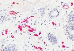 Möglicher Mechanismus für Zusammenhang zwischen Adipositas und Brustkrebs beschrieben13. April 2020 Starke Expression von Fettfettsäurebindungsprotein (FABP4) in Brustdrüsen, rot dargestellt. (Foto: © Universität von Louisville) Es ist allgemein anerkannt, dass höhere Körperfettwerte das Risiko für die Entwicklung von Brustkrebs und anderen Krebsarten erhöhen. Einer aktuellen Veröffentlichung zufolge soll von Fettzellen abgesondertes Protein die Entwicklung von Brustkrebs fördern. In seiner kürzlich veröffentlichen Arbeit berichtet der Mikrobiologe und Immunologe Bing Li vom James Graham Brown Cancer Center an der University of Louisville über diesen von ihm beobachteten Zusammenhang. Li führt seit fünf Jahren vom National Cancer Institute finanzierte Forschungen durch, die ihn auf die Spur einer möglichen Verbindung zwischen der Aktivität eines im Fettgewebe exprimierten Proteins und einer Zunahme in der Entstehung von Brustkrebs führten. In seinem aktuellen Artikel beschreibt Li seine Theorie, dass das Protein FABP4 (fatty acid binding protein), das im Fettgewebe exprimiert wird, für das Wachstum von Tumoren in der Brust verantwortlich ist. „Viele Krebsarten stehen im Zusammenhang mit Fettleibigkeit, nicht nur Brustkrebs“, betont Li. „Mehr als 13 Krebsarten sind eindeutig mit Adipositas verbunden, und ich denke, die Liste wird länger und länger werden, sobald wir mehr Daten haben. In unseren Untersuchung haben wir festgestellt, dass die Fettsäurebindungsprotein-Familie, insbesondere das Mitglied FABP4, eine sehr wichtige Rolle bei der Assoziation von Fettleibigkeit und Krebs spielt, insbesondere Brustkrebs. Wir stellen die Theorie auf, dass FABP4 für den zugrunde liegenden molekularen Mechanismus verantwortlich ist, der die Entwicklung von Brustkrebs im Zusammenhang mit Adipositas fördert.“ Fettgewebe im Körper produziert FABP4 in Fettzellen, wo es wasserunlösliche langkettige Fettsäuren verarbeitet und verteilt. Eine bestimmte Menge FABP4 gelangt unter normalen Bedingungen in den Blutkreislauf. Wenn sich jedoch ein höheres Volumen an Fettgewebe ansammelt, wird mehr FABP4 in den Kreislauf ausgeschieden. „Normalerweise befinden sich diese Moleküle in den Zellen, aber wenn Menschen adipös sind, befinden sich die Moleküle außerhalb“, erklärt Li. Seine Theorie bietet zwei Möglichkeiten, wie FABP4 das Wachstum von Brustkrebstumoren stimulieren kann. Erstens steigt FABP4 innerhalb der Zellen in bestimmten Tumor-assoziierten Makrophagen an. Lis Forschung ergab auch, dass bei Hemmung von FABP4 das Tumorwachstum in Tiermodellen verringert wird, obwohl das Fettgewebe erhalten bleibt. Zweitens fördert das Protein die Entwicklung von Brustkrebs durch direkte Interaktion mit Brustkrebszellen, wenn erhöhte FABP4-Spiegel bei Fettleibigkeit außerhalb der Fettzellen zirkulieren. In der Versuchen an Tieren waren die Entwicklung und das Wachstum von Brusttumoren bei adipösen Tieren, bei denen FABP4 unter Kontrolle war, verringert. Darüber hinaus scheint FABP4 im Blutkreislauf in mehreren Mechanismen zu wirken, die Wechselwirkungen zwischen Tumorkomponenten und Fettzellen und dadurch die Krebsentwicklung fördern. Darüber hinaus hat Lis Forschungsgruppe kürzlich Ergebnisse veröffentlicht, die zeigen, dass verschiedene Arten fettreicher Ernährung unterschiedliche Auswirkungen auf die Tumorentwicklung haben. Eine fettreichen Ernährung, die viel Kakaobutter oder Fischöl enthält, führt zu fettbedingter Adipositas. Die Ernährung mit viel Kakaobutter hat jedoch ein erhöhtes Wachstum von Brusttumoren zur Folge, während dies bei einer Ernährung, die viel Fischöl beinhaltet, nicht der Fall ist. Diese Studie bestätigt laut ihren Autoren nicht nur die entscheidende Rolle von FABP4 bei mit Fettleibigkeit assoziiertem Krebs, sondern zeigt auch, dass nicht jede Fettleibigkeit die Entwicklung von Tumoren fördert. Li und sein Team glauben, dass ein besseres Verständnis der Wirkungsweise von FABP4 sowohl in Makrophagen als auch im Blutkreislauf Möglichkeiten bieten könnte, das Voranschreiten bestimmter Brustkrebsarten zu verhindern. Es könne auch zur Entwicklung von Behandlungsmethoden führen, die auf FABP4 mit Arzneimitteln oder spezifischen Antikörpern abzielen. „Jetzt versuchen wir, einige Antikörper für dieses Protein zu generieren, was eine sehr effektive Therapiestrategie für Krebs im Zusammenhang mit Fettleibigkeit sein könnte“, sagt Li.