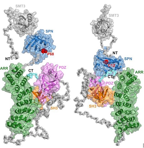 Molekulare Konsequenzen von Autismus-Mutationen aufgeklärt7. Juli 2021 Falsch gewickelt: Shank-Proteine sind wichtige Master-Organizer von erregenden Synapsen (links: gelbe Punkte). (Quelle: LIN) Ein internationales Forscherteam hat die Auswirkungen von Mutationen im Autismus-Risikogen SHANK3 auf molekularer Ebene entschlüsselt. Am Entstehen von Autismus können genetische Mutationen beteiligt sein. Die betroffenen Genprodukte sind wichtige Proteine in den Synapsen des Gehirns, wie das SHANK3-Molekül. SHANK3 ist ein Gerüst-Protein, welches viele Bindungsstellen für andere Proteine enthält und als eine Art Master-Organizer für die postsynaptische Proteinmaschinerie fungiert: Es verknüpft Transmitterrezeptoren, Signalmoleküle und das Zytoskelett und ist unverzichtbar für die präzise Arbeit der Synapsen. Welche Auswirkungen haben die bei autistischen Patienten gefundenen Mutationen auf die Funktionsweise des SHANK3-Proteins? Michael Bucher, ein Doktorand in den Arbeitsgruppen von Dr. Michael R. Kreutz und Dr. Marina Mikhaylova vom Leibniz-Institut für Neurobiologie Magdeburg (LIN) hat in enger Zusammenarbeit mit dem Labor von Dr. Eunjoon Kim vom Korea Advanced Institute of Science and Technology (KAIST) für zwei dieser Mutationen die defekten Proteine mittels Gentechnik nachgebaut und ihre Struktur analysiert. Mit biophysikalischen Verfahren konnte das Forscherteam nachweisen, dass die Mutationen zu Veränderungen in der dreidimensionalen Proteinstruktur führen, die weitreichende Konsequenzen haben: Die mutierten SHANK3-Proteine gelangen in den Nervenzellen weniger in die Synapsen, wodurch die synaptische Funktion gestört wird. Autismusbezogene Mutationen führen zum Einbau falscher Aminosäuren (Mitte und re.: rot hervorgehobene Aminosäuren Prolin (P68) und Cystein (C12)), wodurch die Proteine falsch gefaltet werden und die synaptische Ordnung nicht mehr aufrechterhalten können. (Quelle: LIN) „Wir konnten sehen, dass die Mutationen SHANK3 so veränderten, dass es die Ordnung und Dynamik der Proteine in erregenden Synapsen nicht mehr organisieren konnte. Damit haben wir molekular entschlüsselt, warum bei Patienten, die diese Mutationen tragen, Störungen in den synaptischen Verknüpfungen entstehen, die zum Beispiel für die kognitiven Symptome verantwortlich sein könnten“, erklärt Michael Bucher, Erstautor der Studie. Im nächsten Schritt sollen die mutierten Autismus-Risikoproteine nun in Mäusen untersucht werden, um die Auswirkungen auf das Verhalten direkt zu analysieren. Originalpublikation: Bucher M et al. Autism-associated SHANK3 missense point mutations impact conformational fluctuations and protein turnover at synapses. eLife 2021;10:e66165.