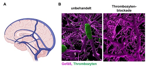 Molekulare Ursache von Hirnvenenthrombosen entdeckt11. Februar 2022 Bild: ©Matthieu – stock.adobe.com Hirnvenenthrombosen sind eine seltene, oft schwer verlaufende Erkrankung, die durch die COVID-19-Pandemie stark in den öffentlichen Fokus gerückt ist. Einer Forschungsgruppe aus Würzburg gelang es jetzt erstmals, molekulare Ursachen dieser Erkrankung zu entschlüsseln und daraus neue Therapieansätze abzuleiten. Hirnvenenthrombosen sind eine seltene Form von Hirndurchblutungsstörungen, die im Gegensatz zum klassischen Schlaganfall häufiger auch jüngere Menschen betreffen. Aus weitgehend ungeklärter Ursache entstehen Thromben in Hirnvenen, behindern den Blutabfluss und führen so zur Schädigung des Hirngewebes. Im Frühjahr 2021 gelangten Hirnvenenthrombosen als sehr seltene Nebenwirkung einer Vektor-basierten Corona-Impfung mit ins öffentliche Bewusstsein. Mittlerweile belegen epidemiologische Studien ein vielfach erhöhtes Risiko für diese gravierende Komplikation bei COVID-19-Erkrankten. Ein Forschungsteam konnte jetzt erstmals zeigen, dass die Aktivierung zweier spezifischer Rezeptoren auf der Oberfläche von Thrombozyten zu diesen Hirnvenenthrombosen führt. An der im Fachmagazin „Nature Cardiovascular Research“ publizierten Studie beteiligt waren Wissenschaftlerinnen und Wissenschaftler des Rudolf-Virchow-Zentrums – Center for Integrative and Translational Bioimaging der Universität Würzburg (RVZ) und des Universitätsklinikums Würzburg, die gemeinsam mit Kolleginnen und Kollegen aus Tübingen und Greifswald im Sonderforschungsbereich Transregio (SFB TR) 240 forschen. „Diese überraschende Erkenntnis könnte Grundlage für eine neue, hochwirksame Therapie dieser seltenen, aber gravierenden Erkrankung sein“, erklärt der Leiter der Studie und Sprecher des SFB, Prof. Bernhard Nieswandt, Lehrstuhl für Experimentelle Biomedizin I am RVZ. Das Zusammenspiel zweier Thrombozytenrezeptoren führt zu Hirnvenenthrombosen Bislang waren die molekularen Prozesse bei der Entstehung einer Hirnvenenthrombose weitestgehend unverstanden und es gab keine geeigneten Modelle zu ihrer Erforschung. Bekannt waren als Risikofaktoren das Wochenbett nach Entbindung, die orale Schwangerschaftsverhütung und Infektionen. „Eigentlich wollten wir untersuchen, ob ein Antikörper gegen den Rezeptor CLEC-2 auf Thrombozyten bei Verabreichung in die Blutbahn die Blutungsneigung erhöht. Völlig unerwartet löste der Antikörper dann aber, neben einem Abfall der Thrombozytenzahl, Krampfanfälle und weitere neurologische Ausfälle bei den behandelten Tieren aus. Symptome, die denen von Patienten mit akuter Hirnvenenthrombose sehr ähnelten. Tatsächlich zeigten weitergehende Untersuchungen, dass die Tiere binnen weniger Minuten ausgeprägte Hirnvenenthrombosen entwickelt hatten, ohne das es in anderen Organen zur Gerinnselbildung kam“, erklärt Prof. David Stegner, Leiter der Arbeitsgruppe Vaskuläre Bildgebung am RVZ und einer der beiden Erstautoren der Studie. A) Schematische Darstellung der großen Hirnvenen. B) Moderne Mikroskopieverfahren zeigen die Gerinnselbildung in den Hirnvenen von Mäusen. Links die Gefäße einer erkrankten Maus – rechts die einer Maus deren Thrombozyten gehemmt wurden. Bildquelle: RVZ „Wir vermuten, dass die Bindung des Antikörpers die Eigenschaften des Rezeptors CLEC-2 so verändert, dass er Signale in die Zelle weiterleitet. Dies aktiviert die Thrombozyten, sie verklumpen im venösen Gehirnkreislauf und lösen dadurch die Hirnvenenthrombosen aus. Ein Rätsel ist, warum nur die Hirnvenen betroffen sind“, ergänzt Stegner. Die Forschergruppe fand heraus, dass neben CLEC-2 auch noch ein zweiter Thrombozytenrezeptor, nämlich GPIIb/IIIa, an der Entstehung von Hirnvenenthrombosen beteiligt ist und nur das Zusammenwirken beider Rezeptoren zur Thrombenbildung im Gehirn führt. Thrombozytenblockade als neuer Therapieansatz Diese Erkenntnisse ermöglichten es nun, sehr gezielt nach Wirkstoffen zur Blockade so entstehender Hirnvenenthrombosen zu suchen. Ein Blutgerinnsel entsteht durch das Zusammenspiel zweier Prozesse: der plasmatischen Gerinnung und der Thrombozytenaktivierung. Bei der Behandlung venöser Thrombosen wird im Allgemeinen auf Heparin als Hemmstoff der plasmatischen Gerinnung gesetzt. Bei den hier untersuchten Hirnvenenthrombosen im Tierexperiment hatte Heparin allerdings nur einen vergleichsweise geringen schützenden Effekt. Bislang ist Heparin das Standardmedikament bei der Akutbehandlung von Patienten mit Hirnvenenthrombosen, außer wenn diese als Komplikation im Zusammenhang mit einer Corona-Impfung auftreten. Die Wissenschaftlerinnen und Wissenschaftler konzentrierten sich daraufhin auf die Thrombozytenrezeptoren. Wurden diese vorab blockiert, bildete sich keine Hirnvenenthrombose. „Das interessanteste Ergebnis war allerdings, dass eine Hemmung der Thrombozyten durch die Blockade des GPIIb/IIIa-Rezeptors auch nach dem Einsetzen der neurologischen Symptome – also im akuten Krankheitsverlauf – äußerst wirksam war“, sagt Vanessa Göb, ebenfalls Erstautorin der Studie. Die Gruppe zeigte, dass die Rezeptorblockade das Wachstum der Blutgerinnsel in den Hirnvenen unmittelbar stoppte, die behandelten Tiere sich vollständig erholten und keine Blutungskomplikationen auftraten. Dies ist für eine mögliche Übertragung dieses Therapieansatzes auf Patientinnen und Patienten von erheblicher Bedeutung. Prof. Guido Stoll von der Neurologischen Klinik ergänzt: „Diese Ergebnisse waren überraschend und könnten den Weg weisen für den Einsatz von GPIIb/IIIa-Blockern bei den Patienten, bei denen die Hirnvenenthrombosen trotz Heparinbehandlung fortschreiten, was häufig zum Tode führt. GPIIb/IIIa-Blocker sind für andere kardiovaskuläre Erkrankungen bereits zugelassen.“