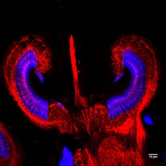Mückenbekämpfung über den Hörsinn11. August 2023 Die aufgestellten Härchen auf ihren Antennen helfen Mückenmännchen, besser zu hören. Das ist auch für die Paarung wichtig: Im Schwarm erkennen die männlichen Mücken die Weibchen am tieferen Flugton. Foto: Judit Bagi / University College London Forschende herausgefunden, dass der Botenstoff Octopamin eine entscheidende Rolle beim Hören von Malariamücken und mittelbar auch bei deren Paarung spielt. Diese Erkenntnis könnte einen neuen Ansatz bieten, die Vermehrung dieser Insekten einzudämmen. Der Biologe Prof. Jörg Albert von der Universität Oldenburg hat gemeinsam mit Forschenden des University College London (Großbritannien) den Hörsinn von tropischen Stechmücken der Gattung Anopheles und die Bedeutung des Hörsinns für das Paarungsverhalten untersucht. Die Ergebnisse könnten einen neuen Ansatz bieten, die Malaria übertragenden Insekten zu bekämpfen. Die Ergebnisse wurden jetzt in der renommierten Fachzeitschrift „Nature Communications“ veröffentlicht. Die Forschenden fanden heraus, dass der Botenstoff Octopamin eine entscheidende Rolle beim Hören und somit indirekt auch bei der Vermehrung der Stechmücken spielt. Finden sich die Tiere in der Dämmerung zu großen, kurzlebigen Schwärmen zusammen, dann erkennen Männchen die Weibchen unter Hunderten Tieren an ihrem tieferen Flugton. Es gelang nun der Nachweis, dass in dieser Situation bestimmte Octopaminrezeptoren im Ohr eine besondere Rolle spielen. Unter dem Mikroskop wird das Innenohr der Mücke sichtbar: Die blau und rot schimmernden Sinneszellen sind hochsensibel und wandeln die Schwingung der Antenne in elektrische Impulse um. Foto: Marta Andrés Miguel University College London Eine zur Schwarmzeit erhöhte Octopaminaktivität sorgt dafür, dass die männliche Mücke „ihre Ohren spitzt“. Auf den Antennen, die den Schall auffangen, stellen sich feine Härchen auf, welche den Schall effektiver einfangen können. Zusätzlich versteift sich die gesamte Antenne, was die akustische Empfindlichkeit weiter verändert. All das, so die Vermutung, bewirkt, dass die Männchen die Weibchen besser hören können. Die Forschenden konnten nachweisen, dass diese Reaktionen schwächer ausgeprägt sind oder ganz ausbleiben, wenn die Stechmücken einem schwach giftigen Insektizid ausgesetzt werden, dem Pflanzenschutzmittel Amitraz. Diese Substanz, die normalerweise gegen Zecken und Parasitenmilben eingesetzt wird, schaltet den Octopaminrezeptor der Stechmücken aus. Wenn Männchen in der Folge die Weibchen im Schwarm nicht mehr ausmachen können, sei das ein mögliches Mittel, um die Vermehrung dieser Stechmückenart einzudämmen und ihre Population zu verringern, so die Forschenden. „Das Hören der Mücken ist ein Vorgang von bemerkenswerter Komplexität. Mit unseren Ergebnissen über die Rolle des Botenstoffs Octopamin kratzen wir gerade einmal an der Spitze eines gigantischen Eisberges“, sagt Albert. „Ich bin mir sicher, dass zukünftige Forschung uns nicht nur den Gehörsinn der Mücken besser verstehen lässt, sondern auch helfen wird, von Mücken übertragene Krankheiten wie Malaria und Denguefieber zu bekämpfen.“ Der Biologe und Biophysiker forscht seit Anfang des Jahres an der Universität Oldenburg. Zuvor war er am UCL tätig, mit dem er auch künftig eng zusammenarbeiten wird.