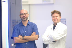 Nahaufnahmen biologischer Nanomaschinen: Tiefer Blick in Peroxisomen-Prozesse26. September 2023 3-D-Struktur der AAA ATPase Pex1/Pex6. (Abbildung: © Uni Münster/Maximilian Rüttermann) Indem die Zellorganellen „Peroxisomen“ im menschlichen Körper unter anderem toxische Substanzen und Fette abbauen, verhindern sie ernsthafte Erkrankungen. Die Proteingruppe „Pex“ (Peroxisomen-Biogenesefaktoren) hält die „Entgiftungseinheiten“ funktionstüchtig. Ein Forschungsteam um Prof. Christos Gatsogiannis vom Institut für Medizinische Physik und Biophysik der Universität Münster konnte jetzt erstmals auf atomarer Ebene zeigen, wie diese hochkomplexen Prozesse ablaufen. Möglich wurde der Erfolg, den das Journal „Nature Communications” jetzt mit einer Veröffentlichung der Studie würdigt, durch das neue High-Tech-Mikroskop der Universität. „Wir können uns Peroxisomen als Miniaturfabriken vorstellen, die sich auf verschiedene Aufgaben spezialisiert haben“, erklärt Gatsogiannis. „In erster Linie sind sie für die ‚Entgiftung‘ der Zelle bekannt. Sie fungieren als zelluläre Abfallentsorgungseinheiten und bauen schädliche Substanzen ab, die sich sonst unter Umständen in unseren Zellen ansammeln.“ Das können etwa überschüssige Fettsäuren sein oder Giftstoffe aus unserer Umwelt; mindestens 50 verschiedene Prozesse dieser Art übernehmen die nur 0,5 Mikrometer großen Zellorganellen. Nehmen die Peroxisomen ganz genau unter die Lupe: Christos Gatsogiannis (l.) und Maximilian Rüttermann. (Foto: © Uni Münster/Karthik Subramaniam Kalyankumar) Besonders systemrelevant ist die Rolle der Peroxisomen beim Fettstoffwechsel. Denn sie bauen Fette nicht nur ab, sie wandeln sie auch in verwertbare Energie um. Ohne Peroxisomen können sich etwa gefährliche Mengen bestimmter Fette im Körper ansammeln; ernsthafte Gesundheitsprobleme wären die Folge. Altersbedingte Krankheiten werden daher häufig mit Störungen der Peroxisomalfunktion in Verbindung gebracht, zum Beispiel Hör- und Sehverlust, Alzheimer, Diabetes oder Krebs. Jeder dieser Prozesse erfordert eine Reihe spezifischer Enzyme. Die Peroxisomen sind allerdings von einer biologischen Membran umgeben, die die Proteine nicht ohne weiteres passieren können – sie müssen importiert werden. Dieser Importmechanismus braucht Energie und eine weitere Gruppe von Proteinen, die Pex: „Ähnlich wie ein Lastwagen, der Produkte von einem Ort zum anderen transportiert, benötigt der Transport von Enzymen ein Transportprotein, Energie und eine gut durchdachte Logistik, um effizient zu sein“, zieht Doktorand Maximilian Rüttermann aus der Arbeitsgruppe einen Vergleich. „Und wie ein Lastwagen wird das Protein wiederverwendet oder recycelt, bis es schließlich zerfällt.“ Dieser Recycling-Mechanismus ist der einzige energieaufwendige Schritt des gesamten Importprozesses. Die Hauptrolle spielt dabei der peroxisomale AAA-ATPase-Komplex Pex1/Pex6: Die „biologische Nanomaschine“ entpackt und entfaltet die verbrauchten Proteine, damit sie recycelt oder abgebaut werden können. AAA-ATPasen sind dabei grundsätzlich eine Art zelluläres Reinigungsteam, das die innere Umgebung der Zelle sauber, funktionell und bereit für die Anforderungen des Lebens hält. Wenig überraschend ist somit, dass die meisten Störungen der peroxisomalen Biogenese mit Mutationen in Pex1 oder Pex6 verbunden sind: Bis zu 60 Prozent aller Fälle gehen dabei auf eine seltene genetische Störung zurück, bei der die Zellen der Patienten nicht in der Lage sind, Peroxisomen zu bilden. Der breiten Öffentlichkeit ist dies nicht bekannt, da die betroffenen Patienten in der Regel schon wenige Tage oder Wochen nach der Geburt sterben – bisher gibt es keine heilende Therapie. Die Forschungsgruppe um Gatsogiannis hat nun erstmals im atomaren Detail gezeigt, wie die peroxisomale AAA-ATPase andere Enzyme prozessiert, um die Entgiftungseinheiten funktionsfähig zu halten. Dazu nutzten die Forscher die Methode der Kryo-Elektronenmikroskopie. „Die Untersuchung eines hochdynamischen Komplexes wie der AAA-ATPase Pex1 Pex6 ist wie die Beobachtung eines laufenden Automotors“, veranschaulicht Rüttermann. „Man macht Millionen von Bildern aus allen Blickwinkeln, während er im Betrieb ist und erstellt auf dieser Grundlage ein dreidimensionales Modell in all seinen verschiedenen Zuständen.“ Die Gruppe hat im Frühjahr ein hoch modernes Kryo-Elektronenmikroskop in Betrieb genommen: Die 7,5 Millionen Euro teure Neuanschaffung ermöglicht, Proteine und biologische Nanomaschinen auf atomarer Ebene zu untersuchen und so die Geheimnisse der Zellfunktion zu entschlüsseln. Die hochaufgelösten Strukturen zeigen, wie die Proteine Pex1 und Pex6 synchron zusammenarbeiten: Sie ziehen ein Substrat ähnlich den verwendeten Import-Rezeptoren aus der Membran, um deren Recycling zu ermöglichen – ein einzigartiger Mechanismus, vergleichbar mit einer Reihe von Armen, die ein dickes Seil schrittweise in Paare ziehen und dabei seine Knoten lösen. „Die atomaren Strukturen und das Verständnis für den Mechanismus dieser komplexen Nanomaschine erlaubt uns nun, wichtige Schritte der Peroxisom-Physiologie in Gesundheit und Krankheit zu verstehen“, resümiert Gatsogiannis. „Nun ist es auch möglich, alle bekannten Mutationen mit ihrer Funktion in Verbindung zu bringen, um ihre chemischen Folgen und damit die Ursachen von Stoffwechselstörungen zu verstehen.“