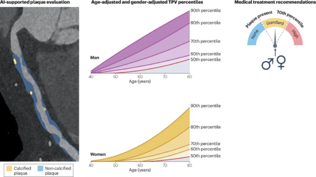 Neue Empfehlungen: Individualisierte Vorsorge durch KI-gestützte Herzdiagnostik29. August 2025 KI-generiertes Bild: (©Papukos/stock.adobe.com) Neue Empfehlungen zielen darauf ab, die medikamentöse Behandlung von Atherosklerose zu verbessern. Helfen soll dabei erstmals eine Künstliche Intelligenz (KI), welche die Auswertung von koronaren CT-Aufnahmen verbessert – und so eine individuellere und wirksamere Therapie ermöglicht. Jedes Jahr bekommen in Europa mehr als zwei Millionen Menschen mit Brustschmerzen eine koronare Computertomographie(CT)-Angiographie. Bisher gab es jedoch keine klaren Empfehlungen, wie genau die Ergebnisse dieser Untersuchungen für eine passgenaue medikamentöse Behandlung genutzt werden sollten. Eine internationale Gruppe führender Herzspezialisten hat nun neue Empfehlungen zur individualisierten medikamentösen Behandlung von Atherosklerose im Fachmagazin „Nature Reviews Cardiology“ veröffentlicht. Die Leitung hatten Wissenschaftler der Charité – Universitätsmedizin Berlin inne, unterstützt wurden sie durch das Deutsche Zentrum für Herz-Kreislauf-Forschung (DZHK) mit finanzieller Förderung durch die Deutsche Forschungsgemeinschaft (DFG). Erstautoren sind die zwei Doktoranden Kenrick Schulze und Anne-Marieke Stantien aus dem Graduiertenkolleg BIOQIC. Künstliche Intelligenz für die Plaquebewertung aus CT-Bildern Laut den Experten kann KI dabei helfen atherosklerotische Plaques präziser zu bewerten, sodass die Ergebnisse für individualisierte Behandlungsempfehlungen genutzt werden können. In ihrem Konsensus-Statement fordern sie einen Paradigmenwechsel hin zu einer individualisierten Behandlung, um schweren Herz-Kreislauf-Ereignissen gezielter vorzubeugen. Die Forschenden der Quantitative Cardiovascular Imaging (QCI) Study Group empfehlen, CT-Daten mithilfe von KI auszuwerten, um das Risiko für Herzinfarkte besser einschätzen zu können. Dabei wird die Plaquemenge im Vergleich zu alters- und geschlechtsspezifischen Durchschnittswerten mithilfe großer Datenmengen schnell und präzise eingeordnet. Frühzeitig behandeln, gezielt vorbeugen „Wenn Ablagerungen in der CT sichtbar sind, sollte das ein Zeichen sein, mit einer medikamentösen Behandlung in Ergänzung zur Lebensstiloptimierung zu beginnen“, erklärt Prof. Marc Dewey von der Charité, Koordinator der QCI-Gruppe. „Liegt die Plaquemenge deutlich über einem bestimmten alters- und geschlechtsspezifischen Wert, rät die interdisziplinäre Gruppe zu einer intensiveren medikamentösen Therapie.“ Eine solche Therapie kann etwa bedeuten, dass cholesterinsenkende Medikamente wie Statine höher dosiert oder mit weiteren Wirkstoffen kombiniert werden. Die Abbildung (©Nat Rev Cardiol 2025) zeigt den Paradigmenwechsel hin zu individualisierten Behandlungsempfehlungen auf der Grundlage einer durch künstliche Intelligenz unterstützten Bewertung von atherosklerotischen Plaques in der Computertomographie (CT). Ein neuer Weg zu personalisierter Medizin Die Empfehlungen basieren auf einem mehrstufigen Expertenverfahren und auf den Daten großer Studien. Sie markieren einen Paradigmenwechsel in der Herzmedizin: Weg von der pauschalen Behandlung nach allgemeinen Risikofaktoren – hin zu individuellen Entscheidungen basierend auf den tatsächlichen Veränderungen in den Gefäßen. „Diese Erkenntnisse helfen uns, gefährdete Patienten früher und gezielter zu behandeln – und andere vor unnötiger Therapie zu bewahren“, sagt Dewey. Der nächste Schritt ist nun, die Wirksamkeit der KI-gestützten Behandlungsstrategie in großen randomisierten klinischen Studien von CT mit KI im Vergleich zu CT ohne KI zu testen.