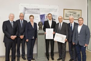 Neue Erkenntnisse zu Metastasen bei Brustkrebs: Domagk-Preis verliehen14. Dezember 2017 Preisträger Prof. Christoph Klein bei seiner Festrede: Foto: FZ / Marschalkowski Für seine richtungsweisenden Erkenntnisse zu Mechanismen der Metastasenbildung bei Brustkrebs – veröffentlicht in “Nature” – hat die münstersche Gerhard-Domagk-Stiftung Prof. Christoph Klein, Leiter der Fraunhofer-Projektgruppe Personalisierte Tumortherapie und Lehrstuhlinhaber für Experimentelle Medizin und Therapieverfahren der Universität Regensburg, mit ihrer gleichnamigen Auszeichnung geehrt. Mit seinen Ergebnissen stellt der Forscher ein seit Jahrzehnten geltendes Dogma der Onkologie infrage: Streuen Krebszellen tatsächlich überwiegend im späten Stadium? Dies jedenfalls nahm die Wissenschaft lange an, weil die Erfahrung zeigte, dass die frühe Entfernung des Primärtumors entscheidend für die Heilung von Krebspatienten ist. Nachdem andere Studien in den letzten Jahren bereits erste Zweifel an dieser Hypothese nährten, liefert nun auch Klein einen Gegenbeweis: „Wir konnten zeigen, dass bereits in einem frühen Krebsstadium ein bestimmtes Hormon – das Progesteron – die Bildung von neuen Krebszellen und deren Abwanderung in andere Körperregionen fördert. In unserem Mausmodell waren so etwa 80 Prozent der gebildeten Metastasen auf frühe Tumorstadien zurückzuführen“, erklärt er. Im fortgeschrittenen Brustkrebsstadium hemme hingegen ebendieses Hormon die Bildung von Metastasen, so der 50-Jährige, dessen Ergebnisse auch auf Mechanismen beim Menschen übertragbar sind. Prof. Werner Böcker, Dekan Prof. Mathias Herrmann, Institutsdirektorin Prof. Eva Wardelmann, Preisträger Prof. Christoph Klein, Prof. Dirk Domagk, Prof. Heribert Jürgens und Prof. Dirk Föll bei Preisverleihung im Gerhard-Domagk-Institut für Pathologie (v.l.n.r.). Foto: FZ / Marschalkowski „Die heute ausgezeichnete Publikation von Prof. Klein stellt nur einen seiner vielen wissenschaftlichen Höhepunkte dar: Er leistet seit Jahren herausragende Arbeit in der Krebsforschung und hat sich auf dem Gebiet sehr verdient gemacht. Deshalb fiel die Wahl unter 16 Bewerbungen auf ihn“, weiß Prof. Eva Wardelmann, Direktorin des Gerhard-Domagk-Instituts für Pathologie in Münster, Stiftungsvorsitzende und Jurorin in der Fachjury, die den Preisträger ernennt. Der Gerhard-Domagk-Preis, ausgeschrieben von der namensgebenden Stiftung in Kooperation mit der Universitätsgesellschaft der Westfälischen Wilhelms-Universität (WWU), ist mit 10.000 Euro dotiert und wird zur Hälfte von der Bayer Science and Education Foundation gestiftet. Der Preis ehrt international herausragende, viel beachtete Forschungsergebnisse. Der in Münster an der Universität sowie bei den Bayer-Werken tätige Mediziner Domagk hat im Jahr 1937 als erster und bisher einziger Pathologe für seine Verdienste bei der Bekämpfung von Infektionskrankheiten den Nobelpreis erhalten. Da ihm auch die Krebsforschung ein großes Anliegen war, gründete er noch zu Lebzeiten die Stiftung „Krebsforschung Prof. Dr. Gerhard Domagk“, kurz Gerhard-Domagk-Stiftung.