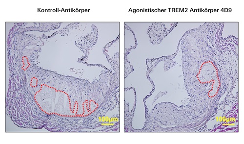 Neue Erkenntnisse zur Atherosklerose14. März 2024 v.l.n.r.: Christoph Binder und Florentina Porsch aus Wien sowie Marie Piollet, Alma Zernecke-Madsen und Clément Cochain aus Würzburg haben den Einfluss von TREM2 auf die frühe und späte Atherosklerose sowie auf die Makrophagenfunktionen untersucht. (Quelle: © Collage, Alma Zernecke-Madsen und Christoph Binder) Ein durch Atherosklerose verursachter Verschluss arterieller Blutgefäße ist maßgeblich für Herzinfarkte und Schlaganfälle verantwortlich. Ein internationales Forschungsteam unter Leitung der Medizinischen Universität Wien und des Universitätsklinikums Würzburg hat nun wichtige Fortschritte im Verständnis der Atherosklerose erzielt und potenzielle neue Ansätze für Früherkennung und Therapie identifiziert. Atherosklerose ist eine chronische Erkrankung der Gefäßwand. Ablagerungen von Lipiden, insbesondere von Cholesterin, treiben die Entstehung von Plaques in der innersten Schicht von Arterien voran. Diese Ablagerungen können das Innere der Gefäße verengen und den Blutfluss behindern. Im schlimmsten Fall führen sie zu Blutgerinnseln, die je nach betroffenem Teil des Gefäßsystems Herzinfarkte oder Schlaganfälle verursachen können, welche weltweit für rund ein Drittel der Todesfälle verantwortlich sind. Wie Immunzellen die Entwicklung der Atherosklerose steuern Seit Jahren erforschen Prof. Alma Zernecke-Madsen und Clément Cochain, PhD, vom Institut für Experimentelle Biomedizin II am Universitätsklinikum Würzburg sowie Prof. Christoph Binder vom Klinischen Institut für Labormedizin der Medizinischen Universität Wien diese chronische Erkrankung der Gefäße. Ein Fokus ihrer Untersuchungen liegt auf dem Immunsystem, welches in allen Phasen der Atherosklerose eine wichtige Rolle spielt. So können Makrophagen durch Aufnahme von Lipiden zu sogenannten Schaumzellen werden, die sich besonders in atherosklerotischen Plaques ablagern. „Wir wussten bereits, dass diese Schaumzellen den Rezeptor TREM2 (Triggering Receptor Expressed on Myeloid cells 2) auf der Oberfläche tragen und dieser Rezeptor die Makrophagenfunktion in unterschiedlichen Pathologien wie Alzheimer oder Fettleibigkeit reguliert. Die Mechanismen, über die der Rezeptor auf die Atherosklerose einwirkt, waren jedoch noch nicht vollständig bekannt“, erläutert Zernecke-Madsen, die das Institut für Experimentelle Biomedizin am UKW leitet. Einen wichtigen Baustein lieferten die Arbeitsgruppen aus Würzburg und Wien nun in der neuesten Publikation im Journal „Nature Cardiovascular Research“. „Wir haben den Einfluss von TREM2 auf die frühe und späte Atherosklerose sowie auf die Makrophagenfunktionen in zwei unterschiedlichen Laboren, in Wien und in Würzburg, unabhängig voneinander untersucht, was die Reproduzierbarkeit der Ergebnisse noch unterstreicht“, betonen die drei Studienleiter. TREM2 reguliert Makrophagenfunktion Gemeinsam konnten die Forschenden zeigen, dass TREM2 für Makrophagen entscheidend an der Aufnahme von Lipiden und dem effizienten Abräumen von toten Zellen im Gewebe beteiligt ist, der sogenannten Efferozytose. TREM2 fördert das Überleben von Schaumzellen. Auf diese Weise scheint TREM2 das Gleichgewicht zwischen dem Absterben von Schaumzellen und ihrer Beseitigung in atherosklerotischen Läsionen zu steuern. Schützende Funktion eines agonistischen TREM2-Antikörpers Einen möglichen therapeutischen Ansatz lieferten Untersuchungen an sogenannten LDLR-/- Mäusen, bei denen das LDLR-Gen ausgeschaltet wurde. Sie haben daher eine erhöhte Konzentration von LDL-Cholesterin im Blut, was das Risiko für die Entwicklung von Atherosklerose erhöht. Diese Mäuse wurden mit einem von Kai Schlepckow und Christian Haass vom Deutschen Zentrum für Neurodegenerative Erkrankungen (DZNE) in München hergestellten agonistischen TREM2-Antikörper namens 4D9 behandelt, wodurch die Aktivität von TREM2 verstärkt wurde. Es hat sich gezeigt, dass durch die Stimulation von TREM2 die Bildung nekrotischer Kerne innerhalb der atherosklerotischen Plaques begrenzt wurde (siehe Abb.). Die Behandlung mit dem agonistischen TREM2-Antikörper 4D9 führt zur Ausbildung kleinerer nekrotischer Kerne (rote Umrandungen) in atherosklerotischen Plaques der Aortenwurzel in Ldlr-/- Mäusen (Abb.: © Nature Cardiovascular Research) Diese protektive Funktion von TREM2 könnte Zernecke-Madsen, Binder und Cochain zufolge sehr wichtig sein, da die Ansammlung von abgestorbenen Plaquezellen maßgeblich die Stabilität der Ablagerungen und damit klinische Komplikationen der Atherosklerose beeinflusst. Das heißt: Wenn zu viele Zellen durch Nekrose absterben und die geschädigten Zellen nicht effizient entfernt werden, kommt es zu Entzündungen und nachfolgenden schädlichen Effekten. Durch die Gabe von 4D9 sterben jedoch weniger Zellen aufgrund von Nekrose ab. TREM2 könnte bei Atherosklerose diagnostisch und therapeutisch nutzbar sein Darüber hinaus konnten die Forschenden Daten erheben, die TREM2 im menschlichen Serum bei der Atherosklerose nachweisen. „Das im Blut lösliche TREM2 korrelierte mit dem weiteren Wachstum von Plaques in der Halsschlagader der Patientinnen und Patienten“, schildert Ko-Erstautorin Dr. Florentina Porsch. „Zusammen mit den Ergebnissen aus den präklinischen Tiermodellen könnte dies darauf hindeuten, dass TREM2 diagnostisch wie auch therapeutisch nutzbar sein könnte, was in den nächsten Jahren weiter erforscht werden muss“, fasst Ko-Erstautorin Marie Piollet zusammen. Aktuell untersucht Cochain gemeinsam mit Zernecke-Madsen und Antoine-Emmanuel Saliba vom Helmholtz-Institut für RNA-basierte Infektionsforschung (HIRI) mit ihren jeweiligen Arbeitsgruppen am Standort Würzburg die Funktion von TREM2 auch in anderen kardiovaskulären Erkrankungen wie dem Myokardinfarkt und bei Herzinsuffizienz. Die Untersuchungen finden unter anderem im Rahmen des von der Deutschen Forschungsgemeinschaft geförderten Sonderforschungsbereichs SF