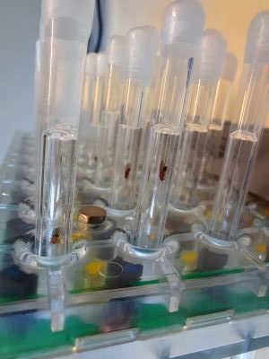 Neue Erkenntnisse zur inneren Uhr bei Taufliegen18. März 2022 Blick in das Gehirn einer Taufliege. Das Gehirn wurde mit einem sogenannten PDF- (Pigment dispersing factor) Antikörper gefärbt. Rot: die ventrolateralen Uhrneuronen einer Hirnhälfte und ihre Nervenfortsätze. Versuchsaufbau zur automatisierten Messung der Bewegungsaktivität von Taufliegen. Foto: © WWU – AG Stanewsky Ein Team um den Neurobiologen Prof. Dr. Ralf Stanewsky von der Westfälischen Wilhelms-Universität Münster hat bei der Taufliege nachgewiesen, dass ein bestimmtes Ionen-Transportprotein („KCC“) bei der Steuerung des zirkadianen Rhythmus durch Licht eine Rolle spielt. Die meisten Lebewesen haben eine innere Uhr, die unter anderem den Schlaf-wach-Rhythmus steuert. Der innere Rhythmus dauert ungefähr einen Tag („zirkadian“), also etwa 24 Stunden, und wird durch verschiedene „Uhr-Gene“ getaktet. Außerdem erfolgt ein permanenter Abgleich mit Faktoren wie Licht und Temperatur, um die innere Uhr mit dem äußeren Tag-Nacht-Rhythmus zu synchronisieren. Ein Team um den Neurobiologen Prof. Dr. Ralf Stanewsky von der Westfälischen Wilhelms-Universität (WWU) Münster wies nun bei der Taufliege Drosophila melanogaster nach, dass ein bestimmtes Ionen-Transportprotein („KCC“) bei der Steuerung des zirkadianen Rhythmus durch Licht eine Rolle spielt.Das untersuchte Ionen-Transportprotein ist Teil einer molekularen Signalkaskade in bestimmten Hirnneuronen. Zum Hintergrund: An der Steuerung der inneren Uhr der Taufliege ist ein Protein mit der Bezeichnung „Quasimodo“ beteiligt. Es ist Teil der Zellmembran und trägt dazu bei, Lichtsignale als Taktgeber von außen weiterzugeben und eine innere molekulare Steuerungskaskade auszulösen. Quasimodo interagiert mit einem Natrium-Kalium-Chlorid-Cotransporter namens NKCC. Dessen Aufgabe ist es, Chlorid-Ionen in die Zelle hineinzuschleusen. In der aktuellen Studie, die im Fachmagazin „Current Biology“ veröffentlicht wurde, untersuchten die Forscher nun erstmals den Gegenspieler von NKCC, nämlich den Kalium-Chlorid-Cotransporter KCC, der Chlorid-Ionen aus der Zelle herausschleust. Chloridgehalt in der Zelle ist entscheidend für das Funktionieren der inneren Uhr Das Gleichgewicht dieser beiden Co-Transporter bestimmt den Chloridgehalt in der Zelle. Und der wiederum ist entscheidend für das Funktionieren der inneren Uhr: Der Chloridgehalt legt fest, wie ein Neuron auf den Neurotransmitter GABA reagiert. Bei hohem Chloridgehalt wirkt GABA anregend, bei niedrigem hemmt er die Signalweitergabe durch die Zelle. „Das gleiche Signal kann also anregend oder hemmend wirken“, erläutert Erstautorin Katharina Eick. „Man vermutet, dass es zum Beispiel von der Tageszeit abhängt – es könnte unterschiedliche Verhaltensweisen der Fliege bei Tag und Nacht erklären.“ Die Aktivität der Cotransporter wird durch zwei Enzyme, die Kinasen „Wnk“ und „Fray“, reguliert. Auch diese beiden Kinasen nahmen die Forscher unter die Lupe.„Interessant ist, dass die beiden Cotransporter NKCC und KCC sowie die Kinasen Wnk und Fray evolutionär betrachtet sehr alte Proteine sind, die nicht nur in Fliegen, sondern auch in Säugetieren vorkommen“, unterstreicht Katharina Eick. „Es war von Säugetieren, nicht aber von Fliegen, schon bekannt, dass die Aktivität von NKCC und seinem Gegenspieler eine wichtige Rolle bei der inneren Uhr spielt.“Die Ergebnisse der Studie im Detail: Das Team wies nach, dass Fliegen, bei denen jeweils eine der drei untersuchten Stellschrauben besonders aktiv oder inaktiv ist, ein abnormales rhythmisches Verhalten bei konstantem Licht zeigen. Normalerweise haben Fliegen bei konstanter Beleuchtung keinen Verhaltensrhythmus, da ein essenzielles Protein der molekularen Uhr im Licht abgebaut und somit die Funktion der Uhr gestört wird. „Aus unserem Experiment können wir schließen, dass KCC, Wnk und Fray an einem Signalweg beteiligt sind, durch den Lichtreize an die innere Uhr übertragen werden“, unterstreicht Katharina Eick.Neben dem abnormalen rhythmischen Verhalten im konstanten Licht bemerkten die Forscher bei manchen Fliegen, die einem langen Tag-Nacht-Zyklus ausgesetzt waren (16 Stunden hell, acht Stunden dunkel), eine weitere Verhaltensauffälligkeit: eine abnormal erhöhte Aktivität am Morgen. Diese erhöhte Aktivität trat nur auf, wenn jeweils weniger NKCC und Quasimodo vorhanden waren als normal. „Die Ergebnisse deuten darauf hin, dass die von uns untersuchten Proteine eine Funktion bei der Anpassung der zirkadianen Uhr an die verschiedenen Jahreszeiten mit unterschiedlicher Tageslänge haben könnten. Hierzu gibt es auch bereits Hinweise bei Säugetieren“, sagt Katharina Eick. Das Team wies außerdem erstmals nach, dass das Ionen-Transportprotein KCC die neuronale Antwort auf den Neurotransmitter GABA in der inneren Uhr der Fliegen direkt beeinflussen kann.Zu den Methoden: Die Forscher setzten eine Kombination aus Verhaltensexperimenten, Elektrophysiologie und modernen genetischen Methoden ein. Durch zellspezifische genetische Manipulation erzeugten sie Fliegenstämme, bei denen die untersuchten Proteine besonders viel, wenig oder gar nicht vorhanden waren. Die Aktivität der Hirnneuronen wurde an den sogenannten großen ventrolateralen Uhrneuronen im Gehirn der Taufliegen gemessen.Neben dem münsterschen Team um Ralf Stanewsky waren Wissenschaftler der Universität Bristol, Großbritannien, an der Studie beteiligt. Die Deutsche Forschungsgemeinschaft (DFG) und der Biotechnology and Biological Sciences Research Council (BBSRC) förderten die Arbeit finanziell. Versuchsaufbau zur automatisierten Messung der Bewegungsaktivität von Taufliegen: In jedem der Glasröhrchen befindet sich eine Fliege. Wenn sie hin und her läuft, unterbricht sie einen Infrarotstrahl, was über einen Sensor registriert wird. Die Anzahl der Unterbrechungen gilt als Maß für die Aktivität. Während der Messungen werden die äußeren Bedingung