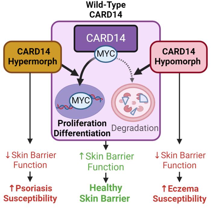 Neuer Signalweg für Hauttherapien entdeckt13. August 2024 Foto: © kapinon – stock.adobe.com Ein Team vom Cincinnati Children’s haben einen Signalweg entdeckt, der neue Möglichkeiten zur Behandlung von Atopischer Dermatitis und Psoriasis eröffnet. Die Haut ist die erste Verteidigungslinie gegen Infektionen. Jahrzehntelange Forschung hat gezeigt, dass eine Vielzahl von Krankheiten auftreten oder sich verschlimmern kann, wenn die Haut keine wirksame Barriere bilden kann. Nun berichten Forschende des Cincinnati Children’s über die Entdeckung eines molekularen Signalwegs, der eine entscheidende Rolle bei der Aufrechterhaltung unserer Hautbarriere spielt. Die Studie wurde im August 2024 online in Cell Reports veröffentlicht. „Unsere Forschung hat einen bisher unbekannten zellulären Weg entdeckt, an dem das Protein CARD14 beteiligt ist“, sagt DeVore. „Wenn dieses Protein richtig funktioniert, hält es unsere Hautbarriere gesund, aber wenn CARD14 nicht richtig funktioniert, fördert es die Entwicklung von Hautkrankheiten.“ Die Forschenden fanden heraus, dass CARD14 direkt an MYC bindet und es reguliert, ein Protein, das an der Kontrolle des Zellwachstums beteiligt ist und bei Fehlfunktionen zu Krebs beitragen kann. Die Studie zeigt, dass die richtige Interaktion zwischen diesen beiden Proteinen wichtig für eine gesunde Hautbarriere und den Schutz vor Ekzemen und Psoriasis ist. Angesichts der Assoziation von MYC mit Krebs deuten die Ergebnisse außerdem darauf hin, dass eine gestörte CARD14-MYC-Signalübertragung zu bestimmten Krebsarten im gesamten Körper beitragen kann. CARD14 bindet und reguliert direkt MYC, ein Protein, das an der Kontrolle des Zellwachstums beteiligt ist und bei Fehlfunktionen zu Krebs beitragen kann. Die richtige Interaktion zwischen diesen beiden Proteinen ist für eine gesunde Hautbarriere wichtig. © Cincinnati Children’s Frühere Forschungsarbeiten konzentrierten sich auf den CARD14-NFκB-Signalweg, von dem angenommen wird, dass er Psoriasis-Erkrankungen fördert, wenn er erhöht ist, und Atopische Dermatitis begünstigt, wenn er reduziert ist. „Dieses Modell erklärt jedoch nicht vollständig die Variabilität der durch CARD14 ausgelösten Krankheiten“, sagt Hershey vom Cincinnati Children’s. „Dieser neue CARD14-MYC-Signalweg stärkt die Verbindung zwischen CARD14 und der Gesundheit der Hautbarriere. Seine Signale regulieren die Funktion von MYC in der häufigsten Art von Hautzellen.“ CARD14 reguliert die Funktion der Hautbarriere durch zwei Mechanismen: Es stimuliert NFκB, um eine antimikrobielle Barriere zu errichten, und es stimuliert MYC, um den Aufbau einer physischen Barriere zu unterstützen. DeVore sagt, dass die Suche nach niedermolekularen Wirkstoffen, die den CARD14-MYC-Signalweg sicher beeinflussen können, noch nicht abgeschlossen ist. „Unser ultimatives Ziel ist die Entwicklung neuer Therapeutika“, sagt DeVore. „Wir führen auch Studien durch, die darauf abzielen, Krebsarten zu identifizieren, die von der CARD14-MYC-Signalübertragung betroffen sein könnten.“