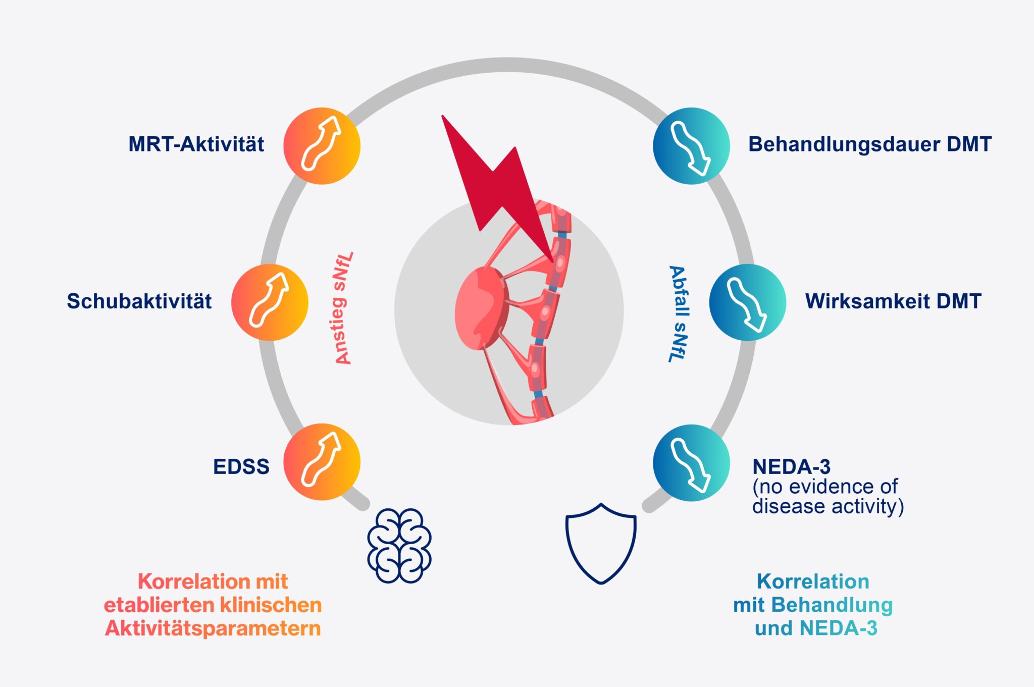 Für die RMS-Therapie ist mit sNfL ein objektiver, messbarer Aktivitätsmarker verfügbar, der sich niederschwellig in der klinischen Praxis ermitteln lässt. In Ergänzung zu bildgebenden Verfahren wie MRT und dem klinischen Befund bietet sNfL eine minimalinvasive und kosteneffiziente Möglichkeit, die gegenwärtige Krankheitsaktivität von MS-Patient*innen zu bestimmen und subklinisches Krankheitsgeschehen aufzudecken.1