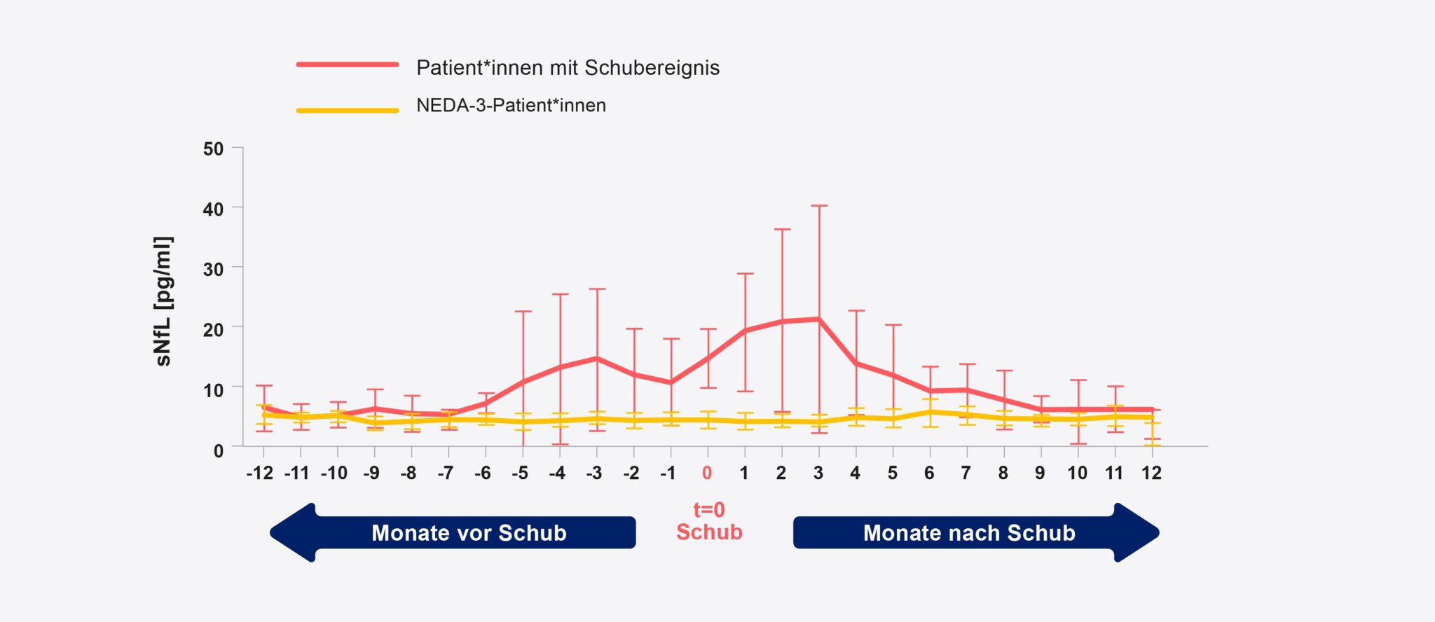 Abb. 2: Anstieg der sNfL-Spiegel vor dem Auftreten von Schüben bei RMS-Patient*innen (adaptiert nach3) sNfL: Serum-Neurofilament-Leichtketten; NEDA-3 (No Evidence of Disease Activity): Kein Zeichen von Krankheitsaktivität: keine Schübe, keine Behinderungsprogression, keine MRT-Aktivität