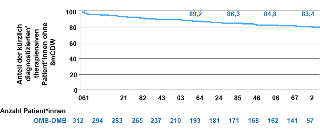 Abb. 1 Anteil der kürzlich diagnostiziertenf, therapienaiven Patient*innen ohne bestätigte Behinderungsprogression nach 6 Monaten (mod. n. [3]) |