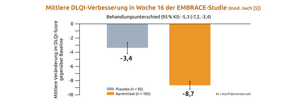 Drei Viertel der EMBRACE-Patient:innen zeigten Verbesserung beim DLQI Die placebokontrollierte Phase 4-Studie EMBRACE untersuchte die Wirkung des oralen Phosphodiesterase-4(PDE-4)-Hemmers Apremilast auf die Lebensqualität. Bei den teilnehmenden Patient:innen trat während einer vorangegangenen topischen Therapie oder einer konventionellen systemischen Erstlinientherapie keine Linderung ein oder sie hatten diese Arzneimittel nicht vertragen bzw. diese waren kontraindiziert. Bei moderater Hautbeteiligung wiesen die Erkrankten Manifestationen in mindestens einem sichtbaren oder belastenden Hautbereich sowie einen Dermatologischen Lebensqualitäts-Index [DLQI] > 10 und einen PASI im Bereich von ≥ 3 bis ≤ 10 auf.5