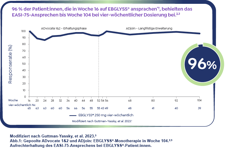 Unter einer Therapie mit EBGLYSS® konnten Patient:innen nicht nur ein frühes, sondern auch anhaltendes EASI-75-Ansprechen erreichen. 96 % der Patient:innen mit einem EASI-75-Ansprechen in Woche 16 konnten dieses unter einer 4-wöchigen Erhaltungstherapie mit EBGLYSS® bis Woche 104 aufrechterhalten.3 |