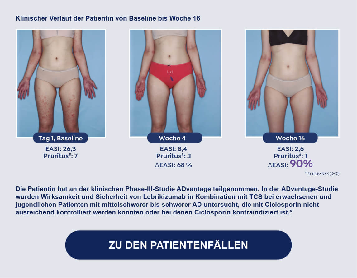 Überzeugen Sie sich selbst in drei praxisnahen Kasuistiken, wie auch Ihre Patient:innen mit mittelschwerer bis schwerer AD von einer Therapie mit EBGLYSS® profitieren können. |
