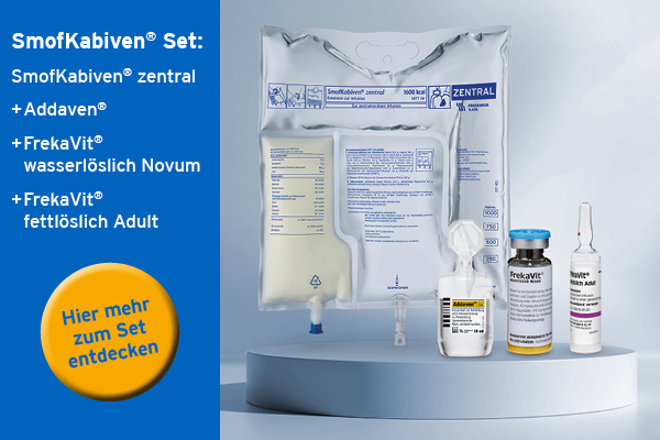 Entdecken Sie die Vorteile des einzigen Komplettpakets* für Anwender und Patienten**: Das neue SmofKabiven® Set für die parenterale Ernährung überzeugt mit vielen Vorteilen. Ref. PT.