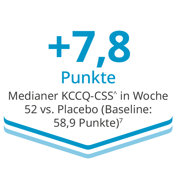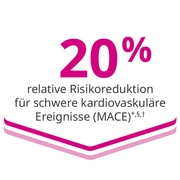 Ω Ergebnis einer Mediationsanalyse mit dem Ziel zu quantifizieren, inwieweit bestimmte Risikofaktoren Behandlungseffekte auf die Ergebnisse vermitteln können.1 * Gezeigt in der SELECT-Studie bei Patient:innen mit etablierter kardiovaskulärer Erkrankung (CVD) und Adipositas oder Übergewicht (BMI ≥ 27 kg/m2), aber ohne Typ 2 Diabetes.2,3 § Der Begriff MACE, kurz für „major adverse cardiac event“ oder auch „schweres kardiovaskuläres Ereignis“, kann verschiedene kardiovaskuläre Ereignisse beschreiben. In der SELECT-Studie wurde die MACE-Inzidenz als kumulativer, zusammengesetzter Endpunkt gemessen: als die Zeit von der Randomisierung bis zum ersten Auftreten eines CV-bedingten Todes, nicht-letalen MIs oder nicht-letalen Schlaganfalls.3–5 † Die kumulative MACE-Inzidenz wurde mittels Aalen-Johansen-Methode errechnet. Die HR wurde anhand eines Cox-Proportional-Hazard-Modells geschätzt. Der Anteil der Teilnehmer:innen mit MACE betrug 6,5 % unter Semaglutid 2,4 mg + SoC und 8,0 % unter Placebo + SoC.3 ** Gezeigt in der STEP-HFpEF-Studie bei Patient:innen mit Herzinsuffizienz mit erhaltener Ejektionsfraktion (HFpEF) und Adipositas (BMI ≥ 30 kg/m2), aber ohne Typ 2 Diabetes.7 ^ Der Kansas City Cardiomyopathy Questionnaire (KCCQ) ist ein standardisierter, aus 23 Items aufgebauter Fragebogen, der insgesamt sechs Domänen des Lebens von Menschen mit Herzerkrankungen abdeckt.8 Der Clinical Summary Score (KCCQ-CSS) setzt sich aus den Domänen „Körperliche Einschränkung“ und „Symptome“ zusammen. Die Rohwerte der Domänen werden auf eine Skala von 0 bis 100 transformiert, hohe Punktzahlen stehen für einen besseren Gesundheitszustand.9,10 Körperliche Einschränkung: Grad der Beeinträchtigung von Aktivitäten des täglichen Lebens: Sich ankleiden · Duschen/Baden · 1 Runde um den Block gehen · Haus-/Gartenarbeit, Einkäufe · Treppensteigen · Laufen (z. B. zum Bus rennen). Symptome: Häufigkeit und Schwere der folgenden Symptome: Knöchelschwellung · Ermüdung · Atemnot · Notwendigkeit, mit erhöhtem Oberkörper zu schlafen. ◊ Wegovy® (Semaglutid 2,4 mg) wird angewendet als Ergänzung zu einer kalorienreduzierten Ernährung und verstärkter körperlicher Aktivität zur Gewichtsregulierung bei Jugendlichen ab 12 Jahren mit Adipositas und einem Körpergewicht von über 60 kg oder bei erwachsenen Patient:innen mit einem Ausgangs-BMI von ≥ 30 kg/m2 (Adipositas) oder ≥ 27 kg/m2 bis < 30 kg/m2 (Übergewicht), bei denen mindestens eine gewichtsbedingte Begleiterkrankung, wie z. B. Fehlregulation der glykämischen Kontrolle (Prädiabetes oder Diabetes mellitus Typ 2), Hypertonie, Dyslipidämie, obstruktive Schlafapnoe oder Herz-Kreislauf-Erkrankung, vorliegt.2
