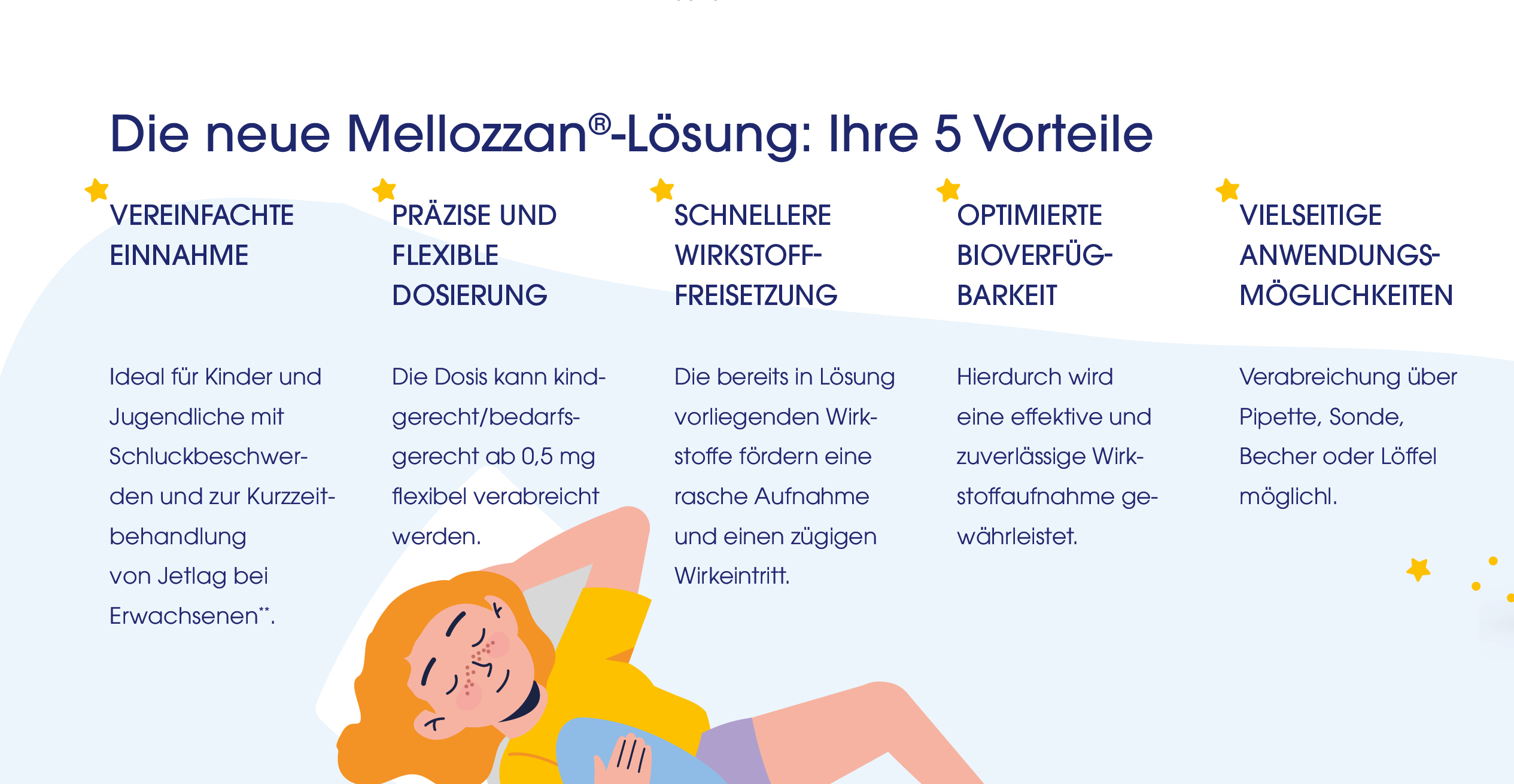 Mellozzan®-Lösung (1mg/ml) ist in der Indikation „Jetlag bei Erwachsenen“ aufgrund des Erstattungsausschlusses für Lifestyle-Arzneimittel gemäß § 34 Abs. 1 Satz 9 und Anlage II der Arzneimittel-Richtlinie nicht erstattungsfähig.