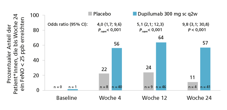 Eingeschlossen waren 109 Patient*innen im Alter von 18 bis 70 Jahren mit unkontrolliertem mittelschwerem bis schwerem Asthma# (Eosinophile im Blut ≥ 300 Zellen/µl und FeNO ≥ 25 ppb und nachgewiesener Reversibilität im Lungenfunktionstest), die entweder mit Dupilumab (Dupixent®)# 300 mg$ q2w (mit 600 mg Initialdosis, n=72) oder Placebo (n=37) behandelt wurden.1 Zu Baseline, in Woche 4 sowie in Woche 24 wurde ein CT-Scan durchgeführt.1