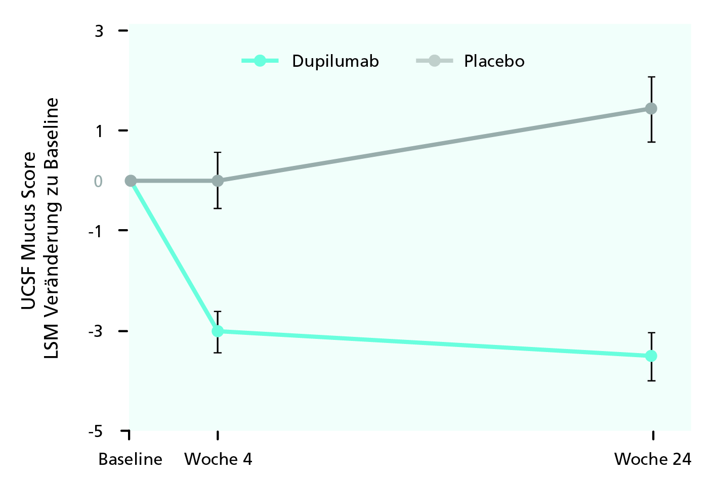 Weniger Mucus Plugs Eine erhöhte Schleimproduktion sowie strukturelle Veränderungen der Atemwege als Folge der chronischen Inflammation und erhöhte Typ-2-Biomarker kommen bei vielen Asthma-Patient*innen vor. Die vermehrten Schleimablagerungen (z.B. in Form von Mucus Plugs) sind mit einer erhöhten Symptomlast für die Patient*innen sowie Gebrauch oraler Kortikosteroide (OCS) assoziiert.2–4 In VESTIGE war die Reduktion des Mucus Plug Scores unter Dupilumab numerisch größer als unter Placebo (Abb. 1).5 Ebenso ging das Mucus-Volumen zurück. Diese Verbesserungen waren in den CT-Scans deutlich sichtbar.1,5,6