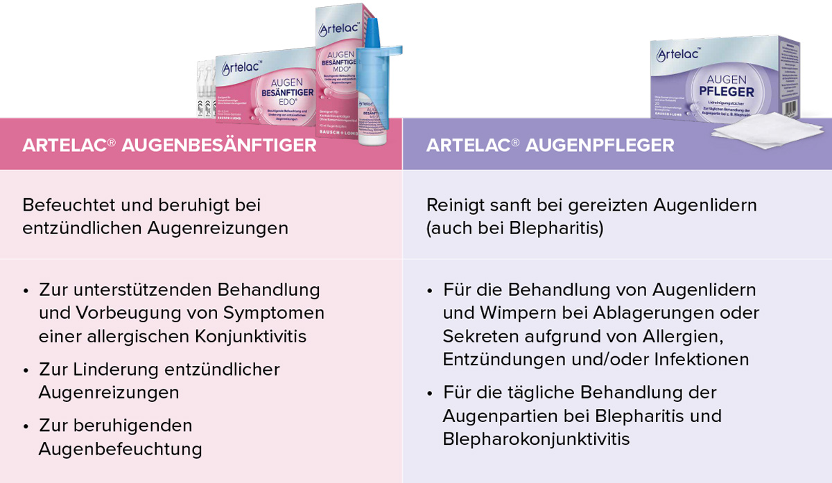 Für Patientinnen und Patienten, die unter gereizten Augenlidern oder einer Blepharitis leiden, eignet sich insbesondere Artelac® Augenpfleger gut zur sorgfältigen Reinigung und sanften Pflege der gereizten Augenpartie.