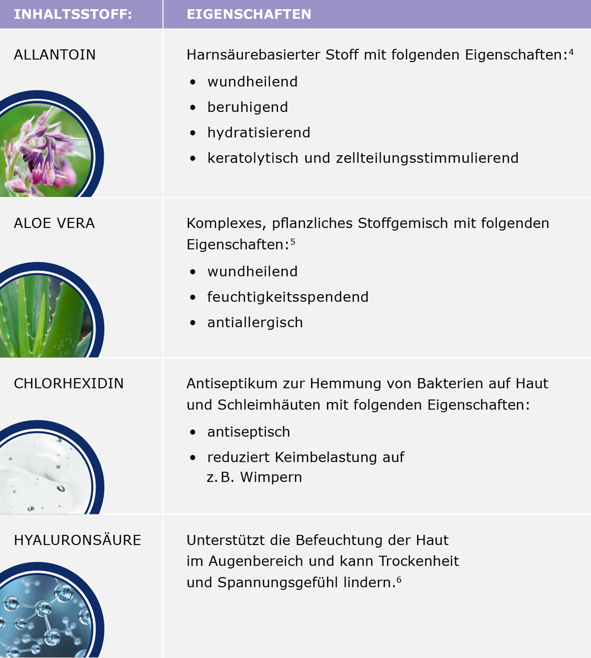 Quellen: 1. Berufsverband der Augenärzte Deutschlands e.V. (BVA), Deutsche Ophthalmologische Gesellschaft (DOG). Lidrandentzündung [Blepharitis]. 2024. 2. Jacobi C. Diagnostik und Therapie der Blepharitis/Meibomdrüsendysfunktion.21.11.2024. e.Medpedia – Springer Medizin Verlag GmbH. 3. Eberhardt M, Rammohan G. Blepharitis. 23.01.2023. StatPearls. 4. Araújo LU, et al. Acta Cir Bras. 2010;25(5):460-466. 5. Surjushe A, et al. Indian J Dermatol. 2008;53(4):163-6. 6. Guter M, Breunig M, Eur J Pharm Biopharm. 2017 Apr; 113:34-49.