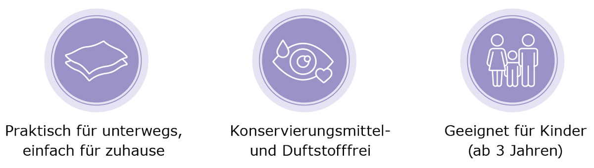 - Weiche, befeuchtete Einmaltücher – sehr gute Haut- und Augenverträglichkeit