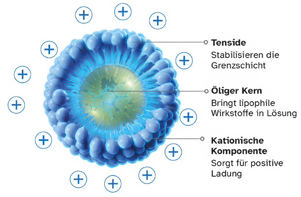 Abb. 2: Nanotropfen einer kationischen Emulsion, adaptiert nach Daull P, et al. J Pharm Pharmacol 2014;66:531–413.10 Emulgiert in der wässrigen Phase enthalten kationische Emulsionen positiv geladene Nanotropfen mit einem öligen Kern, der sehr gut zum Lösen lipophiler Wirkstoffe wie z. B. Ciclosporin A geeignet ist (Abb. 2).8,10 Elektrostatische Wechselwirkungen sorgen für eine verbesserte Verteilung der Tropfen im Tränenfilm. Sie werden von der negativ geladenen Muzinschicht des Tränenfilms und den negativ geladenen Epithelzellen angezogen.10 Dies sorgt für eine gute Verteilung und längere Verweildauer der Nanotropfen auf der Augenoberfläche.10