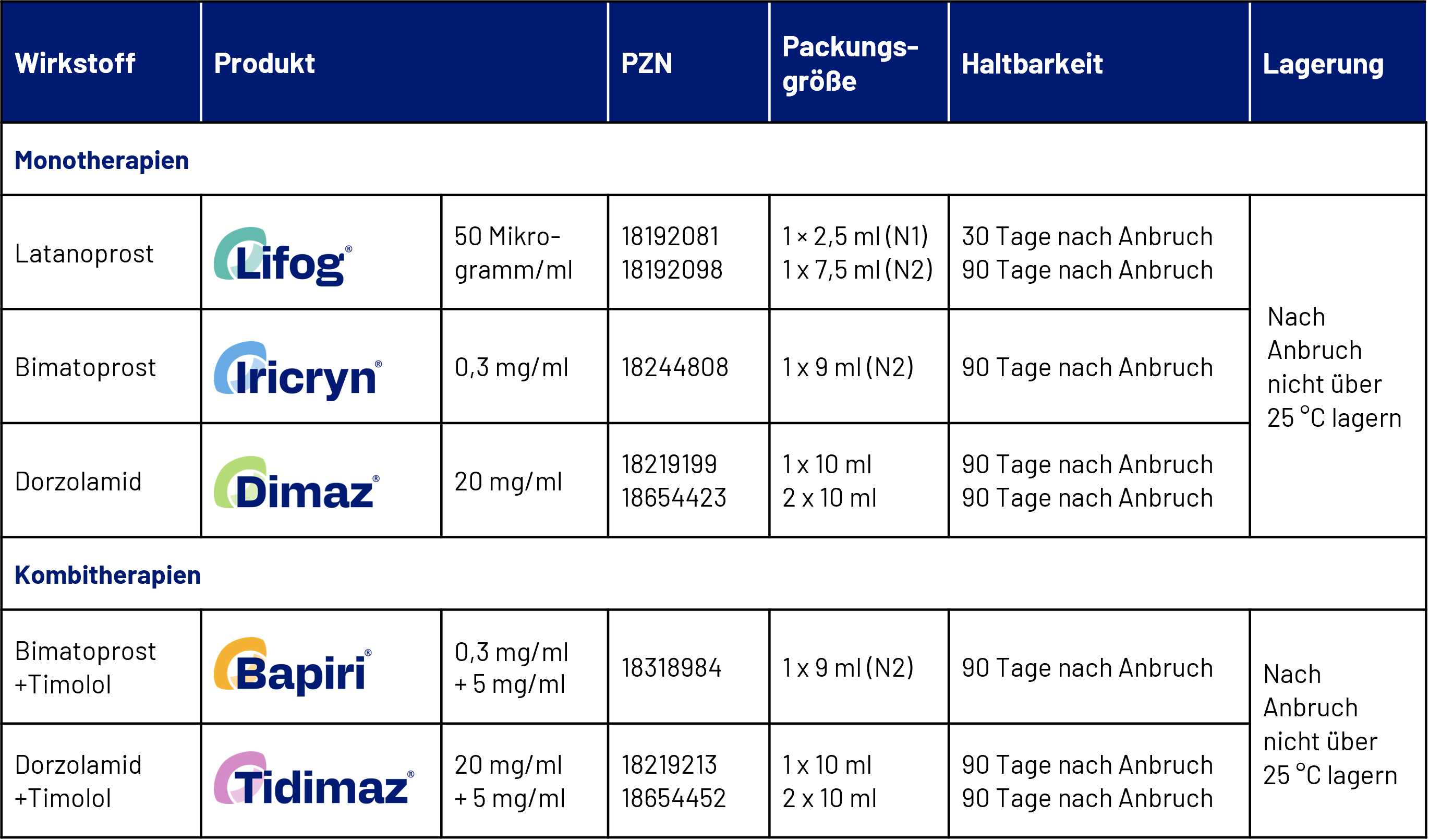 Tidimaz 20 mg/ml + 5 mg/ml Augentropfen, Lösung. Wirkstoffe: Dorzolamid, Timolol. Zusammensetzung: 1 ml Losung enth. 20 mg Dorzolamid (entspr. 22,26 mg Dorzolamidhydrochlorid) u. 5 mg Timolol (entspr. 6,83 mg Timololmaleat). Sonstige Bestandteile: Hyetellose, Mannitol, Natriumcitrat, Natriumhydroxid (zur pH-Wert-Einst.), Wasser f. Injektionszwecke. Anwendungsgebiete: Behandlung d. erhöhten Augeninnendrucks (IOD) bei Patienten m. Offenwinkelglaukom od. Pseudoexfoliationsglaukom, wenn eine Monotherapie mit einem topischen Betablocker nicht ausreicht. Gegenanzeigen: Überempfindlichkeit gegen einen od. beide Wirkstoffe od. einen d. sonst. Bestandt.; reaktive Atemwegserkrankung einschl. Bronchialasthma od. Bronchialasthma in d. Anamnese sowie schwerer chronisch obstruktiver Lungenerkrankung; Sinusbradykardie, Sinusknotensyndrom, SA-Block (Sinuatrialer Block), AV-Block (Atrioventrikulärer Block) II. od. III. Grades ohne Schrittmacher-Kontrolle, symptomatische Herzinsuffizienz, kardiogener Schock; schwere Nierenfunktionsstörung (Kreatinin-Clearance < 30 ml/min) od. hyperchlorämische Azidose. Nebenwirkungen: Sehr häufig (≥ 1/10): Brennen u. Stechen am Auge; Geschmacksirritation. Häufig (≥ 1/100, < 1/10): konjunktivale Injektion, verschwommenes Sehen, Hornhauterosion, Jucken d. Augen, Tranen; Sinusitis. Gelegentlich (≥ 1/1.000, < 1/100): Urolithiasis. Selten (≥ 1/10.000, < 1/1.000): subjektive u. objektive Symptome v. systemischen allergischen Reaktionen einschl. Angioödem, Urtikaria, Pruritus, Exanthem, Anaphylaxie; Kurzatmigkeit, respiratorische Insuffizienz, Rhinitis, selten Bronchospasmus; Kontaktdermatitis, Stevens-Johnson-Syndrom, toxische epidermale Nekrolyse (Lyell-Syndrom). NW, die bei Verwendung v. Dorzolamid u. Timolol beobachtet wurden u. auch mit Tidimaz auftreten können: Dorzolamid: Kopfschmerzen; Lidentzündung, Lidreizung; Übelkeit; Müdigkeit; Iridozyklitis; Schwindel, Parästhesie; Reizungen z. B. Rötung, Schmerzen, Krustenbildung an d. Augenlidern, transitorische Myopie (die sich nach Absetzen d. Therapie zurückbildete), Hornhautodem, okulare Hypotonie, Aderhautabhebung (nach fistulierender Operation); Epistaxis; Reizung im Rachenbereich, trockener Mund; Exanthem; Fremdkörpergefühl im Auge; Palpitationen, Tachykardie; Hypertonie; Dyspnoe. Timolol: Kopfschmerzen; subj. u. obj. Symptome v. Reizerscheinungen an d. Augen einschl. Blepharitis, Keratitis, herabgesetzte Hornhautsensibilität u. trockene Augen; Depression; Schwindel, Synkope; Sehstörungen einschl. Refraktionsänderungen (in einigen Fällen aufgr. d. Absetzens einer Miotikatherapie); Bradykardie; Dyspnoe; Übelkeit, Dyspepsie; Schwache/Müdigkeit; subjektive u. objektive Symptome v. allergischen Reaktionen einschl. Angioödem, Urtikaria, lokalisiertem u. generalisiertem Exanthem, Anaphylaxie; Schlaflosigkeit, Albtraume, Gedächtnisverlust; Parästhesien, Verstärkung d. objektiven und subjektiven Symptome einer Myasthenia gravis, Verminderung d. Libido, zerebrovaskulärer Insult, zerebrale Ischämie; Ptosis, Diplopie, Aderhautabhebung (n. fistulierender Operation); Tinnitus; Schmerzen im Brustbereich, Palpitationen, Odem, Arrhythmie, Herzinsuffizienz, Herzstillstand, Herzblock; Hypotonie, Claudicatio, Raynaud-Syndrom, kalte Hände u. Füße; Bronchospasmus (vorwiegend bei Patienten m. bereits bestehender bronchospastischer Erkrankung), respiratorische Insuffizienz, Husten; Durchfall, trockener Mund; Alopezie, psoriasiformes Exanthem od. Verschlechterung einer Psoriasis; systemischer Lupus erythematodes; Peyronie-Krankheit, Abnahme der Libido; Hypoglykämie; Halluzination; Jucken, Tranen, Rötung, Verschwommensehen, Hornhauterosion; AV-Block, Herzmuskelschwache; Geschmacksirritation, Bauchschmerzen, Erbrechen; Hautausschlag; Myalgie; sexuelle Dysfunktion. Warnhinweis: Arzneimittel für Kinder unzugänglich aufbewahren. Bitte Fach- und Gebrauchsinformation beachten. Verschreibungspflichtig. TRB Chemedica AG, 85622 Feldkirchen, DE; Stand: 06/2024