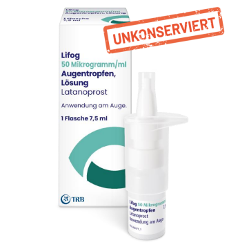 Lifog 50 Mikrogramm/ml Augentropfen, Lösung. Wirkstoff: Latanoprost. Zusammensetzung: 1 ml Lösung enthält 50 Mikrogramm Latanoprost, sowie 6,4 mg Phosphate (als Dinatriumhydrogenphosphat und Natriumdihydrogenphosphat 1 H2O); Sonstige Bestandteile: Natriumchlorid, Dinatriumhydrogenphosphat, Natriumdihydrogenphosphat 1 H2O, Polysorbat 80, Natriumedetat, Natriumhydroxid-Lösung 4 % (zur pH-Wert-Einstellung), Salzsäure, verdünnt 10 % (zur pH-Wert-Einstellung), Wasser für Injektionszwecke. Anwendungsgebiete: Zur Senkung des erhöhten Augeninnendrucks (IOD) bei Patienten mit Offenwinkelglaukom und bei okulärer Hypertension bei Erwachsenen. Zur Senkung des erhöhten IOD bei Kindern mit erhöhtem IOD und kindlichem Glaukom. Gegenanzeigen: Überempfindlichkeit gegen Latanoprost oder einen der sonstigen Bestandteile. Nebenwirkungen: Sehr häufig (≥ 1/10): Hyperpigmentierung der Iris, leichte bis mittelschwere Bindehauthyperämie, Augenreizung (Brennen, Sandigkeit, Jucken, Stechen und schwaches Fremdkörpergefühl), Veränderungen der Wimpern und Flaumhaare des Augenlids (länger, dicker, erhöhte Pigmentierung und höhere Anzahl von Wimpern). Häufig (≥ 1/100, < 1/10): meist symptomfreie, punktförmige Keratitis, Blepharitis, Schmerzgefühl im Auge, Photophobie, Konjunktivitis. Gelegentlich (≥ 1/1.000, < 1/100): Kopfschmerzen, Schwindel; Augenlidödem, trockenes Auge, Keratitis, verschwommenes Sehen, Makulaödem einschließlich zystoides Makulaödem, Uveitis; Angina pectoris, Palpitationen; Asthma, Atemnot; Übelkeit, Erbrechen; Ausschlag; Myalgie, Arthralgie; Brustschmerzen. Selten (≥ 1/10.000, < 1/1.000): Keratitis herpetica, Iritis, Hornhautödem, Hornhauterosion, periorbitales Ödem, Trichiasis, Distichiasis, Iriszyste, lokal begrenzte Hautreaktionen auf dem Augenlid, Dunkelfärbung der Lidhaut; Pseudo-Pemphigoid der Bindehaut; Verstärkung von bestehendem Asthma; Pruritus. Sehr selten (< 1/10.000): Periorbitale Veränderungen sowie Veränderungen des Augenlids, die zu einer Vertiefung des Oberlidsulkus führten; instabile Angina pectoris; Nebenwirkung berichtet mit phosphathaltigen Augentropfen: Sehr selten: Hornhautkalzifizierung bei Patienten mit ausgeprägten Hornhautdefekten. Warnhinweis: Arzneimittel für Kinder unzugänglich aufbewahren. Bitte beachten Sie außerdem die Fach- und Gebrauchsinformation. Verschreibungspflichtig. TRB Chemedica AG, Otto-Lilienthal-Ring 26, 85622 Feldkirchen, Deutschland; Stand: 09/2023