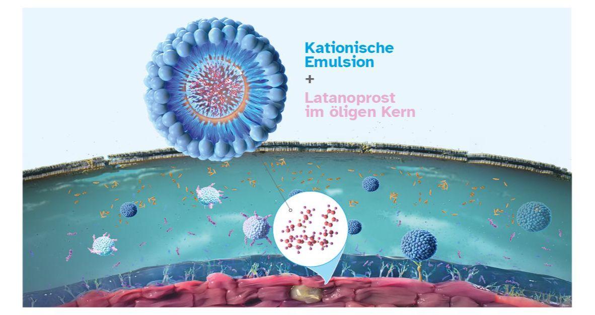 Kationische Emulsionen bieten hier einen besonderen Vorteil, da sie konservierungsmittel-freie Öl-in-Wasser-Formulierungen sind, die durch ihren öligen Kern nicht nur lipophile Wirkstoffe effizient abgeben können,5,6 sondern gleichzeitig die Funktion eines gesunden Tränenfilms nachahmen.7,8 Dadurch unterstützen sie aktiv die Stabilität des Tränenfilms und fördern die Gesundheit der Augenoberfläche.7,8 Erstmals steht nun mit Catiolanze® Emulsion konservierungsmittelfreies Latanoprost innovativ formuliert in kationischer Emulsion zur Verfügung.9,10 Diese Formulierung bietet einen zweifachen Nutzen: eine effektive IOD-Senkung und gleichzeitig eine Verbesserung der Augenoberfläche.9,11 |