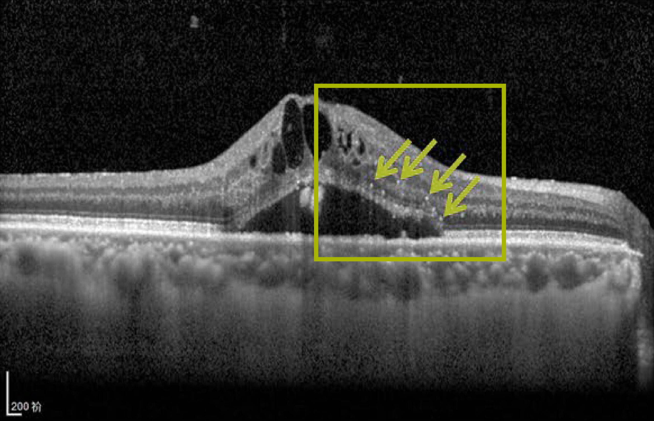 Sind auf den Bildern aus der optischen Kohärenztomographie (OCT) kleine weiße Punkte zu entdecken, können sie entscheidende Hinweise zur Krankheitsaktivität und Behandlung geben. Hyperreflektive Foci (HRF) gelten als Entzündungsmarker und scheinen ein wichtiger Prädiktor für ein gutes Ansprechen auf Steroide zu sein.1,2