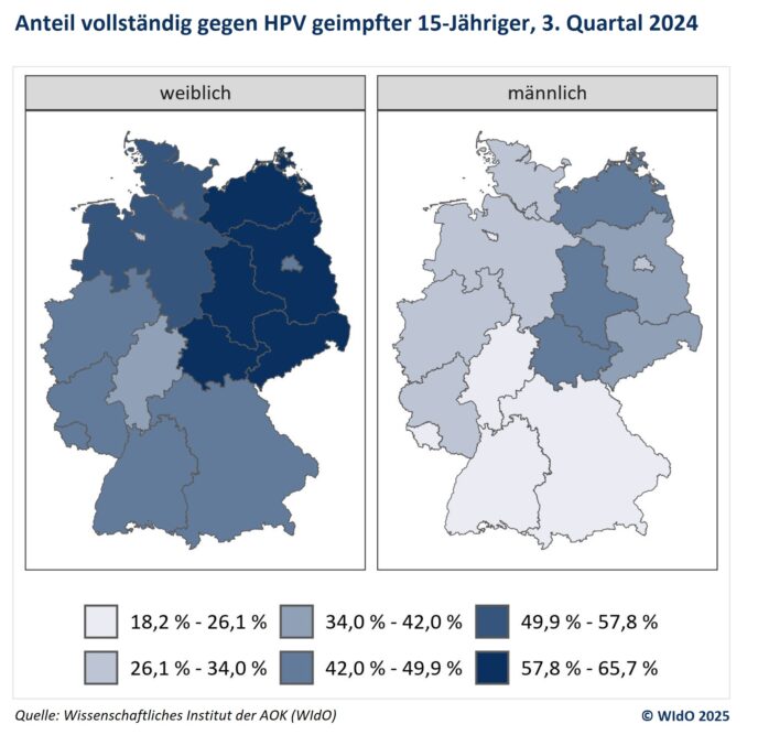 Nicht einmal jede zweite Fünfzehnjährige ist vollständig gegen HPV geimpft4. Juni 2025 Die Impfquoten gegen das Humane Papillomavirus bei 15-Jährigen in Deutschland sind weit von den WHO-Empfehlungen entfernt. (Foto: © Kt Stock – stock.adobe.com) Die Impfquoten gegen Humane Papillom-Viren (HPV) zeigen keine Fortschritte: Einer aktuellen Auswertung des Wissenschaftlichen Instituts der AOK (WIdO) zufolge lag die Impfquote bei AOK-Versicherten im dritten Quartal 2024 bei 15-jährigen Mädchen bundesweit bei nur 49,5 Prozent. Damit ist der Wert knapp einen Prozentpunkt niedriger als im dritten Quartal 2023 (50,2 %) und liegt nur leicht über dem Niveau vor der Corona-Pandemie (2019: 45,3 %). „Unsere Analysen zeigen erneut: Die Bundesrepublik ist noch sehr weit von dem erklärten Ziel der Weltgesundheitsorganisation (WHO) entfernt, nach welchem bis 2030 mindestens 90 Prozent der 15-jährigen Mädchen gegen HPV geimpft sein sollen“, erklärte WIdO-Geschäftsführer Dr. David Scheller-Kreinsen. Da die Impfung besonders dann effektiven Schutz bietet, wenn sie vor dem ersten Geschlechtsverkehr erfolgt ist, sind die Impfquoten der 15-Jährigen besonders relevant. Für einen vollständigen Schutz sind in der Gruppe der neun- bis 15-Jährigen zwei Impfungen nötig. Eine verpasste Nachholimpfung ist auf Kosten der gesetzlichen Krankenkassen aber bis zum 18. Geburtstag möglich. Scheller-Kreinsen: „Wenn man nicht nur auf die WHO-Zielmarke der 15-jährigen vollständig Geimpften schaut, sondern den Blick etwas erweitert, fallen die Zahlen etwas positiver aus. Nimmt man die ‚nur einmal‘ Geimpften hinzu, betrachtet also jene Gruppe mit begonnenen und noch nicht abgeschlossenen Impfungen, liegt die Impfrate bei den 15-Jährigen immerhin bei 61 Prozent. Hier muss darauf hingearbeitet werden, dass bis zum 18. Lebensjahr noch Impfserien abgeschlossen beziehungsweise nachgeholt werden.“ Impfniveau bei Jungen weiterhin niedrig Um Herdenimmunität in der Bevölkerung zu erreichen, wurde 2018 auch die HPV-Impfung für Jungen als Leistung der gesetzlichen Krankenkassen eingeführt. Vollständig geimpft waren im dritten Quartal 2024 der WIdO-Auswertung zufolge jedoch nur 30 Prozent der Jungen, mindestens einmal geimpft waren immerhin 40 Prozent. Entwicklung der Impfaktivität nicht ausreichend Mit 49,5 Prozent liegt die Impfquote von Mädchen um 0,7 Prozentpunkte niedriger als im Vergleich mit dem dritten Quartal 2023 (50,2 %). Er liegt damit nur leicht über dem Niveau vor der Corona-Pandemie (2019: 45,3 %). Das liegt dem WIdO zufolge daran, dass jetzt Jahrgänge 15 Jahre alt werden, die während der Pandemie deutlich weniger Impfungen erhalten haben als die Jahrgänge vor der Pandemie. „Im Gegensatz zur Impfquote bei 15-Jährigen beobachten wir bei der Anzahl der Impfungen insgesamt einen Anstieg auf das Niveau vor der Corona-Pandemie, während der es zu einem Einbruch in der Impfaktivität insgesamt gekommen ist. Diese aktuelle Entwicklung der Impfaktivität wirkt sich aber weniger auf vergangene Kohorten 15-Jähriger aus, sondern stärker auf die kommenden. Und obwohl sich die Impfaktivität wieder dem Niveau vor Corona annähert und sich auch die Impfquote entsprechend entwickeln wird, ist das nicht ausreichend, um dem WHO-Ziel deutlich näher zu kommen“, befürchtet Scheller-Kreinsen. Die Impfempfehlung für Jungen führte ab 2019 zunächst zu einem Anstieg der Impfquote. So stieg diese von 2019 bis 2024 von 3,2 Prozent auf 30 Prozent. Jedoch ist auch bei den Jungen die Impfaktivität während der Corona-Pandemie deutlich eingebrochen und erholt sich erst langsam wieder. Erhebliche Varianz zwischen den Bundesländern Die WIdO-Auswertung zeigt zudem, wie stark die Impfquoten auf Ebene der Bundesländer variieren. So waren in Bremen im dritten Quartal 2024 nur 32,9 Prozent der 15-jährigen Mädchen vollständig gegen HPV geimpft, während in Sachsen-Anhalt die Quote mit 65,7 Prozent nahezu doppelt so hoch war. Scheller-Kreinsen: „Insgesamt zeigt sich, dass die Impfquoten in den östlichen Bundesländern (ohne Berlin) mit mindestens 60 Prozent deutlich höher sind als in den westlichen. Hier liegt die Impfquote im Schnitt bei nur 47 Prozent.“ Anteil vollständig gegen HPV geimpfter 15-jähriger, 3. Quartal 2024 | Quelle: © WIdO | Wissenschaftliches Institut der AOK) Bei der Entwicklung der Impfquoten für Mädchen zwischen 2019 und 2024 unterscheiden sich die Bundesländer ebenfalls deutlich. Besonders hoch war der Rückgang der Impfquote im Saarland (-2 Prozentpunkte), während in Brandenburg ein deutlicher Anstieg verzeichnet wurde (+10 Prozentpunkte). Bei den Jungen fällt die Entwicklung der Impfquote in den Bundesländern ebenfalls sehr heterogen aus. Während die Impfquote in Sachsen-Anhalt zwischen 2019 und 2024 von sieben Prozent auf 47 Prozent stieg, hat sie im gleichen Zeitraum in Bremen nur von einem Prozent auf 18 Prozent zugenommen. Auch europäischer Vergleich zeigt Potenzial auf Im europäischen Vergleich schneidet Deutschland 2023 mit dem 19. Platz eher schlecht ab. Die vorderen Plätze mit einer vollständigen HPV-Impfung bei 15-jährigen Mädchen wurden 2023 von Island, Norwegen, Portugal, Spanien und Schweden mit einer Impfquote von 96 bis 85 Prozent erreicht. „Sowohl die Varianz in Europa wie auch innerhalb Deutschlands zeigt, dass für HPV-Impfungen als Präventionsmaßnahme noch viel Luft nach oben ist“, betont Scheller-Kreinsen.