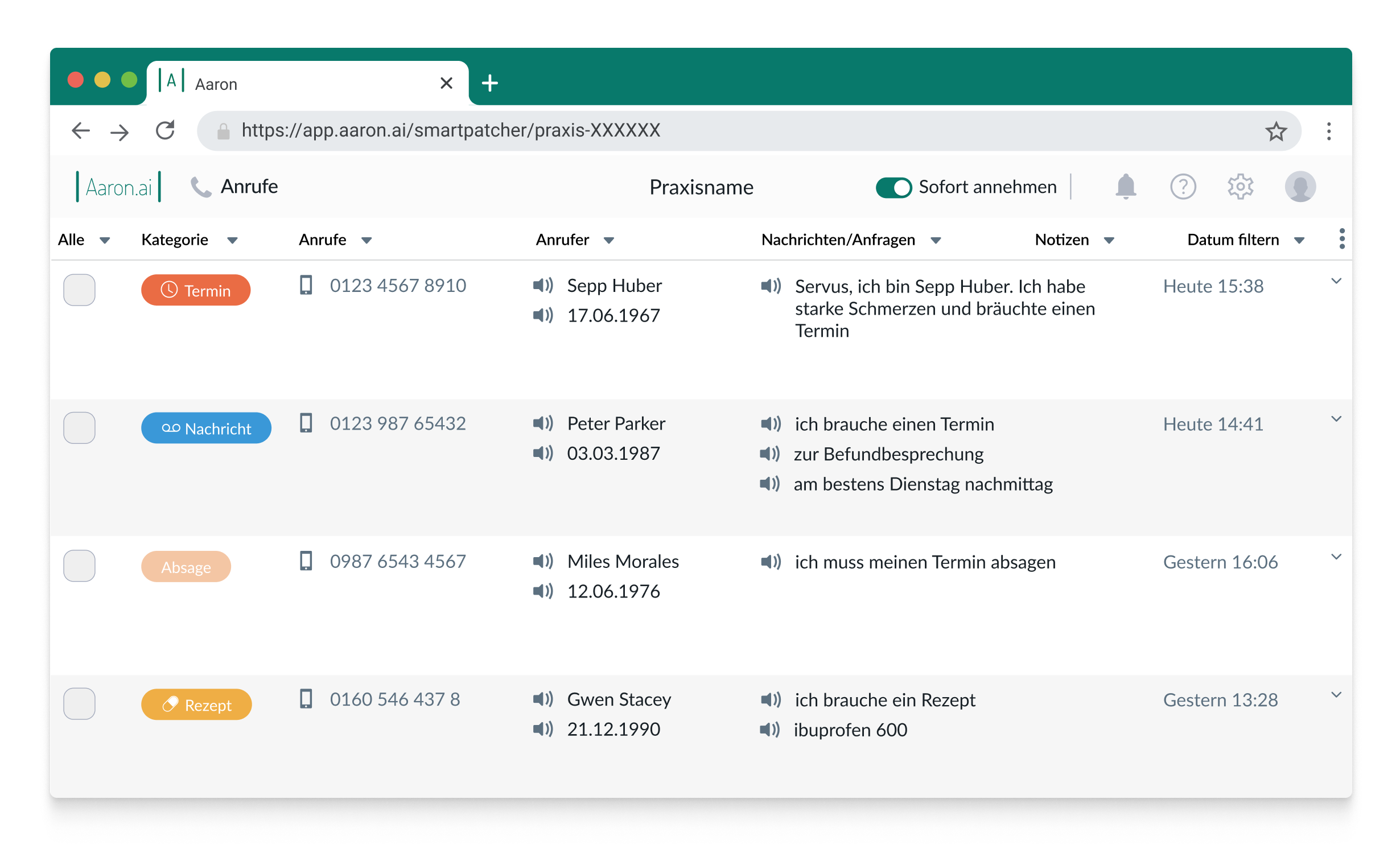 Praxistelefon entlasten – 8 Tipps vom Profi11. April 2024 Erfahren Sie hier, wie Sie Ihr Anrufaufkommen in der Praxis verringern und Ihr Team effektiv entlasten. Mit diesen 8 Profi-Tipps kehrt endlich Ruhe in der Praxis ein. Jetzt lesen! Endlich mehr Ruhe & Effizienz 8 Tipps zur Entlastung des Praxistelefons Ununterbrochenes Telefonklingeln – ein Geräusch, das in Arztpraxen leider zum Alltag gehört. Denn Mitarbeiter:innen in Arztpraxen verbringen immer noch viel zu viel Zeit am Telefon. Kaum ist das eine Patiententelefonat beendet, wartet bereits der oder die Nächste in der Leitung. In Arztpraxen, wo Zeit gleichbedeutend mit Gesundheit ist, können zu viele Anrufe zur Zerreißprobe werden. Das Praxispersonal hängt am Telefon fest und die Patienten warten in der Warteschleife… und warten. Das kommt Ihnen bekannt vor? Dann lesen Sie unbedingt weiter. In diesem Artikel stellen wir Ihnen Lösungen vor, die Ordnung ins Telefonchaos bringen und Ihren Mitarbeiter:innen Stress abnehmen. Unsere Aaron-Expertin gibt Ihnen 8 Profi-Tipps, wie Sie für Entlastung am Praxistelefon sorgen können. 1.Priorisieren Sie Anrufe nach Dringlichkeit Die systematische Priorisierung bei der Behandlung eingehender Anrufe erleichtert Ihnen den Praxisalltag erheblich. So identifizieren Sie wichtige Anfragen wie Notfälle, während weniger dringende Anliegen entsprechend eingeordnet und zu einem späteren Zeitpunkt aufgegriffen werden können. Das hilft dabei, die Arbeit des Praxisteams effektiver zu gestalten und sicherzustellen, dass Patient:innen mit akuten Problemen die Aufmerksamkeit erhalten, die sie benötigen. Legen Sie selbst fest, welche Anliegen sie niedrig priorisieren, und beispielsweise per Textnachricht beantworten. So sparen Sie sich den Rückruf. Eine solche Strukturierung trägt zu einem geordneten Ablauf bei und verringert die Zeit, die Ihre Mitarbeiter:innen am Telefon verbringen müssen. Hierbei hilft Ihnen der Digitale Telefonassistent von Aaron: Eingehende Patientenanfragen werden automatisch mit Kategorien wie “Terminanfrage” oder “Rezeptanfrage” verschlagwortet und priorisiert. So können Sie direkt einsehen, welche Anfragen die wichtigsten sind und in welcher Reihenfolge Sie sie abarbeiten müssen. Ein Notfall, erkennbar zum Beispiel an bestimmten vor eingestellten Wörtern, wird optisch hervorgehoben und eskaliert. Wie sehr die Priorisierung von Aaron den Praxisalltag und das Anrufaufkommen entspannt, bestätigt auch Dr. med. Patrick Kudielka, Allgemeinarzt in Meyen. Was seinem Team am meisten helfe, seien “die einzelnen Schlagworte. Also ob es jetzt Notfall, Termin, Rezept, Überweisung ist.” 2.Legen Sie feste Zeiten für Telefonanfragen fest In den allermeisten Arztpraxen gibt es Stoßzeiten, in denen das Telefon gar nicht mehr aufhören will zu klingeln. Wir empfehlen feste Zeiten für Telefonanfragen von Patient:innen einzurichten. Diese Zeitfenster für bestimmte Anliegen – wie Rezeptanfragen oder die Besprechung von Untersuchungsergebnissen – helfen dabei, den Arbeitsfluss zu strukturieren und die Effizienz zu steigern. Die Patient:innen wissen dann, wann sie anrufen können, um mit dem Arzt oder der Ärztin zu sprechen. Dies führt zu einer gleichmäßigeren Verteilung des Anrufaufkommens. Das Praxisteam kann sich dann in den anderen Zeiten ungestört wichtigen Aufgaben widmen. So stellen Sie sicher, dass nicht nur die Patientenkommunikation optimiert, sondern auch die Arbeitszufriedenheit im Team gefördert wird. 3.Bieten Sie Ihrem Team einen Gesprächsleitfaden an Effektives Anrufmanagement ist das A und O einer gut organisierten Praxis. Alle Mitarbeiter:innen müssen wissen, wie sie Anrufe schnell und präzise bearbeiten können. Regelmäßige Schulungen helfen, um das Personal in Kommunikationstechniken und der Praxissoftware zu trainieren. Gesprächsführungskompetenzen helfen den Patient:innen empathisch und dennoch effizient zu begegnen. Ihr Team muss wissen, wie es komplexe Terminabsprachen handhabt, auf besorgte Anrufer:innen eingeht oder auch in stressigen Situationen professionell bleibt. Ein Leitfaden, der stets bereit liegt, hilft, um Standardfragen sofort und ohne unnötige Frage-Antwort-Schleifen klären zu können. Gute Nachricht: Der Digitale Telefonassistent von Aaron ermöglicht die Erstellung vorgefertigter Standard-Antworten für verschiedene Anrufszenarien – vom Rezept über Terminanfragen bis zum Notfall. 4.Stellen Sie einen FAQ-Bereich auf Ihrer Website bereit Ein gut strukturierter FAQ-Bereich, in dem die häufigsten gestellten Fragen beantwortet werden, ist eine einfache Maßnahme mit großer Wirkung! Hier finden Patient:innen Antworten auf häufige Fragen, noch bevor sie zum Hörer greifen. Das Prinzip ist einfach: Machen Sie Informationen zu Themen wie Praxisöffnungszeiten, Wartezeiten, Urlaubszeiten oder Vorbereitungen auf bestimmte Untersuchungen leicht online auf Ihrer Homepage zugänglich. So können Sie viele Anrufe vermeiden und das Telefon sowie das Praxisteam entlasten. Eine klar gegliederte, leicht navigierbare FAQ-Seite fördert nicht nur die Selbstständigkeit der Patient:innen, sondern zeigt auch, dass Sie als Praxis kompetent und transparent kommunizieren können. Nutzen Sie Aaron für häufig gestellte Fragen: Der Begrüßungstext des Digitalen Telefonassistenten ist individuell anpassbar. Damit können Sie Ihren Patient:innen wichtige Infos auch telefonisch zur Verfügung stellen. 5. Nutzen Sie KI und Automatisierung für Ihre Praxisprozesse Künstliche Intelligenz (KI) und Automatisierung sind in der Patientenbetreuung keine Zukunftsmusik mehr. Sie sind Werkzeuge, die das Praxistelefon erheblich entlasten und bei Personalmangel effektiv unterstützen. Das hat auch Dr. Med Patrick Kudielka, Allgemeinarzt aus Mayen erkannt: “Also wir haben immer weniger Manpower im Personal. Wir haben immer höheren Bearbeitungsdruck von Seiten der Patienten und es bleibt eigentlich, wenn man logisch denkt, überhaupt gar nichts