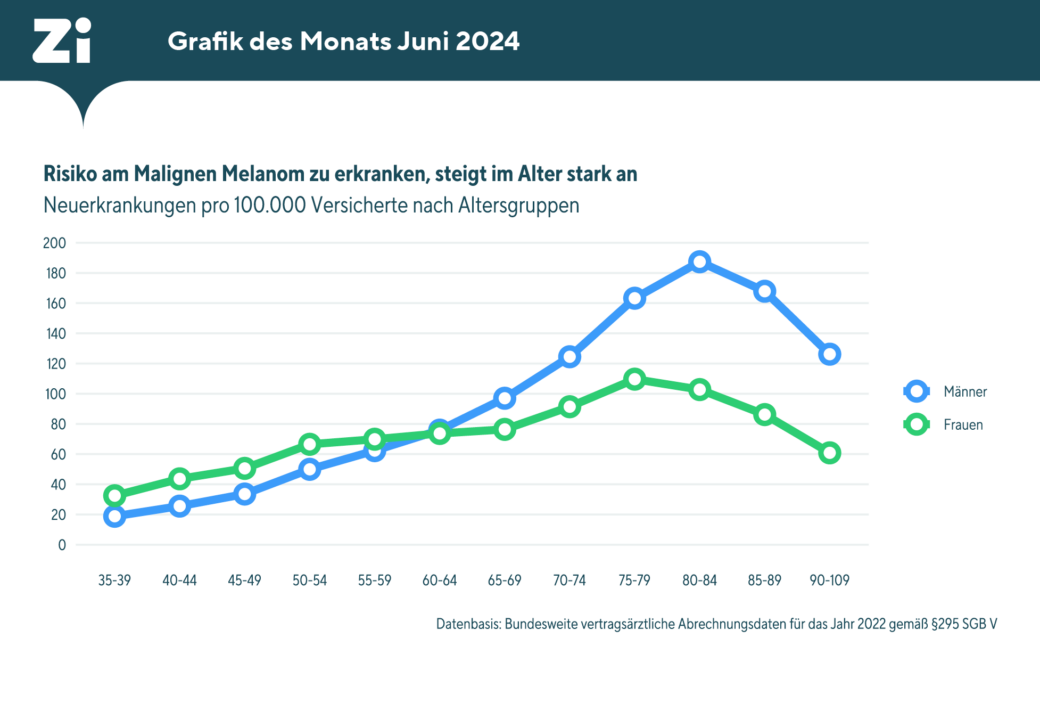 Risiko, am Malignen Melanom zu erkranken, steigt im Alter stark an16. Juli 2024 Foto: © InsideCreativeHouse – stock.adobe.com Im Jahr 2022 ist bei rund 32.000 gesetzlich Versicherten im Alter ab 35 Jahren erstmals ein Malignes Melanom vertragsärztlich dokumentiert worden. Sorgfältiger Sonnenschutz und regelmäßige Vorsorgeuntersuchungen können das Hautkrebsrisiko verringern und die Heilungschancen deutlich verbessern. In den Abrechnungsdaten der Arztpraxen im Jahr 2022 sind für Frauen im Alter ab 35 Jahren 70 Neuerkrankungen pro 100.000 Personen dokumentiert worden. Für Männer in diesem Altersbereich waren es 78 Neuerkrankungen. Männer tragen demnach ein um 10 Prozent höheres Erkrankungsrisiko. Dieser Unterschied lässt sich durch eine höhere Inzidenz bei Männern ab der Altersgruppe 65–69 Jahre aufwärts erklären. Frauen hingegen weisen in den unteren Altersgruppen eine höhere Neuerkrankungshäufigkeit auf. Das Erkrankungsrisiko nimmt aber unabhängig vom Geschlecht mit steigendem Alter kontinuierlich zu. Bei Frauen ist dies bis in die Altersgruppe 75–79 Jahre der Fall, bei Männern bis in die Altersgruppe 80–84 Jahre. Zwischen den Jahren 2015 und 2019 zeigen die vertragsärztlichen Abrechnungsdaten ein nahezu unverändertes Erkrankungsrisiko, gefolgt von einem Anstieg der Inzidenz um 4 Prozent zwischen den Jahren 2019 und 2022. Diese Zunahme ist möglicherweise auf Nachholeffekte nach der Corona-Pandemie zurückzuführen, in der das für gesetzliche Versicherte vorgesehene Hautkrebsscreening seltener in Anspruch genommen worden ist. In den kommenden Jahren wird sich zeigen, ob sich diese Zunahme der Inzidenz in den Meldedaten der Deutschen Krebsregister bestätigt. Bei vergleichbaren Alters- und Geschlechtsspezifika weisen die Daten des Krebsregisters für 2019 ein deutlich niedrigeres Inzidenzniveau aus. Die Ursachen hierfür müssen noch aufgeklärt werden. Das sind die zentralen Ergebnisse einer aktuellen Untersuchung des Zentralinstituts der kassenärztlichen Versorgung (Zi) zum Erkrankungsrisiko des Malignen Melanoms bei gesetzlich Versicherten im Jahr 2022 auf Basis einer Vollerfassung deutschlandweiter vertragsärztlicher Abrechnungsdaten. Gesetzlich Versicherte mit 2022 erstmals gesicherter Diagnose eines Malignen Melanoms pro 100.000 Personen, differenziert nach Altersgruppe und Geschlecht(© Zentralinstitut für die kassenärztliche Versorgung [Zi]) Als Studienpopulation sind gesetzlich versicherte Patientinnen und Patienten im Alter ab 35 Jahren eingeschlossen worden, die im Jahr 2022 eine Vertragsärztin bzw. einen Vertragsarzt aufgesucht und in neun Vorjahren (2013–2021) keine gesicherte Diagnose eines Malignen Melanoms (ICD-Code C43: Bösartiges Melanom der Haut) erhalten hatten. Für das Jahr 2022 ist die Patientenzahl mit erstmaliger gesicherter Diagnose eines Malignen Melanoms pro 100.000 Personen nach Altersgruppe und Geschlecht ermittelt worden. „Neben dem Schutz der eigenen Haut vor zu viel Sonneneinstrahlung können gesetzlich Versicherte ab dem 35. Lebensjahr im Rahmen der Krebsfrüherkennung alle zwei Jahre ein kostenfreies Hautkrebsscreening vornehmen lassen. Einige Krankenkassen finanzieren die Untersuchung auch bereits als Satzungsleistung für jüngere Versicherte. Bei diesem Screening wird die Haut des gesamten Körpers durch dafür speziell geschulte Ärztinnen bzw. Ärzte eingehend untersucht. Die Untersuchung hat das Ziel, Hautkrebs so früh wie möglich zu erkennen. Wenn Hautkrebs frühzeitig entdeckt wird, sind die Heilungschancen im Allgemeinen sehr hoch. Leider haben nur etwa 25 Prozent der gesetzlich Versicherten Patientinnen und Patienten 2022 oder im Vorjahr an einem solchen Hautkrebsscreening teilgenommen. Aus medizinischer Sicht wäre es wünschenswert, wenn deutlich mehr Menschen das für sie kostenfreie Screening nutzen würden. Das gilt wegen des erhöhten Erkrankungsrisikos insbesondere für ältere Menschen“, bekräftigte der Zi- Vorstandsvorsitzende Dr. Dominik von Stillfried.