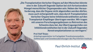 Schweine als Organspender – neue Erkenntnisse zur Prävention von Infektionen durch Retroviren21. März 2023 Bild: © Paul-Ehrlich-Institut Intensiv wird daran geforscht, die Transplantation von Organen speziell gezüchteter Schweine auf den Menschen zu ermöglichen. Im Schweinegenom befinden sich allerdings die Genome verschiedener endogener Retroviren (PERV A, B and C), die Infektionskrankheiten verursachen könnten. Ein Team des Paul-Ehrlich-Instituts hat bei der Schweinerasse Yucatan-Miniaturschwein „Haplotyp SLA D/D“ nachgewiesen, dass das Retrovirus PERV-C vermehrungsfähig und daher infektiös sein könnte. Die Identifizierung des PERV-C-Genoms ermöglicht es jetzt, durch Gen-Editierung das PERV-C-Retrovirusgenom aus dem Genom dieser Schweine zu entfernen. Aktuell stehen in Deutschland mehr als 8500 Patienten auf der Warteliste für eine Organspende. Organe für die Transplantation sind so knapp, dass PatientInnen häufig sehr lange auf ein geeignetes Organ warten müssen. Um hier Abhilfe zu schaffen, wird schon lange an der Möglichkeit geforscht, speziell gezüchtete Schweine als Organspender einzusetzen. Im vergangenen Jahr 2022 wurde in den USA die erste Transplantation eines genetisch veränderten Schweineherzens auf einen Patienten vorgenommen, für den keine anderen Therapien mehr zur Verfügung standen und der auch nicht für eine reguläre Organtransplantation in Frage kam. Nach 49 Tagen kam es zu Komplikationen und nach 60 Tagen verstarb der Patient. Die Ursachen für das Organversagen werden noch untersucht. Organtransplantation durch Tiere – Risiko durch Retroviren? Bei der Transplantation eines Organs von einem Schwein auf einen Menschen – der Xenotransplantation – besteht das Risiko, dass endogene Retroviren des Schweins – Viren, deren Genom im Genom der Spendertiere, und zwar im Genom jeder Zelle dieser Schweine, verankert sind, – in Form vermehrungsfähiger Viruspartikel auf den Empfänger bzw. die Empfängerin übertragen werden und Krankheiten hervorrufen könnten. Dies gilt insbesondere vor dem Hintergrund, dass die Betroffenen Medikamente erhalten, die das Immunsystem bremsen (Immunsuppression), um eine Organabstoßung zu verhindern. Aufgrund der Verankerung der Retrovirusgenome im Genom jeder Zelle des Schweins ist bisher eine Entfernung der Retroviren oder eine Züchtung von Spenderschweinen ohne Retrovirus-Genome nicht möglich. Die endogenen Retroviren der Schweine werden als PERV (porzine endogene Retroviren) bezeichnet. Sie sind eng verwandt mit Retroviren, die bei Mäusen, Katzen oder Gibbonaffen Leukämien und Immundefizienzerkrankungen auslösen können. Daher wird vermutet, dass PERV nach Übertragung auf den Menschen diese Krankheiten bei diesen Menschen ebenfalls auslösen könnten. Endogene Retroviren des Schweins (PERV) und ihr Übertragungsrisiko Es wurde gezeigt, dass PERV zweier Klassen, PERV-A und -B, in vitro (in Zellkulturversuchen im Labor) nicht nur Schweinezelllinien infizieren können, sondern auch in der Lage sind, Zelllinien verschiedener Spezies, einschließlich des Menschen, zu infizieren und sich dort zu vermehren. Die Retroviren sind polytrop. Damit könnten PERV-A und PERV-B Speziesbarrieren überwinden und möglicherweise nach Übertragung auch Menschen infizieren. Dagegen können Retroviren des Typs PERV-C hauptsächlich Schweinezellen, aber nicht menschliche Zellen infizieren. Allerdings ist in Laborversuchen beobachtet worden, dass PERV-C mit PERV-A rekombinieren kann, was zu PERV-A/C führte, welches menschliche Zellen infiziert. Im Vergleich zu den PERV-A und PERV-B vermehrt sich PERV-A/C in Zellkultur im Labor sogar besser. Ein Schweinestamm, der für die Organspende besonders geeignet erscheint, ist eine Züchtung des Yucatan-Miniaturschweins. Die Wildtypen (Vorfahren) dieses Schweins wurden vor 60 Jahren von Yucatan, Mexiko, zur Züchtung nach Boston, USA, gebracht. Dort wurde über einige Jahre im Hinblick auf einen Einsatz der Tiere als Organspender für die Xenotransplantation die Rasse „Haplotyp SLA D/D“ generiert. Diese Züchtung besitzt weder ein voll funktionsfähiges PERV-A-, noch ein voll funktionsfähiges PERV-B-Genom, so dass keine infektiösen oder vermehrungsfähigen Retrovirus-Partikel gebildet werden. Haplotyp SLA D/D-Schweine können aber PERV-C-Genomträger sein, bisher ging man davon aus, dass daraus entstehende PERV-C-Retroviruspartikel nicht replikationskompetent (vermehrungsfähig) und nicht infektiös sind, sofern diese Schweine nicht mit PERV-A infiziert werden. Zielgerichtete Veränderung der DNA des Schweins erscheint möglich Ein Forschungsteam des Paul-Ehrlich-Instituts unter Leitung von Prof. Dr. Ralf Tönjes, Arbeitsgruppenleiter im Fachgebiet Transfusionsmedizin, Zelltherapie und Gewebezubereitungen, hat sich mit der Frage befasst, ob nicht doch PERV-C selbst auch selbst replikationskompetent sein könnte. Bei der Charakterisierung von PERV-C aus Zellen der Schweinerasse Haplotyp SLA D/D stellten sie fest, dass diese PERV-C in vitro durchaus replikationskompetent und infektiös sind, sich also in Zellkultur vermehren können. Dies würde ein Risiko bei Transplantationen bedeuten. Die gute Nachricht ist: Da die diese PERV-C-Genome im Schweinegenom nur einmal vorkommen, wäre ein Knock-out – ein Ausschalten dieser PERV-C-Loci – durch Genom-Editierung, d.h. die zielgerichtete Veränderung der DNA des Schweins, möglich. Damit wäre bei Organen von PERV-C-Knock-out-Schweinen des Haplotyps SLA D/D Schweinen kein Risiko der Übertragung von PERV bei der Xenotransplantation gegeben. Die aktuellen Befunde liefern wertvolle Informationen auf dem Weg zu geeigneten Spendertieren für die Xenotransplantation. Das Paul-Ehrlich-Institut ist für die wissenschaftliche Beratung und die Genehmigung klinischer Prüfungen von xenogenen Arzneimitteln in Deutschland zuständig.