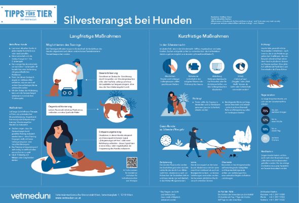 Silvester-Angst bei Hunden: Verhaltenstraining und Medikamente helfen am besten31. Dezember 2023 (Symbolbild) Foto: © Gerd Altmann – pixabay.com Mit Verhaltenstraining und angstlösenden Medikamenten gibt es gute Mittel, um Hunden den lärmigen Jahreswechsel deutlich zu erleichtern, wie eine neue Publikation der Veterinärmedizinischen Universität Wien zeigt. Die laute Silvesterknallerei rund um den Jahreswechsel ist für viele Hunde die stressigste Zeit des Jahres. Damit müssen sich HundehalterInnen jedoch nicht abfinden. In einer in der Fachzeitschrift „Animals“ erschienenen Übersichtsarbeit analysiert Stefanie Riemer von der Abteilung für Vergleichende Kognitionsforschung des Messerli Forschungsinstituts der Vetmeduni die vorhandene wissenschaftliche Literatur zum Thema Angst vor Lärm bei Hunden. Das erfreuliche zentrale Ergebnis lautet: Im besten Fall kann Geräuschangst durch vorbereitendes Training verhindert werden. Und auch für Hunde, die bereits von Lärmängsten betroffen sind, gibt es wirksame Lösungen. „Es zahlt sich wirklich aus, Geräusche positiv zu verknüpfen, etwa durch Leckerli und Spielen mit dem Hund, wenn es geknallt hat. Um Panikreaktionen oder Traumata zu verhindern, kann für einige Hunde auch der Einsatz angstlösender Medikamente sinnvoll sein“, erklärt die Verhaltensforscherin Stefanie Riemer. Verhaltenstherapie: Positive Assoziationen treten an die Stelle von Angst Langfristig sollte ein gezieltes Training ängstlichen Hunden ermöglichen, eine neue, positive Assoziation mit dem angstauslösenden Reiz zu erlernen. Zu diesem Zweck werden häufig Geräuschaufnahmen eingesetzt, anhand derer die Hunde den Umgang mit diesen akustischen Stressoren üben können. Jedoch: nicht alle Hunde reagieren auf Geräuschaufnahmen oder können das Gelernte auf echte Feuerwerke übertragen. „Ich empfehle auch im Alltag, jedes Mal, wenn ein plötzliches Geräusch auftritt, das Hunde potenziell erschrecken kann, selbst positive Emotionen zu zeigen und – wenn zur Hand – mit Futter oder Spiel gegenzukonditionieren“, so Stefanie Riemer. In ihrer Studie aus dem Jahr 2020 zeigte sich, dass das Füttern oder Spielen mit dem Hund während Feuerwerken mit einer signifikanten Verbesserung der Angst assoziiert war. Im Methodenvergleich hatte die Gegenkonditionierung, bei der auf jedes laute Geräusch eine Belohnung folgt, die höchste Erfolgsrate, gefolgt von Entspannungstraining und Training mit Geräuschaufnahmen. Kann ein Hund aufgrund der Geräuschkulisse nicht mehr fressen, deutet das auf ein hohes Stresslevel hin – hier wäre professionelle Hilfe ratsam, um einen Therapieplan aufzustellen. Bei starken Ängsten helfen beliebte freiverkäufliche Produkte wie Nahrungsergänzungsmittel, pflanzliche Heilmittel, Pheromone, Homöopathie, Bachblüten und ätherische Öle nämlich laut der aktuellen Studienlage leider meist wenig. Hingegen ist die Wirksamkeit verschiedener angstlösender Medikamente durch Studien gut belegt. Wichtig zu wissen: worauf ein Hund anspricht, ist sehr individuell – hier lohnt es sich, eine/n VerhaltensmedizinerIn zu Rate zu ziehen und die individuelle Wirkung auf das Tier bereits vor der Silvesternacht zu testen. Training am besten bereits mit Welpen beginnen Vorbeugendes Training kann die Entwicklung von Lärmangst wirksam verhindern. Das gilt übrigens nicht nur für erwachsene Hunde. „Es ist äußerst empfehlenswert, bereits im Welpenalter mit einem solchen Training zu beginnen“, betont Riemer, dass ein früher Trainingsbeginn für das Tierwohl von großem Vorteil ist. Sind laute Geräusche oder andere Überraschungen einmal positiv verknüpft, ist die Wahrscheinlichkeit, in die Angst abzurutschen, deutlich geringer, als wenn diese davor nur als „neutral“ wahrgenommen werden. Tipps fürs Tier – Stressfreier Silvesterabend mit Hund Um bei Hunden die Stressbelastung zu Silvester so gering wie möglich zu halten, eignen sich Maßnahmen für den Akutfall. Mit Entspannungstraining und Gegenkonditionierung kann man dem Jahreswechsel langfristig entgegenblicken. Illustration: © Matthias Moser/Vetmeduni