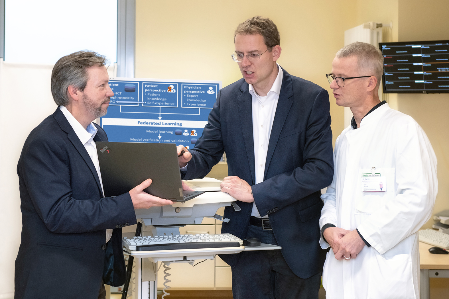 Stammzelltransplantation bei Leukämie sicherer machen: Universitätsmedizin Halle an BMBF-Projekt beteiligt21. November 2024 An der Universitätsmedizin Halle werden Transplantationen von Blutstammzellen am Landeszentrum für Zell- und Gentherapie durchgeführt. Bildquelle: ©Universitätsmedizin Halle Bei Leukämie kann eine Stammzelltransplantation lebensrettend sein, doch die Therapie führt unter Umständen zu schweren Nierenschäden. Zur Vorhersage des individuellen Risikos beteiligt sich die Universitätsmedizin Halle an einem bundesweiten Projekt, das nun gestartet ist. Stammzelltransplantationen sind mit riskanten Nebenwirkungen verbunden: In etwa sechs von sieben Fällen kommt es zu einer akuten Nierenschädigung, rund ein Drittel davon entwickelt eine chronische Nierenerkrankung. Um das Risiko einer schweren Nierenschädigung nach einer Stammzelltherapie abzuschätzen, soll ein Vorhersagemodell namens „PRETTY“ (Personalized Prediction of Transplant Toxicity) helfen. Ziel ist es, die Risikofaktoren zu verringern und dadurch die Lebensdauer und Lebensqualität der Betroffenen zu erhöhen. Das Gesamtvorhaben unter Leitung der Medizinischen Hochschule Hannover wird vom Bundesministerium für Bildung und Forschung (BMBF) für zwei Jahre mit insgesamt 1,4 Millionen Euro gefördert. „Ein Vorhersagemodell kann Therapieentscheidungen unterstützen und zur Risikominimierung beitragen. Dafür braucht es aber eine Datengrundlage von vielen Patient:innen aus mehreren großen Kliniken. In PRETTY sollen Daten aus Halle, Jena, Leipzig und Göttingen zusammenfließen, die aus Datenschutzgründen die jeweiligen Standorte jedoch nicht verlassen dürfen“, erklärt Prof. Michael Heuser, klinischer Koordinator des Projekts und Direktor der Universitätsklinik und Poliklinik für Innere Medizin IV an der Universitätsmedizin Halle. Seine Klinik ist auch am Landeszentrum für Zell- und Gentherapie und dem klinischen Transplantationsbereich beteiligt, in dem unter Leitung von Prof. Dr. Lutz P. Müller Transplantationen von Blutstammzellen durchgeführt werden. Prof. Michael Heuser (Mitte), Prof. Lutz P. Müller (rechts im Bild) und Dr. Daniel Tiller sind die Köpfe hinter PRETTY an der Universitätsmedizin Halle. Bildquelle: Universitätsmedizin Halle Dezentrales Training an vier Standorten für Datenschutz An den jeweiligen Standorten befüllen die Forschenden ein digitales Tool mit klinischen Routinedaten, das diese komplexen Rohdaten dann mittels Maschinellem Lernen datenschutzkonform zu einem eigenen Vorhersagemodell verarbeitet. „Wir integrieren das Tool in unsere IT-Infrastruktur und trainieren es ausschließlich mit den Daten unserer Klinik“, erklärt Dr. Daniel Tiller, der gemeinsam mit Jun.-Prof. Jan Christoph das im Rahmen der Medizininformatik-Initiative entstandene Datenintegrationszentrum der Universitätsmedizin Halle leitet. Neben den klinischen Daten fließen zudem die menschlichen Perspektiven des ärztlichen Personals und insbesondere der Patienten ein. Auf diese Weise soll auch der subjektiv erlebte Schweregrad der nierenschädigenden Auswirkungen erfasst werden. In einem weiteren Schritt werden die vier lokalen Modelle der beteiligten Kliniken zu einem einheitlichen, föderierten Vorhersagemodell zusammengeführt. Derzeit ist das Projekt auf bestimmte Leukämieformen wie die Akute myeloische Leukämie (AML), die Akute lymphatische Leukämie (ALL) oder das Myelodysplastische Syndrom (MDS) ausgerichtet. Langfristig könne der Ansatz des Vorhersagemodells aber auch für personalisierte Prognosen bei anderen Krebsarten genutzt werden. Am Verbundprojekt PRETTY beteiligt sind das Peter L. Reichertz Institut für Medizinische Informatik (gemeinsames Institut der Technischen Universität Braunschweig und der Medizinischen Hochschule Hannover; Koordination des Gesamtprojekts: Prof. Steffen Oeltze-Jafra), die Universitätsmedizin Göttingen, die Universitätsmedizin Halle, das Universitätsklinikum Jena, das Universitätsklinikum Leipzig und die niederländische Universität Twente.