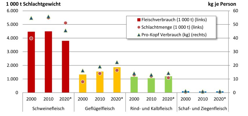 Steckbriefe zur Haltung von Nutztieren in Deutschland aktualisiert22. November 2021 Ausfuhr von Fleisch aus Deutschland nach Fleischarten in tausend Tonnen. Abb.: © Thünen-Institut. Daten-Quelle: BZL-Datenzentrum, 2021, *2020 vorläufig Neue Zahlen und Fakten zur Haltung von Schweinen, Rindern, Geflügel und Tieren aus Aquakultur in Deutschland Wie viel Tonnen Fleisch werden in Deutschland produziert? Wie sehen die Betriebsstrukturen aus, wie die Nachfrage? Umfassende Informationen dazu geben seit 2017 die Thünen-Steckbriefe zur Tierhaltung. Die Steckbriefe werden jährlich aktualisiert und berücksichtigen in der jetzt vorliegenden Fassung auch Daten bis zum Jahr 2020. Neben Schwein, Rind und Geflügel gibt es auch einen Steckbrief zur Aquakultur.Die Übersichten zeigen, dass sich Produktion, Verbrauch und Exporte in den einzelnen Tierkategorien sehr unterschiedlich entwickelt haben. Die Geflügelfleischproduktion hat sich in den vergangenen Jahren dynamisch entwickelt, die Schweineproduktion ist nach stetigem Anstieg bis 2016 zunehmend rückläufig. Allein im Jahresvergleich 2021 zu 2020 sanken die Bestände um 3,5 %. Dies dürfte auf die seit längerem katastrophale Marktsituation – insbesondere aufgrund der Afrikanischen Schweinepest und der COVID-Pandemie – zurückzuführen sein. Hinzu kommt die fehlende Planungssicherheit, vor allem im Hinblick auf die zukünftige Tierwohl- (Stichwort Borchert-Kommission) und Umweltpolitik (Stichwort TA-Luft).Die Rindfleischproduktion stagniert seit Jahren. Die gesamte Fleischproduktion in Deutschland lag 2020 bei knapp 8,5 Millionen Tonnen (inkl. Innereien sowie Schlachtnebenerzeugnissen) – etwas weniger als im Vorjahr. Hiervon entfiel der größte Teil, rund 5,1 Millionen Tonnen, auf Schweineschlachtungen, gefolgt von Geflügel- und Rinderschlachtungen. Nach wie vor ist Deutschland beim Fleisch ein Nettoexporteur, allerdings in den letzten drei Jahren mit leicht rückläufiger Tendenz. Hauptausfuhrgut war trotz der schwierigen Situation weiterhin mit großem Abstand Schweinefleisch. Schlachtmenge versus Fleischverbrauch 2000, 2010, 2020 in tausend Tonnen.Abb.: © Thünen-Institut. Daten-Quelle: BZL-Datenzentrum, 2021, *2020 vorläufig Der Pro-Kopf-Verzehr an Fleisch betrug 2019 in Deutschland 57 kg. Der Pro-Kopf-Verbrauch – darunter fallen neben der Menge für den menschlichen Verzehr auch die Nutzung in der Heimtiernahrung und die industrielle Verwertung – belief sich auf 83 kg. Beide Werte sind gegenüber dem Vorjahr zurückgegangen.Fachliche Grundlage für Diskussionen über TierhaltungDie Steckbriefe greifen bewusst nicht die vielfältigen und laufenden Diskussionen zum Thema Tierhaltung auf; sie liefern aber einen fachlichen Beitrag, um eben diese gesellschaftliche und politische Diskussion über den Status quo und die Zukunft der Nutztierhaltung in Deutschland auf einer soliden Informationsbasis führen zu können.Die Steckbriefe zur Tierhaltung und Angaben zu Märkten, Beständen, Produktion, Betriebsstrukturen, regionaler Verteilung, Handel und Wirtschaftlichkeit bietet das Thünen-Institut auf seiner Webseite an (http://www.thuenen.de). Zu finden im Themenfeld „Nutztierhaltung und Aquakultur“ im Dossier „Nutztierhaltung und Fleischproduktion“: https://www.thuenen.de/de/thema/nutztiershyhaltung-und-aquakultur/nutztierhaltun…Auf der Webseite befinden sich außerdem Kurzbeschreibungen der gängigsten Produktionsverfahren in der Tierhaltung, sowohl konventionell als auch ökologisch. https://www.thuenen.de/de/thema/nutztiershyhaltung-und-aquakultur/haltungsverfah…
