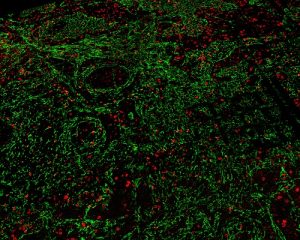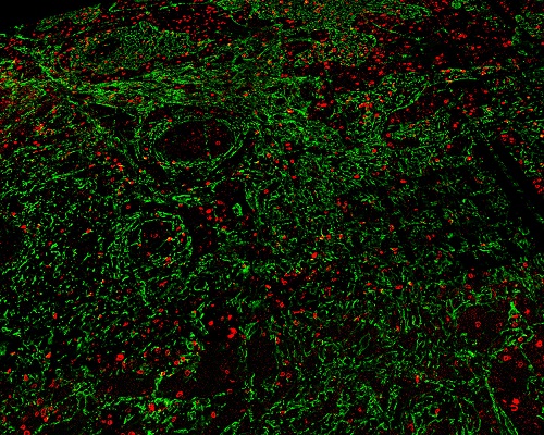 Studie untersucht Rolle des Proteins CD30 zur Früherkennung des Hodgkin-Lymphoms27. Juli 2022 Detaillierte dreidimensionale Darstellung mehrerer rot markierter CD30-positiver Lymphozyten in einem entzündeten Lymphknoten. Aktinfilamente, die das Gewebe durchziehen, sind zur Abgrenzung grün markiert. Die blaue Färbung markiert andere Zellen. Foto: ©Martin-Leo Hansmann Forschende um Prof. Martin-Leo Hansmann vom Frankfurt Institute for Advanced Studies in Frankfurt/Main und Prof. Ralf Küppers vom Universitätsklinikum Essen haben jetzt weitere Lücken bei der Aufdeckung der Entstehung des Hodgkin-Lymphoms geschlossen. Bei allen Fällen des Hodgkin-Lymphoms findet sich auf der Zelloberfläche der Krebszellen (der Hodgkin- und Reed-Sternberg-Zellen) ein Protein namens CD30 als Signalempfänger. CD30 ist ein zentraler Marker für die genaue Diagnose des Hodgkin-Lymphoms, da ansonsten nur wenige Immunzellen und andere Lymphome CD30 ausprägen. Vor ein paar Jahren wurde zudem eine Therapie entwickelt, bei der Antikörper die Tumorzellen direkt abtöten, indem sie sich an das Protein CD30 binden.“Wir fragten uns, ob ungewöhnlich große Ansammlungen von ansonsten seltenen CD30-ausgeprägten B-Lymphozyten eine Vorstufe des Hodgkin-Lymphoms darstellen können, was für das Verständnis der Lymphom-Entstehung und eventuell für eine frühzeitige Diagnose wichtig wäre”, so Hansmann und Küppers. “Wir konnten nachweisen, dass dies nicht der Fall ist”, fährt Küppers fort. Mikroskopisches Bild eines entzündeten Lymphknotens mit zahlreichen CD30-positiven Lymphozyten (in rot dargestellt). Zur Darstellung der Gewebestruktur sind Aktinfilamente grün angefärbt.Bild: ©Martin-Leo Hansmann Dafür wurden einzelne CD30-positive B-Zellen aus Gewebeschnitten ausgewählter Lymphknoten unter einem Mikroskop mit Hilfe von Laserstrahlern isoliert. Anschließend wurde aus zahlreichen Zellen der Teil des Erbgutes, der die Antikörpergene enthält, vermehrt und die Sequenz der Gene bestimmt. So konnten die Forschenden erkennen, ob die vermehrten B-Lymphozyten aus verschiedenen Vorläufern gebildet werden, oder ob sie Abkömmlinge einer einzigen Zelle sind. Letzteres ist typisch für ein Lymphom, da jedes Lymphom aus der bösartigen Entartung eines einzelnen Lymphozyten entsteht. Von den untersuchten acht Lymphknoten handelte es sich in keinem der Fälle um CD30-B-Lymphozyten eines einzigen Stammbaums. Damit gibt es keinen Hinweis darauf, dass dies Lymphom-Vorläufer-Strukturen sind. Anscheinend handelt es sich um entzündliche Reaktionen, bei denen viele B-Lymphozyten den Aktivierungsmarker CD30 ausprägen.Für die wichtige Unterscheidung eines Hodgkin-Lymphoms von einer entzündlichen Reaktion mit vielen CD30-B-Zellen fanden die Forschenden relevante Unterschiede in Bezug auf die Beziehung von reaktiven CD30-B-Zellen und Hodgkin- und Reed-Sternberg-Zellen zu anderen Zellen im Mikromilieu der Immunzellen im Gewebe. Normale CD30-B-Zellen und Hodgkin- und Reed-Sternberg-Zellen weisen unterschiedliche Präferenzen bezüglich der räumlichen Nähe zu anderen Zellen in ihrer Umgebung auf.“Als letztes interessierte uns, welche Genveränderungen, also Mutationen, an der Entstehung des Hodgkin-Lymphoms beteiligt sind”, so Hansmann. Mit weiteren Kooperationspartnern konnten Hansmann und Küppers in einem ersten Teilergebnis zeigen, dass das Gen für einen bekannten Regulator von Genaktivitäten, das BCOR-Protein, in einigen Fällen von Hodgkin-Lymphom durch Mutation seine Funktion verlor. Mit der Fortführung der umfassenden Untersuchungen zu den Genveränderungen im Hodgkin-Lymphom hoffen die Forscher, zukünftig neue Ansatzpunkte für eine zielgerichtetere Therapie dieser Krebserkrankung zu finden.