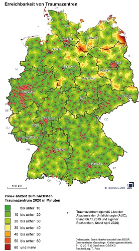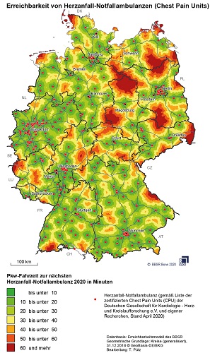 Studie zur Erreichbarkeit von Kliniken nach Notfällen30. Juli 2020 © benjaminnolte, AdobeStock Schlaganfall, Herzinfarkt, schwerer Unfall – die Wege zu einer optimalen Versorgung sind in Deutschland laut einer Untersuchung des Bundesinstituts für Bau-, Stadt- und Raumforschung (BBSR) unterschiedlich lang. Im Notfall steht eine optimale, qualitativ hochwertige Versorgung an erster Stelle. Diese Versorgungsleistung hängt von verschiedenen Faktoren ab. Der räumliche Aspekt dabei ist die schnelle Erreichbarkeit unter anderem der nächsten für die Behandlung spezialisierten Versorgungseinrichtung. Je nach Behandlungsanlass – Schlaganfall, Herzinfarkt, Unfall – und Region gelingt dies unterschiedlich. Das zeigt eine Auswertung des BBSR. Die Untersuchung bezieht sich dem Institut zufolge auf Klinikstandorte für die Versorgung ausgewählter medizinischer Indikationen, bei denen neben der Behandlungsqualität auch die schnelle Erreichbarkeit therapeutischer Maßnahmen wichtig ist. Im Folgenden die Ergebnisse für die Notfälle Schlaganfall, Herzinfarkt und Unfalltrauma. Beispiel Schlaganfall: Im April 2020 gab es in Deutschland 335 von der Deutschen Gesellschaft für Neurologie und der Deutschen Schlaganfall-Gesellschaft zertifizierte „Stroke Units“ – also auf Schlaganfälle spezialisierte Einrichtungen. Rund neun Millionen Menschen (11 % der Bevölkerung in Deutschland) leben in Regionen, in denen eine Stroke Unit mit dem Rettungsdienst nicht in 30 Minuten Fahrzeit erreichbar ist. Dies betrifft vor allem Teile der Altmark (Sachsen-Anhalt) und angrenzende Räume sowie den Raum Elbe-Elster/Anhalt-Wittenberg (Sachsen-Anhalt). Rund 400.000 Menschen leben sogar an Orten, die mehr als 60 Minuten Fahrzeit von einer derart spezialisierten Einrichtung entfernt sind. Erreichbarkeit von Schlaganfall-Notfallambulanzen (Quelle: BBSR) Beispiel Herzinfarkt: Im April 2020 gab es in Deutschland 290 durch die Deutsche Gesellschaft für Kardiologie zertifizierte „Chest Pain Units“. Sie haben sich auf Patienten mit unklaren Brustschmerzen spezialisiert und erfüllen entsprechende Notfallanforderungen. Rund 14,5 Millionen Menschen (17,5 % der Bevölkerung) leben in Regionen, von wo aus die Fahrt im Rettungsdienst zwischen einem Ereignisort und einem spezialisierten Krankenhaus länger als 30 Minuten dauert. Dies betrifft vor allem Teile der Altmark und der Mecklenburgischen Seenplatte, den Norden und Süden Brandenburgs sowie Mittelgebirgsregionen und einige Grenz- und Küstenbereiche. Fast eine Million Menschen erreichen von ihrem Wohnort selbst innerhalb von 60 Minuten Fahrzeit keine der zertifizierten Einrichtungen. Erreichbarkeit von Herzanfall-Notfallzentren (Quelle: BBSR) Beispiel Unfalltrauma: Die Akademie für Unfallchirurgie (ACU) führt eine Liste mit – Stand April 2020 – 668 Traumazentren in Deutschland. Diese Einrichtungen verteilen sich deutschlandweit so, dass bei einem Schwellenwert von 60 Minuten Fahrzeit im Rettungsdienst nahezu jeder eine solche Einrichtung erreicht. Bei einem Schwellenwert von 30 Minuten weisen jedoch auch hier einige Räume ein Versorgungsdefizit auf: Rund zwei Millionen Menschen (2,5 % der Bevölkerung) leben in den betroffenen ländlichen, dünn besiedelten Räumen, vor allem im Nordosten Deutschlands. Erreichbarkeit von Taumzentren (Quelle: BBSR) Den Schwellenwert von 30 Minuten Fahrzeit mit dem Rettungsdienst leiteten die Autoren der Analyse aus Leitlinien für die notfallmedizinische Versorgung ab, wonach die Dauer zwischen Notrufeingang in der Leitstelle und Übergabe des Patienten an ein spezialisiertes Krankenhaus maximal 60 Minuten betragen sollte. Die Ermittlung der Fahrzeiten erfolgte für Einsatzfahrten im Rettungsdienst ohne Sonderrechte. Die Analyse ist in der vom BBSR herausgegebenen Fachzeitschrift IzR (Informationen zur Raumentwicklung), Ausgabe 1/2020, erschienen. Das Heft trägt den Titel „Gesundheit und Krankheit aus räumlicher Perspektive“. Neben den Klinikstandorten mit den Qualifikationen zur Behandlung von Schlaganfall-, Herzinfarkt- und Traumapatienten geht es im IzR-Beitrag auch um Geburtskliniken, Einrichtungen der perinatalen Versorgung und Kinderkliniken. Weitere Informationen zu der Publikation auf der Webseite des BBRS.