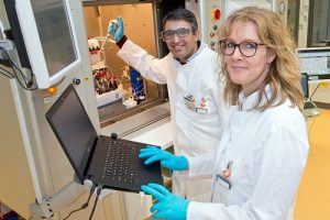 Synthese gegen die Stoppuhr6. April 2020 Dr. Masoud Sadeghzadeh und Dr. Barbara Wenzel im Syntheselabor. (Foto: © HZDR/Bodo Tiedemann Radioaktiv markierte Moleküle (Radiotracer) helfen Nuklearmedizinern beim Aufspüren und zielgenauen Bekämpfen von Tumoren. Deren Entstehung ist oft Folge krankhaft veränderter Stoffwechselprozesse. Ein Team von Wissenschaftlern des Helmholtz-Zentrums Dresden-Rossendorf (HZDR) hat nun erstmalig einen mit dem Fluor-Isotop 18F markierten Radiotracer entwickelt, der spezielle, oft in den Zellmembranen von Krebszellen auftretende Transportproteine mit Hilfe der Positronen-Emissions-Tomographie sichtbar machen kann. Die Forscher haben sich dabei für einen ungewöhnlichen radiochemischen Syntheseansatz entschieden, worüber sie in der Fachzeitschrift “Scientific Reports” berichten. Bösartige Tumore stellen beim Stoffwechsel vermehrt eine bestimmte Art von Transportproteinen bereit. Mit ihnen wird zum Beispiel das Stoffwechsel-Zwischenprodukt Laktat in bestimmte Tumorzellen eingeschleust und gleichzeitig aus anderen abtransportiert – eine Strategie, um die Apoptose, eine Form des programmierten Zelltods, zu verhindern, die bei einem gesunden Stoffwechsel zum Absterben des Tumors führen würde. „Dieser Zusammenhang wurde bei einer Vielzahl von Tumortypen beobachtet. Deshalb gelten sogenannte Monocarboxylat-Transporter hinsichtlich der Behandlung eines breiten Spektrums verschiedener Krebsarten als Schlüsselproteine, deren Manipulation zum Therapieerfolg führen kann“, erläutert Prof. Peter Brust. Der Leiter der Abteilung Neuroradiopharmaka an der HZDR-Forschungsstelle Leipzig arbeitet an aktuellen Fragestellungen der Radiopharmazie mit dem Schwerpunkt Hirnforschung. „Dazu gehört auch die synthetische Entwicklung moderner Radiotracer, denen im Kampf gegen Krebs und dabei insbesondere aggressive Hirntumoren eine besondere Stellung zukommt“, umreißt Brust die Motivation seines Teams. In molekularbiologischen und präklinischen Studien hatten Wissenschaftler bereits versucht, die Aktivität der Monocarboxylat-Transporter (MCT) durch den Einsatz von bestimmten kleinen organischen Molekülen mit ausgeprägter Hemmwirkung (etwa das sogenannte α-CHC) zu blockieren. Erste Ergebnisse zeigten, dass die Unterbrechung des Laktatflusses eine sehr effektive therapeutische Strategie gegen das Wachstum von bösartigen Tumoren sein kann. Radiopharmaka für die nicht invasive Bildgebung Neben dem therapeutischen Interesse eröffnet die Rolle der MCT im Stoffwechsel vor allem auch neue diagnostische Möglichkeiten: Sie kommen als wertvolle Biomarker bei vielen Krebserkrankungen in Frage, etwa durch Einsatz der Positronen-Emissions-Tomographie (PET). Diese Methode verwendet Radionuklide, die positiv geladene Elementarteilchen aussenden (Positronen). Dem Patienten wird zunächst ein Radiopharmakon verabreicht, ein Molekül mit einem angekoppelten radioaktiven Atom wie etwa 18F, das Positronen abstrahlt. Bei der Wechselwirkung eines Positrons mit einem Elektron im Körper wird Strahlung in Form zweier hochenergetischer Photonen in diametral entgegengesetzte Richtungen ausgesandt, die die ringförmig um den Patienten angeordneten Detektoren aufzeichnen. Aus diesem Abbild der Stoffwechselprozesse können die Ärzte auf die räumliche Verteilung des Radiopharmakons im Körperinneren und somit auf krankhafte Veränderungen schließen. Ziel: Schnelle, automatisierte Radiopharmakon-Synthese für den klinischen Alltag Trotz dieses Potentials als therapeutische Zielstruktur im Kampf gegen Krebs wurden in den vergangenen Jahren kaum radioaktiv markierte MCT-Hemmer auf ihre Eignung in diagnostischen bildgebenden Verfahren wie der PET erforscht. „Wir haben nun einen Strukturverwandten des bekannten MCT-Hemmers α-CHC entwickelt und in einem aufwendigen Verfahren erfolgreich mit dem PET-Radionuklid 18F gekoppelt. Dessen relativ kurze Halbwertszeit von 110 Minuten gewährleistet eine für den Patienten tolerable Strahlenbelastung“, beschreibt der Koordinator der Versuche, Dr. Masoud Sadeghzadeh, das Herangehen der Leipziger Chemiker. Nach ersten vielversprechenden präklinischen Untersuchungen ihrer neuen Verbindung [18F]FACH überarbeiteten die Wissenschaftler ihren Syntheseweg. „Die Herausforderung dabei ist, dass wir den Radiotracer schnell genug herstellen, um die strahlenden Eigenschaften von 18F überhaupt praktisch nutzen zu können“, fasst die Radiochemikerin Dr. Barbara Wenzel zusammen. Denn die Zeitspanne der Nutzbarkeit wird von der Halbwertszeit des Radionuklids vorgegeben. Während die Chemiker manuell zunächst noch 160 Minuten für die Herstellung des neuen Radiotracers benötigten, konnten sie diese Zeit in einem modifizierten Ansatz halbieren. „Der Clou unserer Synthese ist, dass sie ohne den Einbau einer Schutzgruppe auskommt. Dieser nun hinfällige Zwischenschritt ist üblicherweise nötig, um reaktive Teile eines Moleküls vor unbeabsichtigten Nebenreaktionen zu bewahren“, fügt Barbara Wenzel hinzu. Dadurch haben die Wissenschaftler das Verfahren erheblich vereinfacht und es für die Überführung in ein automatisiertes Synthesemodul angepasst – unabdingbare Voraussetzung für die nun geplanten Tumoruntersuchungen und eine mögliche zukünftige nuklearmedizinische Verwendung.