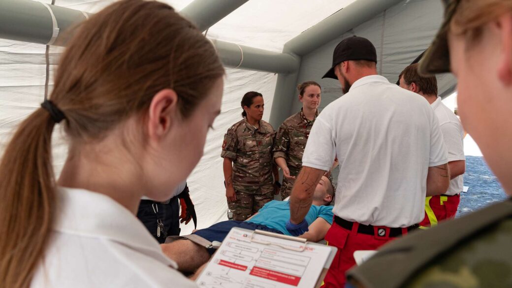 Taktische Verwundetenversorgung: Die Rolle ziviler Partner in der Rettungskette der Bundeswehr16. Juli 2025 Angriff durch Drohne: Die Kameraden leisten sofort Erste Hilfe für den Verwundeten und versuchen, ihn an einen sicheren Ort zu bringen (Bild: Unterstützungsbereich der Bundeswehr – Presse- und Informationszentrum Fotograf: Patrick Grüterich) Bei der Informations- und Lehrübung des Sanitätsdienstes der Bundeswehr 2025 in Feldkirchen wurde ein Ausschnitt aus dem Szenario der Landes- und Bündnisverteidigung und die Einbindung ziviler Rettungskräfte gezeigt. Ein Bericht des Presse- und Informationszentrums der Bundeswehr. Ein Surren, zunächst leise und kaum wahrnehmbar, wird lauter und lässt einen Pioniertrupp aufhorchen. „Vorne halt!“, befiehlt der Truppführer. Doch bevor seine Frauen und Männer die Gefahr aufklären, wirft die surrende Drohne eine Granate vom Himmel. Drei Soldaten werden verwundet. Dieses Übungsszenario, bei dem Pionierkräfte beim Verlegen einer Minensperre mit einer Drohne bekämpft werden, ist eine Lehre aus dem russischen Angriffskrieg gegen die Ukraine. Die ständige Bedrohung aus der Luft ist in den Einsatzszenarien des Sanitätsdienstes und damit auch in der Informationslehrübung des Sanitätsdienstes (ILÜ San) angekommen. Am Ort des Einschlags übernimmt zunächst der Ersthelfer Bravo die Versorgung der Verwundeten. In der Verwundetensammelstelle erfolgt schließlich die Abholung der Patientinnen und Patienten durch Sanitätskräfte, die hinter den Verteidigungslinien schnell erreichbar sind und die Behandlungsebene 1, eine Rettungsstation, betreiben. Schwerverwundete müssen schnell in die nächste Behandlungsebene transportiert werden. In der Behandlungsebene 2, einem Rettungszentrum, können chirurgische Eingriffe vorgenommen werden, um den Patienten oder die Patientin weiter zu stabilisieren. Doch wie geht die Versorgung weiter? Und wie funktioniert die Rettungskette unter Kriegsbedingungen? Zivile Partner erstmals integriert „Das gesamte Gesundheitssystem muss mit Blick auf Szenarien der Landesverteidigung raus aus dem Dornröschenschlaf, wir müssen uns auf ein Kriegsszenario vorzubereiten“, macht Generaloberstabsarzt Ralf Hoffmann, Befehlshaber des Zentralen Sanitätsdienstes, deutlich. Deshalb wird die Zusammenarbeit mit zivilen Partnern im Kriegsszenario der ILÜ San erstmals gezeigt und geübt. Ein ankommender Zug mit bis zu 500 verwundeten Soldatinnen und Soldaten wird entladen und auf Krankenhäuser in der Region verteilt. Zur Verteilung der Verwundeten auf zivile Krankenhäuser überprüfen Sanitäter von Rotem Kreuz, Maltesern und Johannitern deren Gesundheitszustand. (Bild: Unterstützungsbereich der Bundeswehr – Presse- und Informationszentrum, Fotograf: Patrick Grüterich) Das Bundesamt für Bevölkerungsschutz und Katastrophenhilfe (BBK) übernimmt für die eingetroffenen strategischen Verwundetentransporte per Schiene eine koordinierende Funktion bei der Verwundetenverteilung. Hilfsorganisationen wie Deutsches Rotes Kreuz, Johanniter oder Malteser führen nach Sichtung der Patientinnen und Patienten den weiteren Transport in Krankenhäuser durch. Der Kommandeur des Kommandos Gesundheitsversorgung der Bundeswehr, Generalstabsarzt Johannes Backus, skizziert den weiteren Weg, um das Gesundheitssystem fit zu machen für einen Krieg: „Die Vernetzung mit leistungsstarken und breit aufgestellten Partnern im zivilen Gesundheitssystem ist die zentrale Herausforderung bei der Versorgung von Verwundeten in der Landes- und Bündnisverteidigung.“ Zivil-militärische Zusammenarbeit wird ausgebaut Dass erste Schritte der Zivil-Militärischen Zusammenarbeit bereits gegangen sind, demonstriert die ILÜ San. Das Verteilen der Verwundeten auf zivile Kliniken funktioniert im Übungsszenario gut. Die Zusammenarbeit muss aber weiter vertieft werden. Das sieht auch der Präsident des BBK, Ralph Tieser, so: „Die Versorgung und der Transport einer großen Anzahl an Verletzten wird uns nur gelingen, wenn sich die zivile und die militärische Seite eng abstimmen. Die ILÜ San zeigt, wie wir bei der medizinischen Versorgung immer weiter zusammenrücken, um die Rettungskette krisensicherer aufzustellen.“ Generalstabsarzt Backus bringt es auf den Punkt: „Der Zivil-Militärischen Zusammenarbeit in der Gesundheitsversorgung und deren tiefgreifende Vernetzung kommt eine ganz besondere Bedeutung bei der erfolgreichen Gesamtplanung des Operationsplans Deutschland zu.“ Mit Blick auf die Notwendigkeit gemeinsamer Übungen zieht Generaloberstabsarzt Hoffmann in Feldkirchen dieses Fazit: „Die ILÜ San demonstriert, dass die Einbindung der zivilen Seite in unsere Übungen klappen kann. Den Weg werden wir weitergehen.“