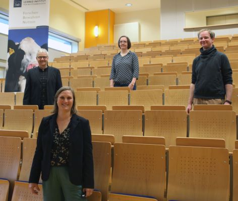Tierwohl: Institut für Nutztierbiologie Dummerstorf startet Innovationsnetzwerk für gesunde und „glückliche“ Kühe10. Mai 2021 Kuh auf der Weide – Das Projekt stellt das Wohlbefinden der Tiere in den Mittelpunkt. Foto: © FBN Förderbescheid im Rahmen der Bundesinitiative „Ställe der Zukunft“ virtuell übergeben Das Forschungsinstitut für Nutztierbiologie in Dummerstorf hat sich erfolgreich bei der Bundesanstalt für Landwirtschaft und Ernährung (BLE) für die Förderung eines Innovationsnetzwerkes im Rahmen der Nutztierstrategie des Bundesministeriums für Ernährung und Landwirtschaft beworben. Die geförderten Innovationsnetzwerke sollen Experimentierställe entwickeln, die die Grundlage für „Ställe der Zukunft“ in der praktischen Tierhaltung darstellen. Der Parlamentarische Staatssekretär Hans-Joachim Fuchtel (MdB) im Bundesministerium für Ernährung und Landwirtschaft hat den Förderbescheid in einer Videokonferenz virtuell übergeben.Grundlage ist die Richtlinie zur Förderung der Einrichtung von Innovationsnetzwerken und Experimentierställen zur Entwicklung von „Ställen der Zukunft“ für die Rinder-, Schweine- und Geflügelhaltung vom 2. Januar 2020. „Das Programm ist auf die Entwicklung in der landwirtschaftlichen Praxis realisierbarer Stallbaukonzepte und innovativer Methoden für die Rinder-, Schweine- und Geflügelhaltung ausgerichtet, die das Tierwohl verbessern und damit zur gesellschaftlichen Akzeptanz beitragen sollen“, betonte FBN-Vorstand Prof. Dr. Klaus Wimmers. „Das gibt uns Rückenwind, da wir seit vielen Jahren die Verbesserung von Tierwohl und Tiergesundheit als Forschungsschwerpunkt in den Mittelpunkt unserer Arbeit stellen. Umfassende Investitionen in neue und modernisierte Ställe für Milchkühe in den letzten Jahren haben die Haltungsbedingungen für die Tiere verbessern können, aber in der Digitalisierung, ‚Smart Farming‘ und der Entwicklung und Nutzung von Biomarkern steckt noch viel Potenzial für weitere zukünftige Verbesserungen.“Das Ziel ist der „Milchviehstalls der Zukunft“Das FBN hat den Zuschlag für den Aufbau eines Netzwerkes „Innovationen für gesunde und „glückliche“ Kühe erhalten, an dem unter der Leitung des Forschungsinstitutes für Nutztierbiologie Dummerstorf auch die Hochschule Neubrandenburg, die Tierärztliche Hochschule Hannover, die Landwirtschaftskammer Niedersachsen sowie das Landesamt für Umwelt, Landwirtschaft und Geologie in Sachsen und das Friedrich-Loeffler-Institut auf der Insel Riems beteiligt sind. Das Netzwerk unter Projektleitung der Tierärztin Dr. Lisa Bachmann verfolgt als Zielstellung unter anderem die Entwicklung von Ställen, die auf die Sinneswahrnehmung und physiologischen Bedürfnisse der Tiere ausgerichtet sind. Zudem sollen wirtschaftliche und tiergerechte Managementkonzepte zur angepassten Laktationsdauer und für den Umgang mit männlichen Milchrindkälbern bearbeitet werden. Weiterhin ist den Antragstellern die Biosicherheit von Milchviehställen und die Nutzung von Weide und Auslaufflächen ein wichtiges Anliegen. Alle Maßnahmen sollen dazu dienen, das Tierwohl zu verbessern, aber auch helfen, den Einsatz von Antibiotika zu minimieren und die tierhaltungsbedingten Emissionen zu reduzieren. Freuen sich auf den Projektstart – Dr. Lisa Bachmann (vo.), Dr. Jan Langbein (v.li.), Dr. Nina Melzer und Volker Röttgen. Foto: © FBN/Isabel Haberkorn „Die Fördersumme ist für den ersten Schritt im Rahmen der Bundesinitiative gedacht, innerhalb der nächsten sechs Monate ein innovatives Stallbaukonzept zu erarbeiten, um die beschriebenen Ziele umzusetzen“, erläuterte Dr. Lisa Bachmann. „Alle Lösungen, die von dem Innovationsnetzwerk erarbeitet werden, stellen das Wohlbefinden der Tiere in den Mittelpunkt und sollen in einem weiteren Projektantrag mit einer anschließenden Laufzeit von drei Jahren für den Bau eines ‚Milchviehstalls der Zukunft‘ als Experimentierstall in Dummerstorf münden.“Messsysteme für die Kuhgesundheit auf dem PrüfstandAußer den Kriterien zu Tierwohl, Tiergesundheit und Umweltwirkungen, die durch Forschungsergebnisse zur Verfügung stehen, sollen auch die Sinneswahrnehmung und das arttypische Verhalten von Kühen und Kälbern in die Bewertung von Maßnahmen mit einfließen. Dazu soll unter anderem die vom Landwirtschaftlichen Bildungszentrum (LBZ) Echem der Landwirtschaftskammer Niedersachsen entwickelte Virtual-Reality-Brille, die die visuelle Wahrnehmung von Kühen simuliert, genutzt werden.Auch die am FBN vorhandenen Systeme zur Erfassung von Tierverhalten und Tiergesundheit sollen in das Projekt integriert werden. Das betrifft beispielsweise Elektronische Fress-Wiegetröge zur Messung der Futter- und Wasseraufnahme, den Moo-Monitor zur Erfassung von Aktivitäten, Fress- und Liegezeiten, die Trittschallplatte zur Überwachung der Gliedmaßengesundheit sowie den Kälbertränkeautomaten für die Einzel- und Gruppenfütterung und diverse Videoaufzeichnungen für verhaltensphysiologische Untersuchungen, zur Beurteilung der Körperkondition und Geburtsüberwachung.