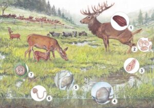Tschechien und Bayern forschen gemeinsam zu Wildtierparasit9. August 2023 Großer Amerikanischer Leberegel, adulte Form ca. 9-10 cm lang und 3-4 cm breit. Foto: © Pavla Jůnková Vymyslická, Nationalpark Sumava Der Große Amerikanische Leberegel ist ein „Zugereister”. In einem grenzüberschreitenden Forschungsprojekt war jedes fünfte untersuchte adulte Stück Rotwild im Bayerischen Teil des Projektgebiets vom ihm befallen, im Nationalpark Šumava sogar mehr als jedes vierte. So die Ergebnisse eines Forschungsprojekts der Bayerischen Landesanstalt für Wald und Forstwirtschaft (LWF) in Kooperation mit den Nationalparken Bayerischer Wald und Šumava (Tschechien) sowie dem Forstbetrieb Neureichenau der Bayerischen Staatsforsten. Das Projekt widmete sich sowohl der Frage der Verbreitung des eingeschleppten Parasiten, als auch seinen Auswirkungen auf Wildtiere im Böhmerwald-Ökosystem. Vom Großen Amerikanischen Leberegel wird vor allem Rotwild befallen, aber auch Rehe und Nutztiere könnten von einer Infektion betroffen sein. Er ist ein invasiver Parasit, der im Laufe des frühen 20. Jahrhunderts mit dem Import amerikanischer Hirsche nach Europa eingeschleppt wurde. Als Zwischenwirte für seine Entwicklung nutzt der Parasit Wasserschneckenarten. Als Endwirt parasitiert der Leberegel in Europa vor allem Rotwild, aber auch Rehe und Wildschweine und sogar Nutztiere können befallen werden.Die Infektion ruft bei den verschiedenen Wildarten unterschiedlich starke Krankheitsverläufe hervor. Der Parasit befällt die inneren Organe der Wirtstiere und der erwachsene Leberegel kann bis zu 10 cm lang werden, bei einem Durchmesser von maximal 35 mm. Bei Rotwild treten starke Krankheitssymptome eher selten auf, dagegen kann beim Reh bereits ein moderater Befall tödlich verlaufen. Menschen werden von dem Parasiten dagegen gar nicht befallen.Auf tschechischer Seite des Böhmerwald-Ökosystems war die Anwesenheit des Parasiten schon länger bekannt. Im Nationalpark Bayerischer Wald wurde der Große Amerikanische Leberegel erstmals im Herbst 2019 an einem erlegten Stück Rotwild nachgewiesen. Daraufhin wurden im Rahmen des grenzübergreifenden Forschungsprojekts seit 2021 systematisch Befallsraten von Rot-, Reh- und Schwarzwild für das Bayerisch-Böhmische Grenzgebiet erhoben.Die Untersuchung von mehr als 650 Rothirschen ergab, dass im Nationalpark Šumava die Infektionsrate bei adulten Tieren derzeit bei über 27 % liegt. Im Bayerischen Teil des Projektgebiets ist die Infektionsrate mit 20 % dagegen etwas niedriger. Kälber waren von einer Infektion nur sehr selten betroffen. Unter mehr als 150 beprobten Rehen konnte lediglich eine Infektion festgestellt werden. Von den fast 500 beprobten Wildschweinen war kein einziges Tier von dem Parasiten befallen. Lebenszyklus des Großen Amerikanischen Leberegels: 1. erw. Egel in der Leber eines Endwirts, 2. Ei, 3. Mirazidium, Entwicklung über Sporozyste zu Mutter- und Tochterredien in den Zwischenwirten 4. Alpen-Schlammschnecke oder 5. Kleine Sumpfschnecke, 6. Zerkarie, 7. Metazerkarie. (© LWF)Abb: © P. Procházka Im Rahmen des Forschungsvorhabens wurden unter Zuhilfenahme innovativer Untersuchungsansätze Grundlagendaten zur räumlichen Verteilung und zum Infektionsrisiko durch den eingeschleppten Parasiten erhoben. Berücksichtigt wurden dabei nicht nur die End- und Fehlwirte des Parasiten, sondern erstmals auch seine Zwischenwirte. Hierzu wurden zwei Wasserschneckenarten großflächig kartiert. Sie spielen für das Infektionsgeschehen eine entscheidende Rolle und ihre Verbreitung könnte sich unter klimatischen Veränderungen künftig verschieben. Zusätzlich wurde die Lebensraumnutzung der Wildtiere mit Kamerafallen beobachtet. Unter Berücksichtigung von Umweltvariablen berechneten die Wissenschaftler Raumnutzungskarten für Zwischen-, End- und Fehlwirte. Durch das Verschneiden dieser Raumnutzungskarten liegen nun wertvolle Informationen zur räumlichen Verteilung des Infektionsrisikos für die Endwirte vor.Kurz vor Projektabschluss fand im Dezember 2022 in Bayerisch Eisenstein ein umfangreicher Abschlussworkshop statt. Dabei präsentierte das Projektteam seine Forschungsergebnisse dem interessierten Fachpublikum. Knapp 60 Akteure unterschiedlicher Disziplinen nahmen an der Veranstaltung teil: Vertreter der Nationalparke, der Forstbetriebe, der Jagdbehörden und der Veterinärämter aus Tschechien und Bayern diskutierten mit den Wissenschaftlern intensiv über die vorgestellten Ergebnisse. Die Projektergebnisse unterstreichen, wie wichtig es ist, dass Nutztierbestände gründlich untersucht werden, bevor sie in Wildlebensräume ausgebracht werden. Die Bekämpfung von eingeschleppten Parasiten ist, wenn sich diese erst einmal etabliert haben, nur sehr begrenzt möglich. Zur Sprache kamen auch Managementmaßnahmen zur Eindämmung des Infektionsgeschehens, wie beispielsweise die Schließung der Rotwild-Wintergatter im Sommer. Die Gatter stellen potenzielle Infektionshotspotts dar, da infiziertes Rotwild hier über den Winter mit dem Kot konzentriert auf enger Fläche Parasiteneier ausscheidet. Die Eier können die kalte Jahreszeit überdauern. Mit steigenden Temperaturen entwickeln sich in den Eiern Parasitenlarven, die nach weiteren Entwicklungsschritten im Zwischenwirt dann wiederum Wildtiere infizieren können.Die Projektergebnisse stellen eine Momentaufnahme der derzeitigen Infektionslage dar. Da sich die Ausbreitung des Parasiten aber vermutlich in einer dynamischen Phase befindet, ist ein weiteres Monitoring des Infektionsgeschehens, insbesondere vor dem Hintergrund von sich ändernden klimatischen Voraussetzungen, die sich auf die Entwicklung des Parasiten auswirken können, unabdingbar. Nur so kann abgeschätzt werden, ob eine weitere Verbreitung des Parasiten stattfindet und ggf. die Einleitung von Gegenmaßnahmen vorgenommen werden.Das länderübergreifende Projekt wurde über die Strukturförderung der Europäischen Union im Rahmen des INTE