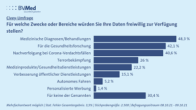 Umfrage: Knapp die Hälfte würde Daten für medizinische Zwecke frei geben27. Oktober 2021 Foto: SHAHRIL- stock.adobe.com Wenn es um die Verwendung ihrer Daten geht, sind die Menschen in Deutschland vor allen beim Thema Gesundheitsversorgung aufgeschlossen. Das ergab eine repräsentative Befragung im Auftrag des BVMed. Demnach würden 48 Prozent der Deutschen eigene Daten freiwillig für medizinische Diagnosen und Behandlungen zur Verfügung stellen, 42 Prozent für die Gesundheitsforschung sowie 41 Prozent für die Nachverfolgung bei Corona-Verdachtsfällen. „Die Menschen haben ein gutes Gespür dafür, dass beim Thema Gesundheit der Nutzen einer Datenfreigabe die Risiken weit überwiegt“, kommentiert der Geschäftsführer des Bundesverbandes Medizintechnologie Dr. Marc-Pierre Möll. Der höchste Wert außerhalb medizinischer Themen erzielt die Terrorbekämpfung: 26 Prozent der Teilnehmer:innen würden dafür ihre Daten spenden. Mit 22 Prozent liegt der Wert für „Medizinprodukte und Gesundheitsdienstleistungen“ noch deutlich höher als zur „Verbesserung öffentlicher Dienstleistungen“ (15 Prozent) oder für „Autonomes Fahren“ (5 Prozent). 30 Prozent der deutschen Bevölkerung würden dagegen grundsätzlich keine Daten zur Verfügung stellen wollen. Bei einer Auswertung der Umfrage nach Altersgruppen, wird deutlich, dass junge Menschen besonders aufgeschlossen für die freiwillige Datenverwendung sind: 35 Prozent der Deutschen im Alter zwischen 18 und 29 würden Ihre Daten zur Verfügung stellen. Bei den über 65-Jährigen liegt der Anteil bei 25 Prozent. Der BVMed spricht sich seit Längerem für einen besseren Zugang der MedTech-Unternehmen zu Gesundheitsforschungsdaten aus – damit die Digitalisierung künftig die Gesundheitsversorgung der Menschen revolutionieren und verbessern kann. Denn: Rund 70 Prozent der Forschung zu Medizininnovationen findet in Deutschland in den Unternehmen der Gesundheitswirtschaft statt. Forschenden Gesundheitsunternehmen muss deshalb das Antragsrecht auf die Nutzung von Daten aus dem Forschungsdatenzentrum ermöglicht werden, so der BVMed. „Alle Beteiligten sollten den gleichen geregelten Zugang zu Gesundheitsdaten erhalten, damit ein fairer Wettbewerb stattfinden kann“, heißt es in einem entsprechenden Positionspapier des deutschen MedTech-Verbandes. Zur Umfrage: Das Meinungsforschungsunternehmen Civey hat im Auftrag von BVMed – Bundesverband Medizintechnologie 2500 Personen zwischen dem 8. und 9. Oktober 2021 befragt. Die Ergebnisse sind repräsentativ für die Einwohner der BRD ab 18 Jahren. Der statistische Fehler der Gesamtergebnisse liegt bei 3,5 Prozent.