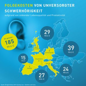 Unversorgte Hörminderung kostet die EU 185 Milliarden Euro pro Jahr27. Februar 2019 Foto: Bundesverband der Hörgeräte-Industrie 34,4 Millionen Menschen in der EU haben eine beeinträchtigende Hörminderung (≥35 dB) – rund zwei Drittel davon sind noch nicht mit Hörgeräten versorgt. Die Aktionswoche zum Welttag des Hörens 2019 am 3. März unter dem Motto „Check your hearing“ rückt das Thema in den Fokus. Die aktuelle Studie „Hearing Loss – Numbers and Costs“ von Prof. em. Bridget Shield, Brunel University London, beziffert die volkswirtschaftlichen Folgekosten unversorgter Hörminderung in Europa. Das Ergebnis für die EU: 185 Milliarden Euro – pro Jahr. Ursachen sind die eingeschränkte Lebensqualität und daraus resultierende Kosten für die Gesundheitssysteme in Höhe von 130 Milliarden Euro sowie Produktivitätsverluste in Höhe von 55 Milliarden Euro. Abbildung: Bundesverband der Hörgeräte-Industrie Die Zahlen für Deutschland sind gleichfalls beeindruckend: Von 5,8 Millionen Menschen (über 15 Jahre) mit einer beeinträchtigenden Hörminderung tragen lediglich 2 Millionen Hörgeräte. Die jährlichen Kosten des Versorgungsdefizits aufgrund von Produktivitätsverlusten bei betroffenen Personen im Erwerbsalter und gesunkener Lebensqualität belaufen sich auf 39 Milliarden Euro. Pro Person mit unversorgtem Hörverlust sind das 10.300 Euro jährlich. Die 2019 veröffentlichte Studie knüpft an die erste Untersuchung von Prof. em Shield aus dem Jahr 2006 an und bestätigt den Befund, dass unversorgte Hörschäden nicht nur immense Folgen für die Volkswirtschaft haben, sondern auch für die Gesundheit und das individuelle Wohlbefinden. „Unversorgte Schwerhörigkeit belastet nicht nur die soziale Kommunikation, sondern erhöht auch das Risiko schwerwiegender Folgeerkrankungen wie Depression oder Demenz,“ erläutert Dr. Stefan Zimmer, Vorstandsvorsitzender des Bundesverbandes der Hörgeräte-Industrie (BVHI). Berufliche Nachteile für hörgeminderte Menschen Die Studie „Hearing Loss – Numbers and Costs“ kommt weiterhin zu dem Ergebnis, dass Menschen mit einer unversorgten Schwerhörigkeit eher in Berufen mit niedrigerem Anforderungsprofil arbeiten, als (Hör-)Gesunde oder mit Hörsystemen versorgte Arbeitnehmer. Zudem arbeiten jene häufiger in Teilzeit oder sind in Frührente. Gründe für berufliche Nachteile durch eine Hörschwäche sind sowohl funktional als auch persönlich. So haben es Menschen mit einer Hörminderung etwa in Besprechungen oder Telefonkonferenzen deutlich schwerer als ihre Kollegen. Das Pausengespräch in der Kantine ist anstrengend, wenn nicht gar unmöglich. Einen Arbeitstag mit eingeschränktem Gehör zu überstehen ist ermüdend – körperlich und mental. Schwerhörigkeit verursacht Erschöpfung und Schlafmangel 62 Prozent der schwerhörigen Europäer ohne Hörgeräte fühlen sich nach der Arbeit körperlich erschöpft – unter den Hörgeräteträgern sind es lediglich 39 Prozent. Zu diesem Ergebnis kommt die EuroTrak Studie Deutschland 2018 und ergänzt damit die Befunde von Prof. em. Shield. Die EuroTrak-Studie erhebt Häufigkeit und Folgen selbsteingeschätzter Schwerhörigkeit im europäischen Vergleich. So empfinden 52 Prozent der unversorgten Schwerhörigen nach Feierabend neben körperlicher Erschöpfung auch mentale Ermüdung – gegenüber 31 Prozent der Hörgeräteträger. Dass der Grund hierfür nicht allein in der Arbeit liegt, zeigen die Angaben zur Schlafqualität: 65 Prozent der Hörgeräteträger sind mit ihrer Nachtruhe zufrieden, hingegen nur 43 Prozent der unversorgten Schwerhörigen. „Die Versorgung mit Hörsystemen hilft nicht nur, akustisch wieder mit dem beruflichen und privaten Umfeld in Verbindung zu treten, sondern fördert insgesamt Gesundheit und Wohlbefinden“, sagt Dr. Stefan Zimmer. Welttag des Hörens 2019 – Check your hearing! „Die jüngeren Studienergebnisse belegen eindrucksvoll sowohl die hohe individuelle, gesundheitliche als auch die gesamtgesellschaftliche und volkswirtschaftliche Relevanz der Hörgeräteversorgung. Regelmäßige Hörtests und die frühzeitige Konsultation durch HNO-Ärzte und Hörakustiker sind besonders wichtig. Darauf wollen wir gemeinsam mit unseren Partnern zum Welttag des Hörens in Deutschland, Österreich und in der Schweiz aufmerksam machen“, führt Dr. Stefan Zimmer weiter aus. Der Welttag des Hörens 2019 steht unter dem Motto „Check your Hearing – Überprüfe dein Gehör“. Damit macht der BVHI gemeinsam mit der WHO auf die Bedeutung eines guten Gehörs sowie auf Möglichkeiten seiner Erhaltung und bestmöglichen Versorgung aufmerksam. Unterstützt wird der Aktionstag bundesweit von Hörakustikern und HNO-Ärzten. Schirmherr der deutschen Kampagne ist der Bundesminister für Gesundheit, Jens Spahn. Die Hörakustikerverbände in Österreich und in der Schweiz beteiligen sich erstmals an der deutschsprachigen Kampagne. Wachsende Sichtbarkeit in der Gesellschaft Da der Welttag 2019 auf einen Sonntag fällt, verteilen sich die meisten Aktionen auf die Woche vor und nach dem 3. März. „In den vergangenen Jahren haben weltweit immer mehr Partner und Länder die Kampagne zum Schutz des Gehörs und zur Versorgung einer Hörminderung im Rahmen des Welttages begleitet. Allein in Deutschland erreichte der Welttag des Hörens 2018 knapp 26 Millionen Menschen“, freut sich Dr. Shelly Chadha, Leiterin des Programms zur Prävention von Taubheit und Hörverlust bei der WHO. Über die Studie „Hearing Loss – Numbers and Costs” Die Studie „Hearing Loss – Numbers and Costs” wurde von Prof. em. Bridget Shield mit Unterstützung von Prof. Mark Atherton, Brunel Universität London erstellt. Im Jahr 2006 verfasste Prof. em. Bridget Shield den ersten Bericht zu diesem Thema unter dem Titel „Evaluation of the Social and Economic Costs of Hearing Impairment“. Die Kosten durch geringere Lebensqualität errechnen sich aus der Anzahl der Schwerhörigen aufge