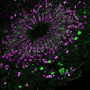 Veränderte Hirnstruktur: Warum Infektionen in der Schwangerschaft Autismus begünstigen können16. März 2023 Erstautorin Kseniia Sarieva (l.) und Dr. Simone Mayer (Fotos: Theresa Kagermeier, HIH /Beate Armbruster, HIH) Tübinger Forscherinnen entwickeln ein dreidimensionales Hirngewebemodell, um in der Petrischale Umwelteinflüsse auf die embyronale Hirnentwicklung zu untersuchen. Bereits im Mutterleib beeinflussen Umweltfaktoren die Entwicklung des Kindes und können Auswirkungen auf die Gesundheit haben. So erhöhen bestimmte Infektionen das Risiko, später an einer Autismus-Spektrum-Störung zu erkranken. Ein Forschungsteam um Dr. Simone Mayer vom Hertie-Institut für klinische Hirnforschung (HIH) und der Universität Tübingen hat nun einen molekularen Mechanismus dieses Zusammenhangs entschlüsselt: Schüttet das Immunsystem der werdenden Mutter einen bestimmten Botenstoff aus, so verändere das Großhirn des Ungeborenen seinen Aufbau, berichten die Forschenden in “Molecular Psychiatry”. Für die Studie hat das Team ein Hirnorganoid entwickelt, dass die Großhirnrinde des Menschen nachahmt. „Epidemiologische Studien deuten seit längerem darauf hin, dass Infektionen während der Schwangerschaft mit einem leicht erhöhten Risiko bei Kleinkindern einhergehen, an einer Autismus-Spektrums-Störung zu erkranken“, erklärt Studienleiterin Mayer. Bei Mäusen sei festgestellt worden, dass Botenstoffe des Immunsystems die embryonale Gehirnstruktur beeinflussen könnten. „Offen war bisher, ob die gleichen molekularen Mechanismen auch beim Menschen zum Tragen kommen.“ Ein Hirnorganoid unter dem Mikroskop. Neuronale Stammzellen leuchten magentafarben. Die grüne Farbe zeigt Zellaktivität nach erhöhtem Kontakt mit dem Botenstoff Interleukin 6 an.(Quelle: Kseniia Sarieva/HIH) Um dies zu untersuchen, hat die Neurobiologin mit ihrem Team im Labor aus Stammzellen kleine Hirnorganoide gezüchtet, die der menschlichen Großhirnrinde ähneln. Während ihrer Entwicklung setzten die Wissenschaftlerinnen sie gezielt einer erhöhten Menge des Immun-Botenstoffes Interleukin 6 aus. Dieser wird bei Infektionen von der Mutter und der Plazenta ausgeschüttet. „In epidemiologischen Studien wurde eine erhöhte Interleukin-6-Konzentrationen während der Schwangerschaft mit Veränderungen der Hirnanatomie und kognitiven Leistungen im Säuglingsalter in Verbindung gebracht“, berichtet Erstautorin Kseniia Sarieva. Bei den menschlichen Hirnorganoiden zeigte sich nun ein ähnliches Bild: „Wir beobachteten anhaltende Veränderungen im Gewebe“, so Sarieva. „Bestimmte Gene waren mehr oder weniger aktiv als unter normalen Bedingungen. Ebenfalls traten manche Zelltypen häufiger auf als sonst, selbst über einen Monat nach Ende der simulierten Infektion.“ Ob diese Veränderungen auch noch nach mehreren Monaten bestehen bleiben, sei allerdings noch nicht bekannt. Erhöhte Werte des Immun-Botenstoffes Interleukin 6 scheinen damit direkte Auswirkungen auf die Architektur der kindlichen Großhirnrinde zu haben und auf diese Weise eine spätere Erkrankung zu begünstigen. Interleukin 6 tritt als Signalsubstanz des Immunsystems bei allen Entzündungsreaktionen auf. Neben viralen und bakteriellen Infektionen können das auch Autoimmunkrankheiten sein. Tatsächlich scheint auch Diabetes mit einem leicht erhöhten Risiko einer Autismus-Spektrum-Störung des Kindes zusammenzuhängen. Mit der Herstellung ihres Hirnorganoidmodells ist dem Forschungsteam eigenen Angaben zufolge ein entscheidender Fortschritt gelungen. Künftig können sie mit ihrem Ansatz solche und auch andere Umwelteinflüsse auf die Gehirnentwicklung im Mutterleib untersuchen. „Mit einem besseren Verständnis der Mechanismen helfen unsere Studien vielleicht in Zukunft, negative Umwelteinflüsse während der Schwangerschaft entgegenwirken zu können,“ hofft Mayer, die Kollegiatin der Heidelberger Akademie der Wissenschaften ist. Schwangere Frauen sollten sich unbedingt bewusst machen, dass das Risiko wirklich nur gering erhöht sei und auch von der Art und Zeitpunkt des Infektes abhänge. „Eine Infektion hat man nicht in der Hand. Das Beste, was man für ein gut funktionierendes Immunsystem tun kann, ist, Stress zu vermeiden – und guter Hoffnung zu bleiben.“